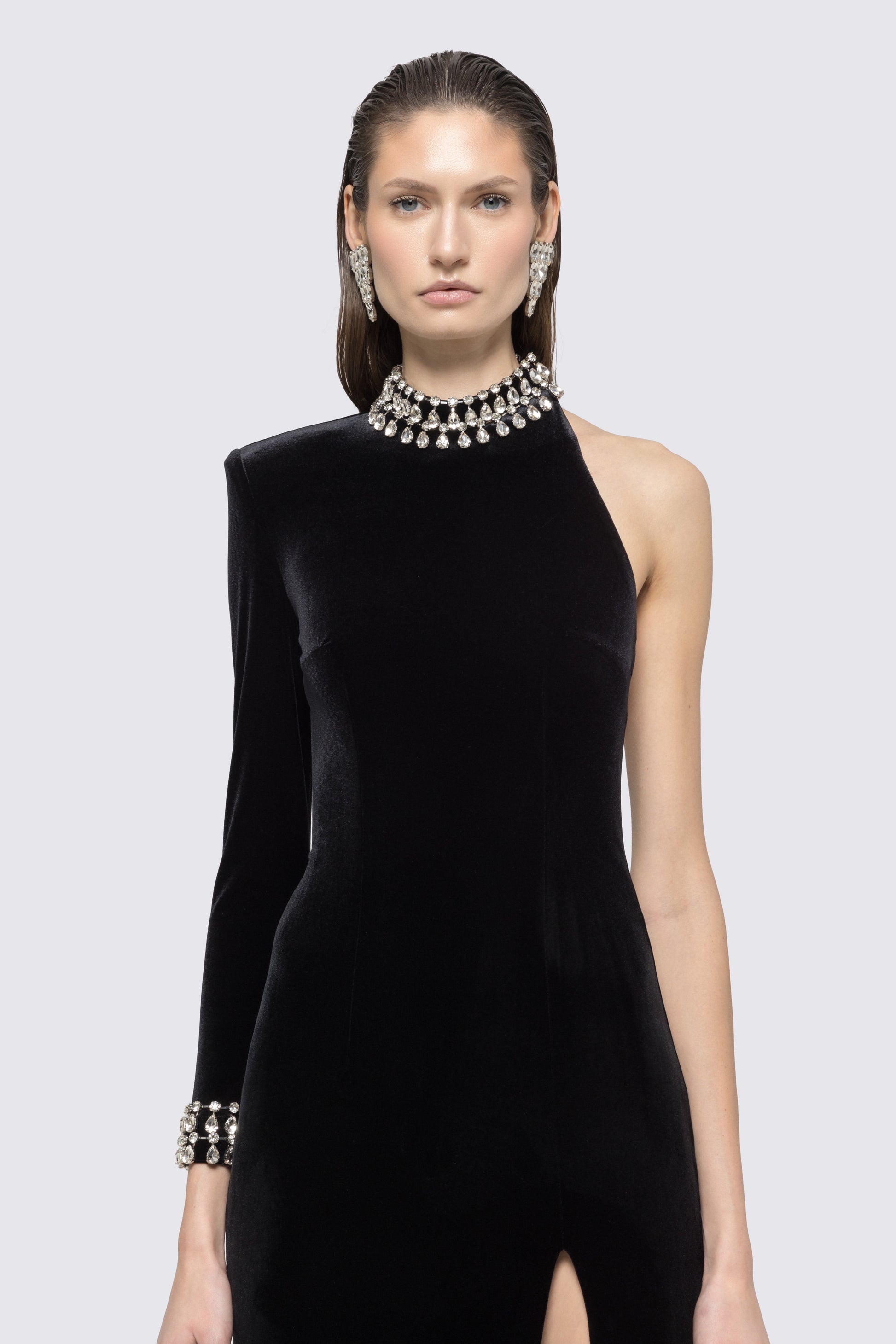 A show-stopping velvet maxi dress featuring a striking open back. The luxurious fabric and sleek silhouette make it an unforgettable evening look.