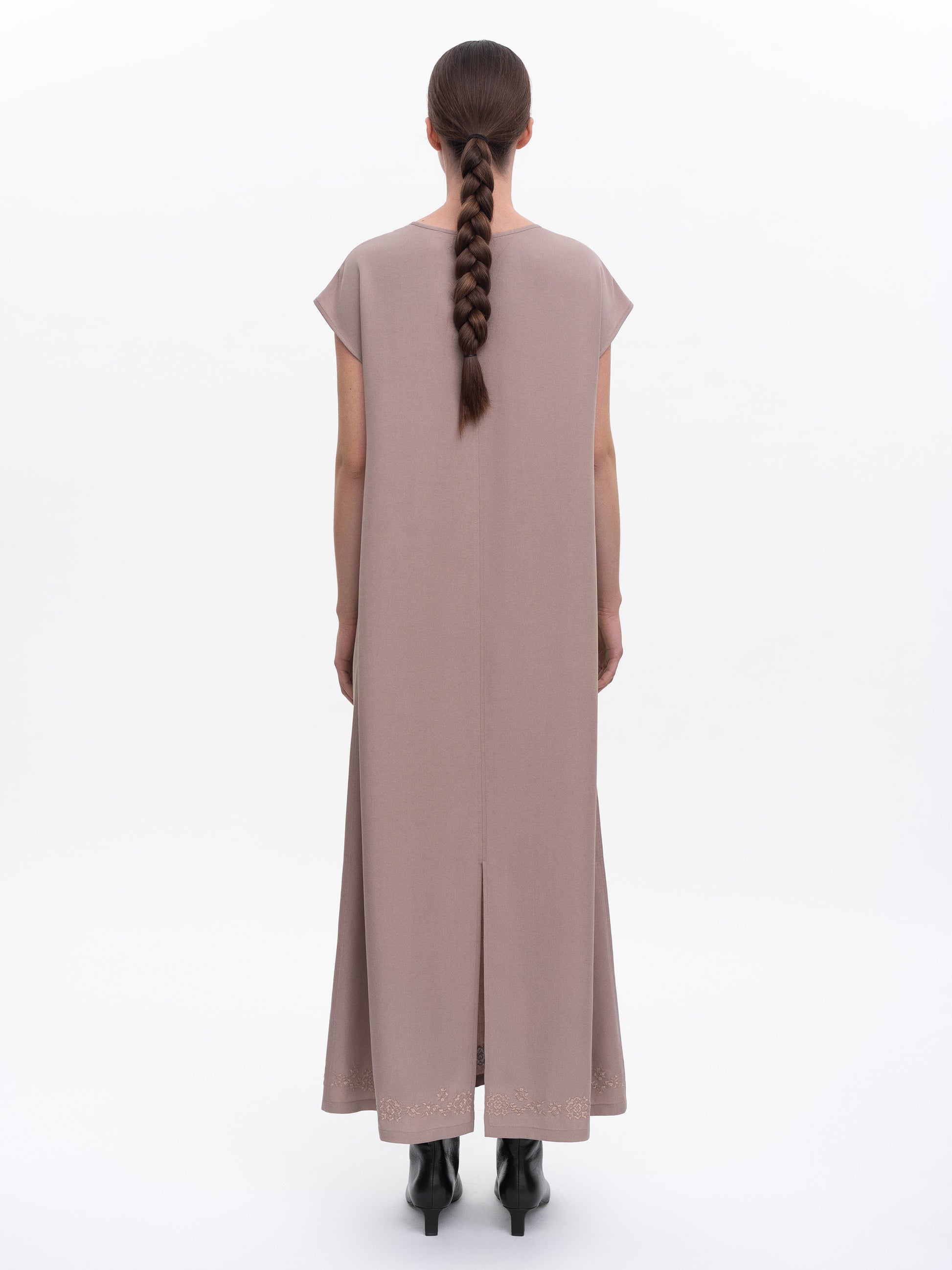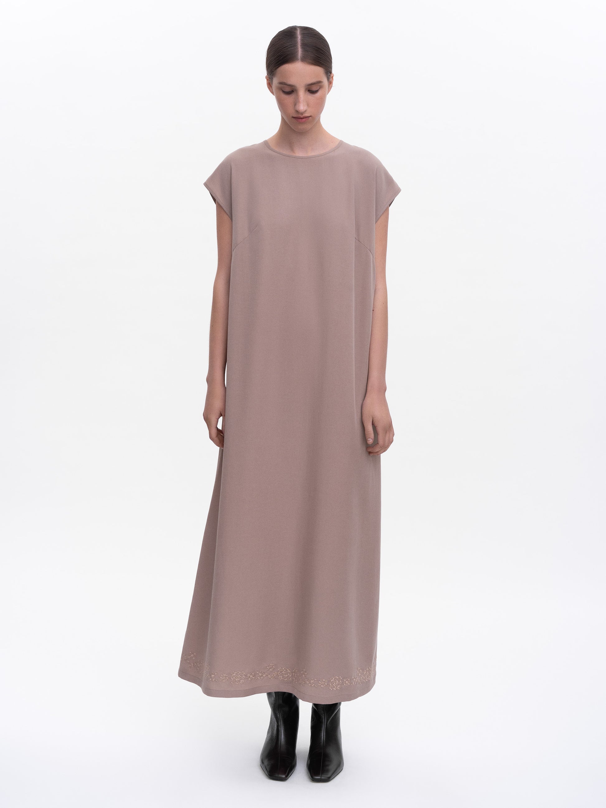 Long dress made from lightweight, soft-textured fabric that gently drapes over the body and flows to the hem.