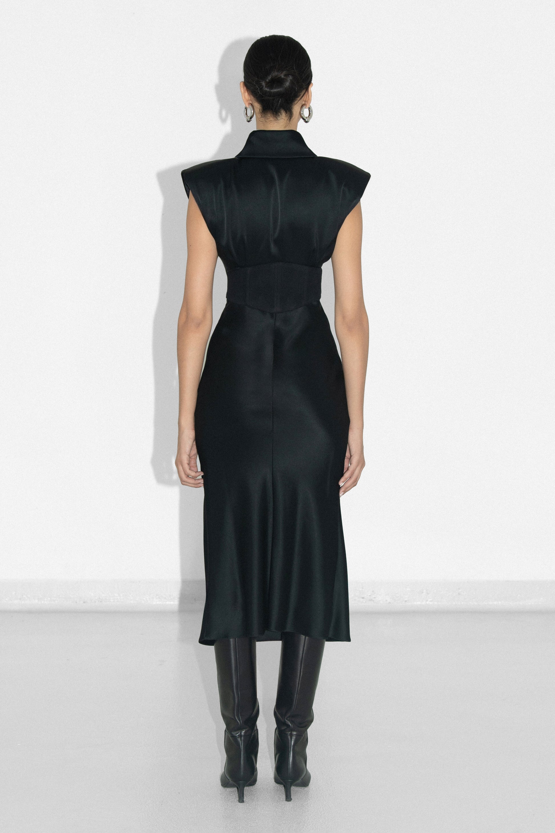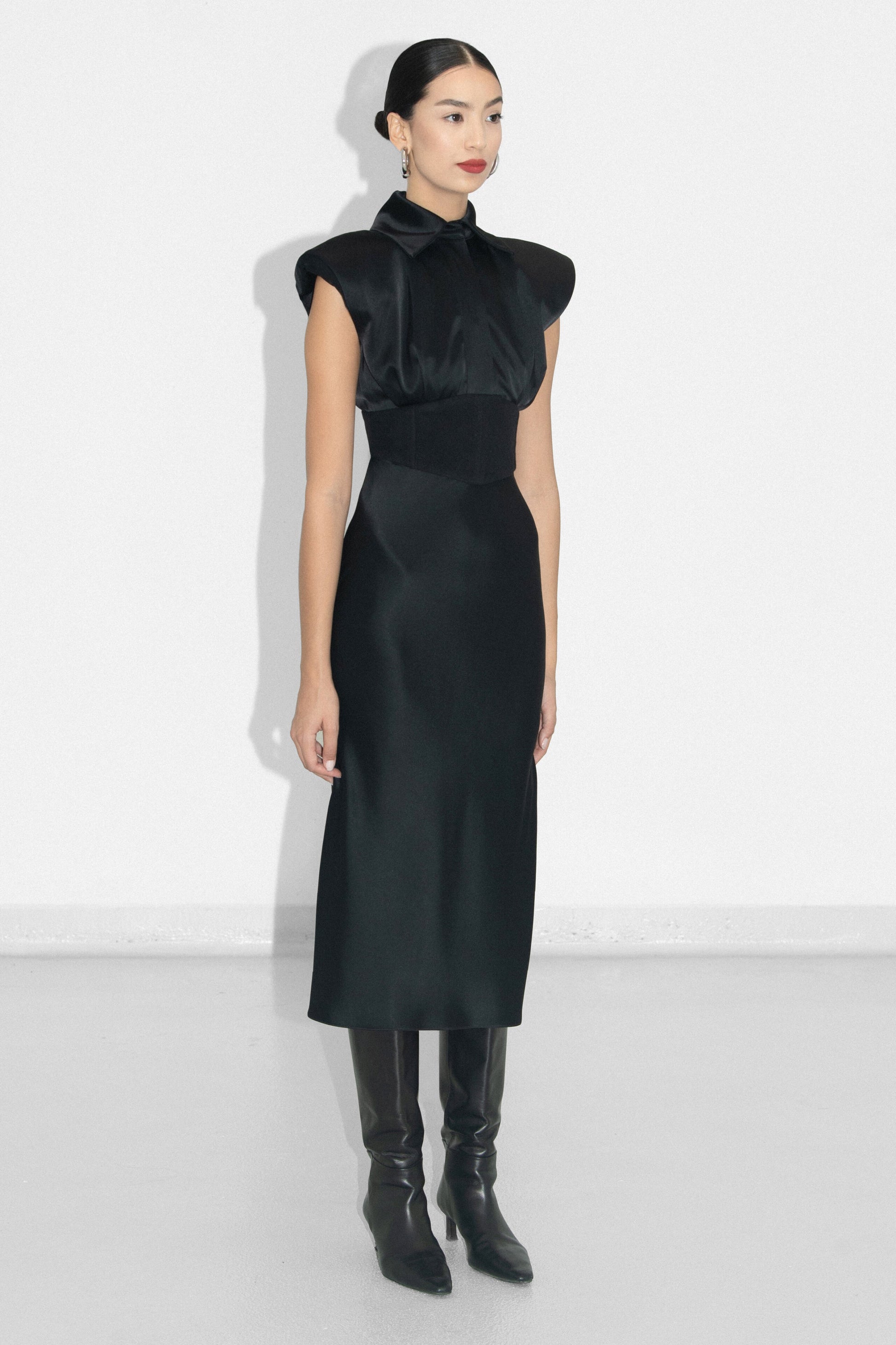 Bias-cut midi dress crafted from glossy viscose fabric, featuring a wool corseted waist and padded shoulders for added structure and a defined silhouette.
