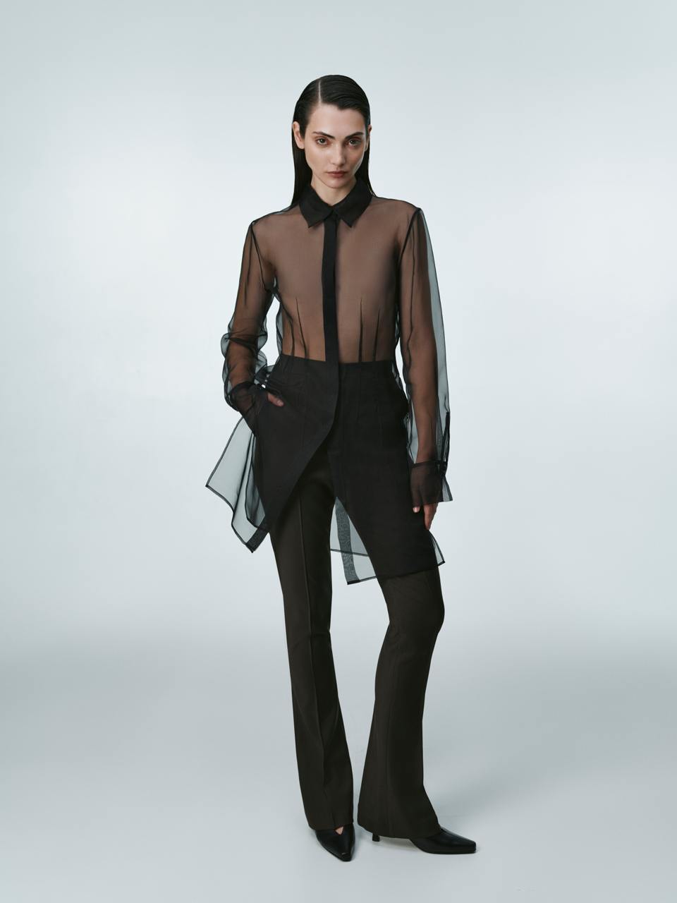 This black organza shirt from ELENA REVA exudes modern elegance and sophistication. Made from 100% silk, it features a lightweight, breathable fabric that offers both comfort and luxury. The sheer, delicate texture of organza adds a unique and refined touch to this versatile shirt, making it an ideal choice for both formal and casual occasions.