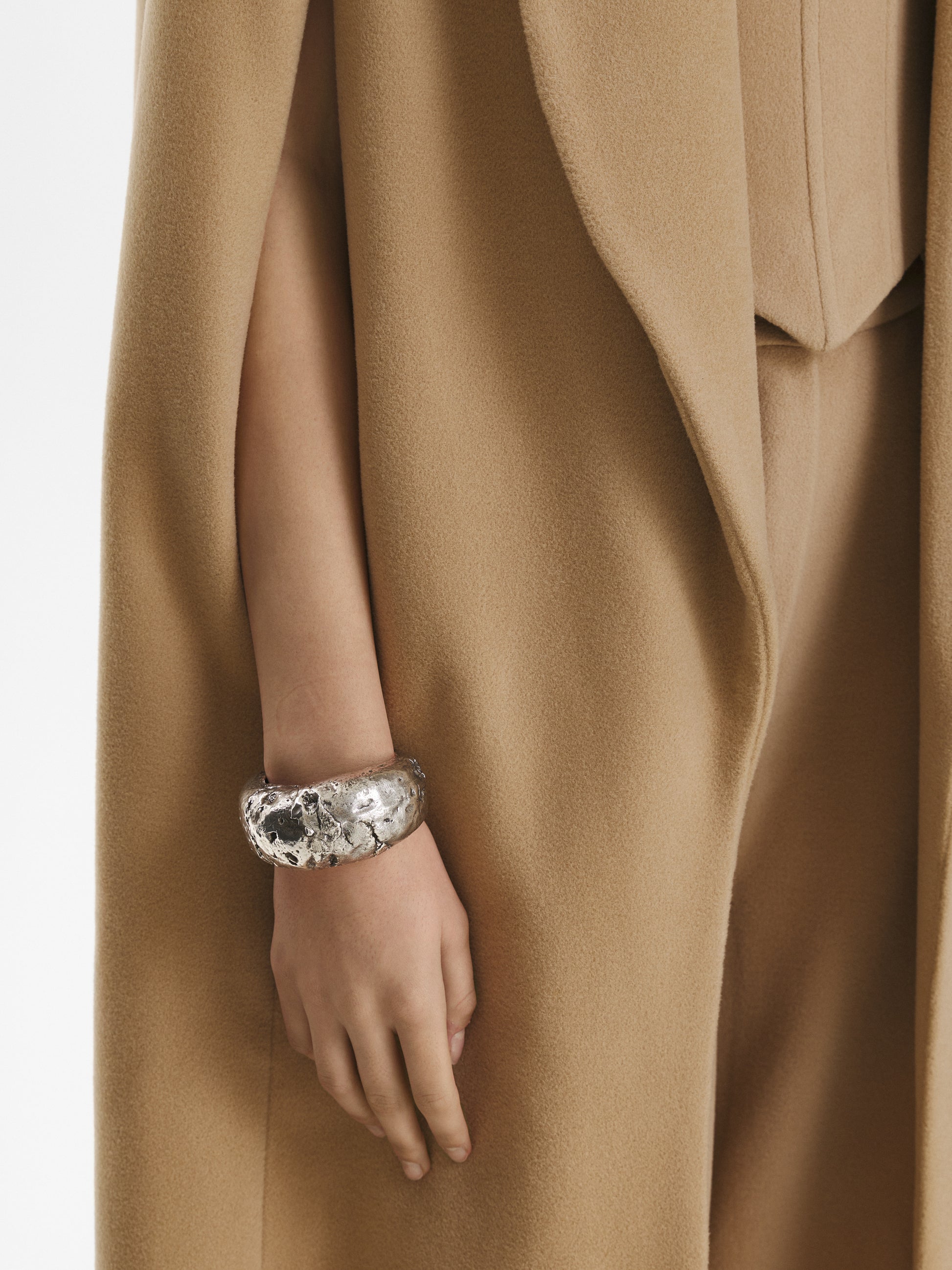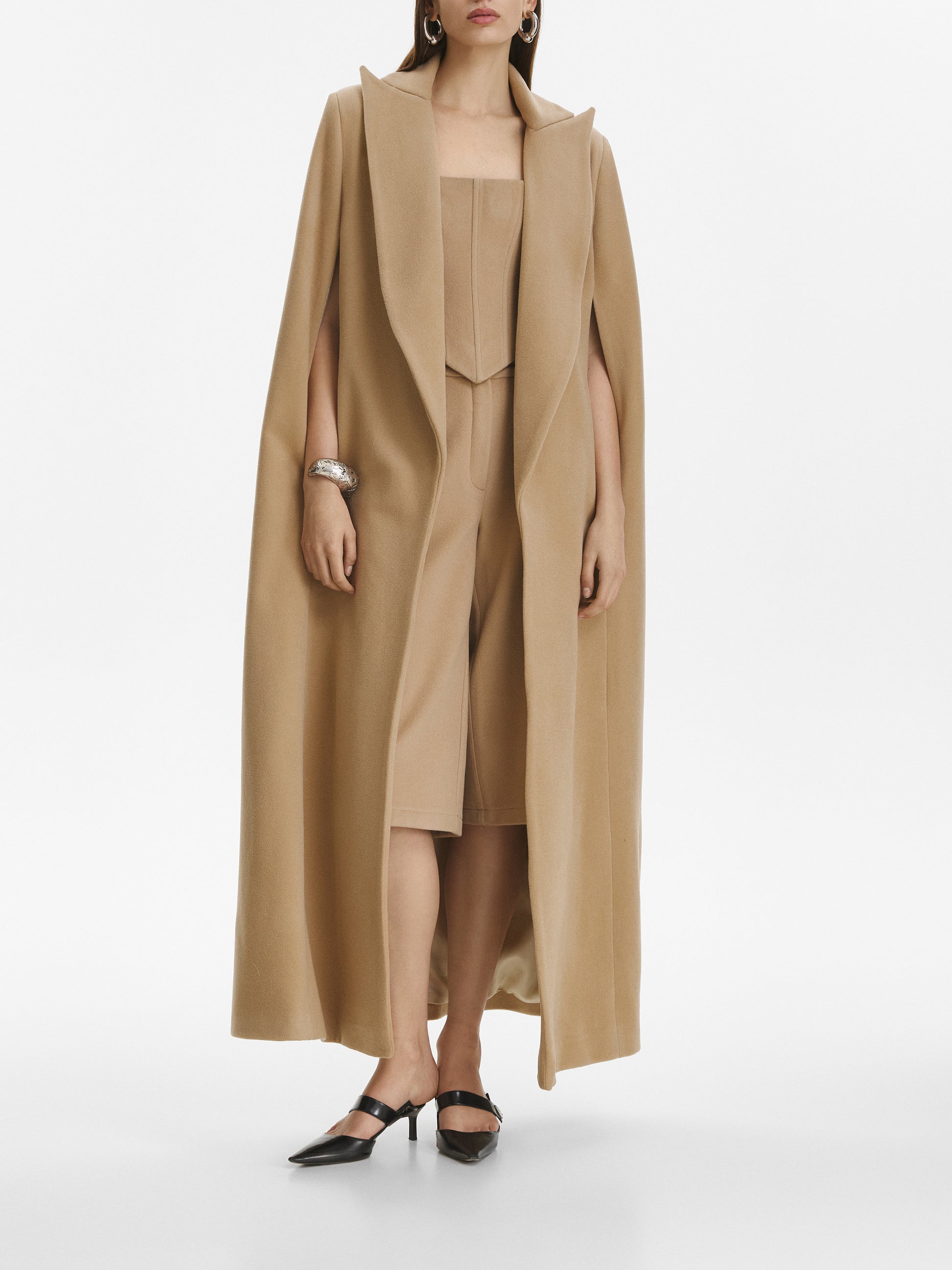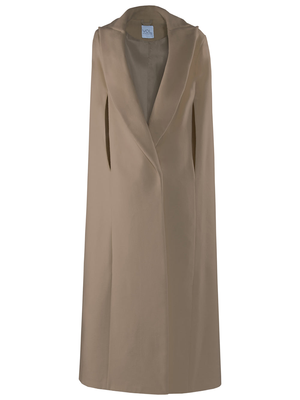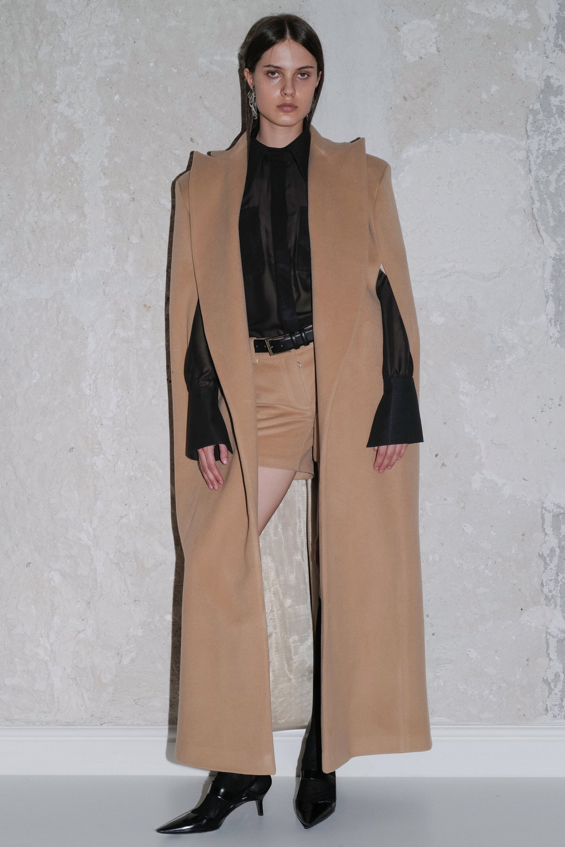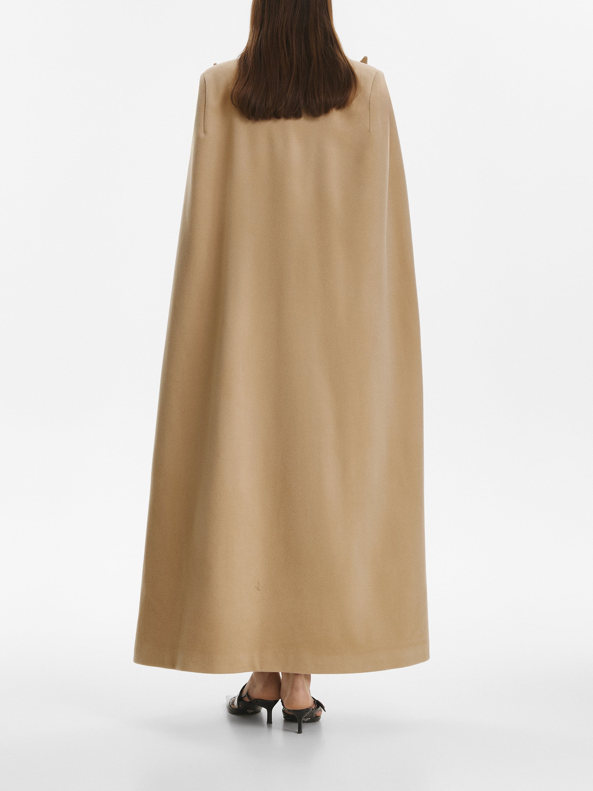Made from cashmere fabric, cut to an imposing, floor length silhouette, this statement piece combines comfort and class.