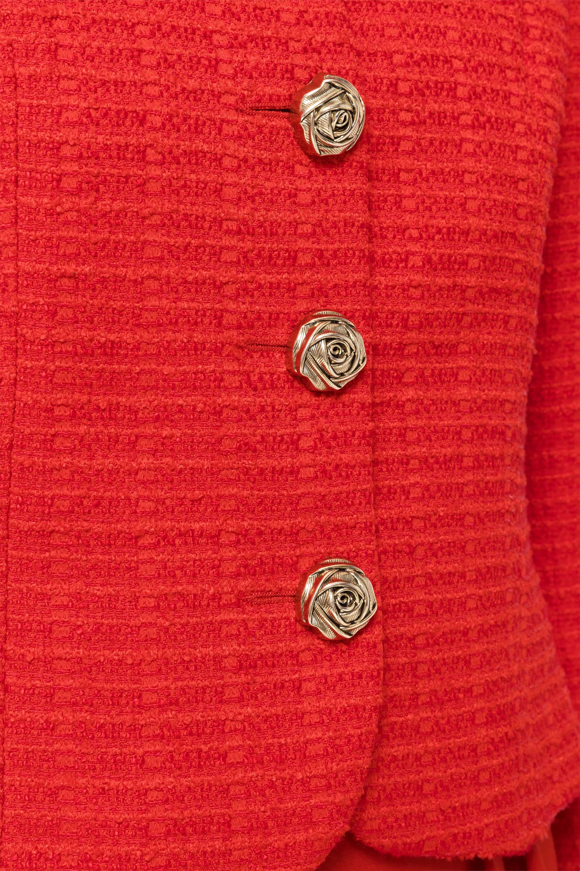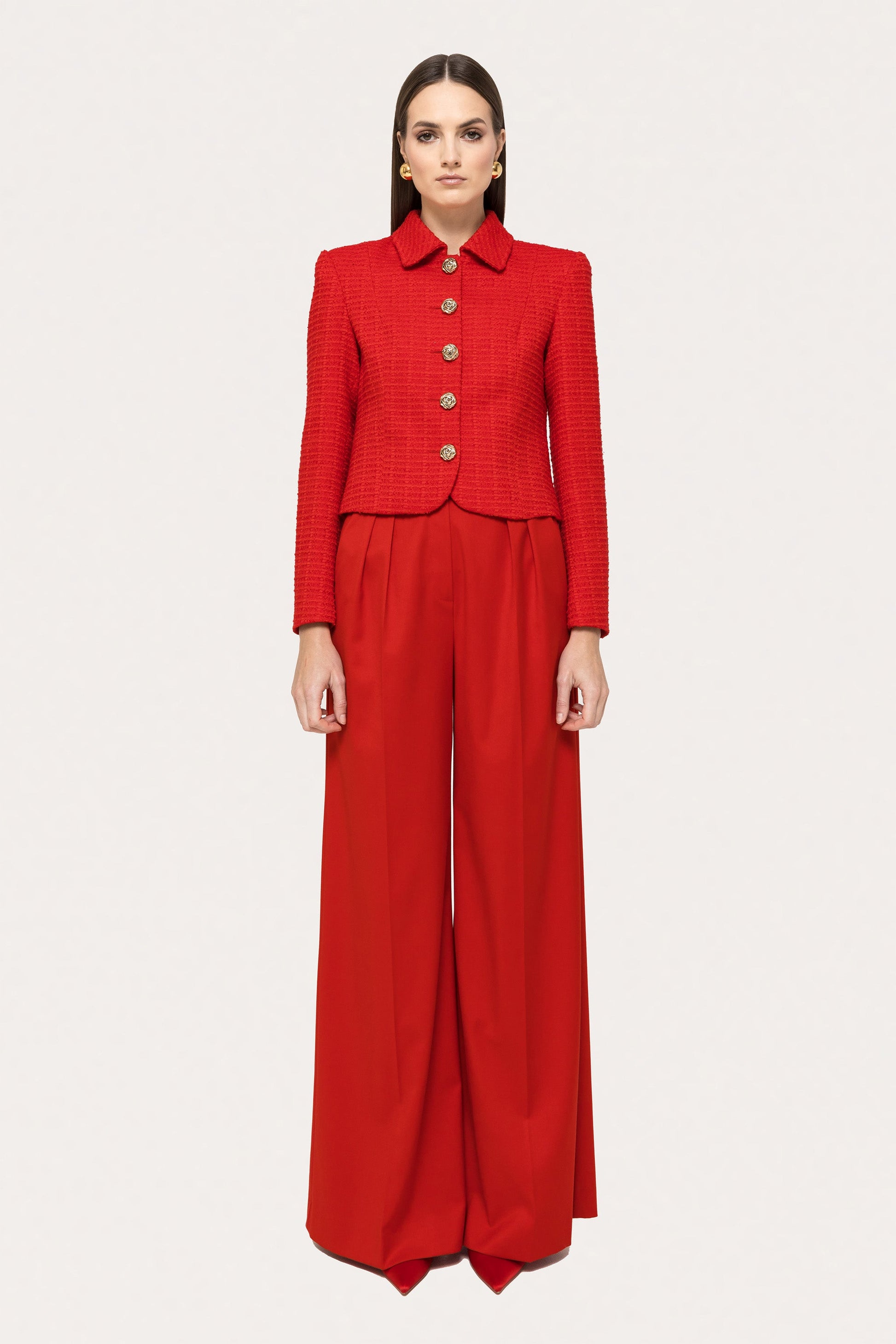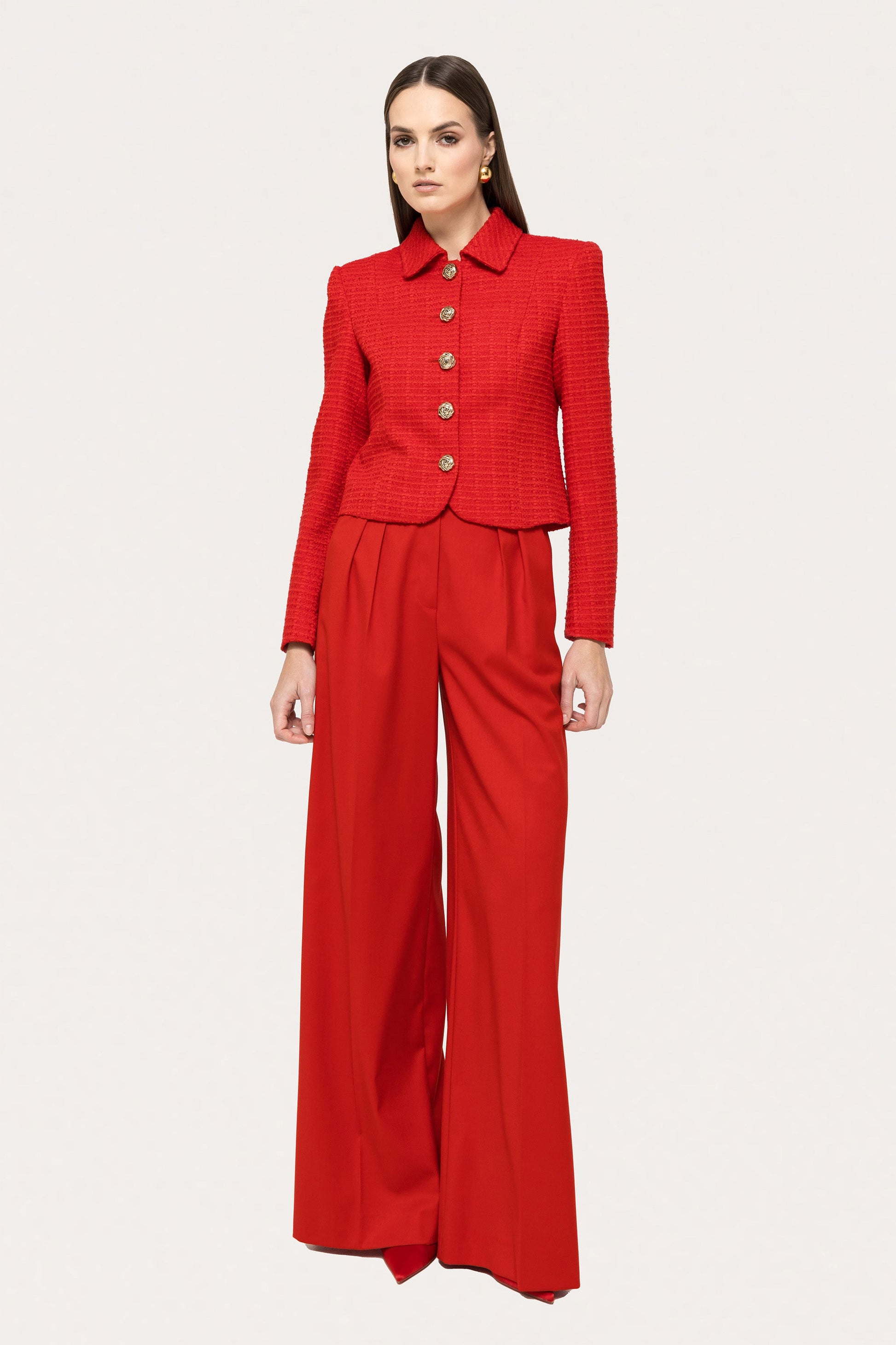 Bold and elegant, our red bouclé jacket commands attention with its rich color and refined structure. Perfect for elevating both daytime and evening outfits with a confident, chic flair.