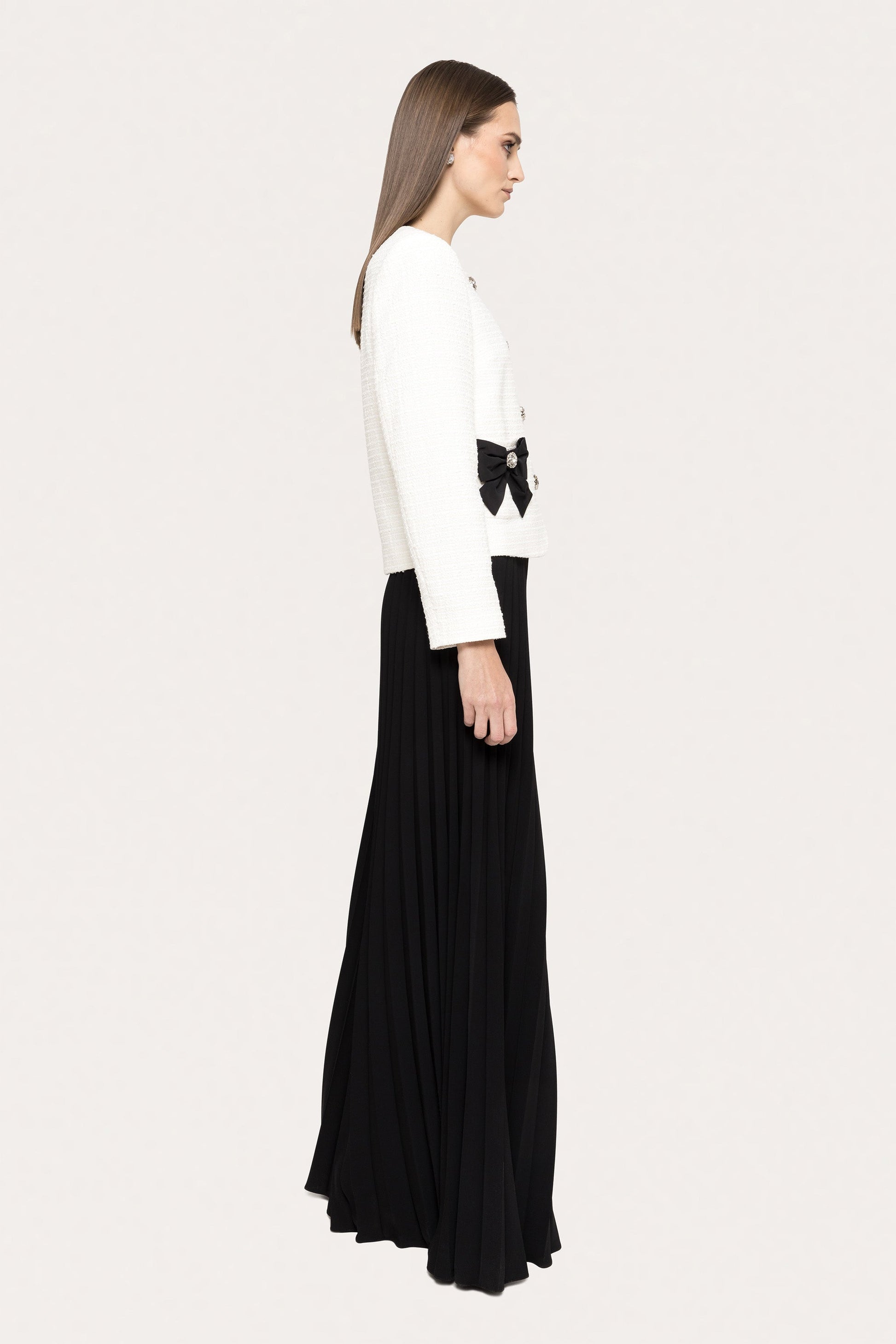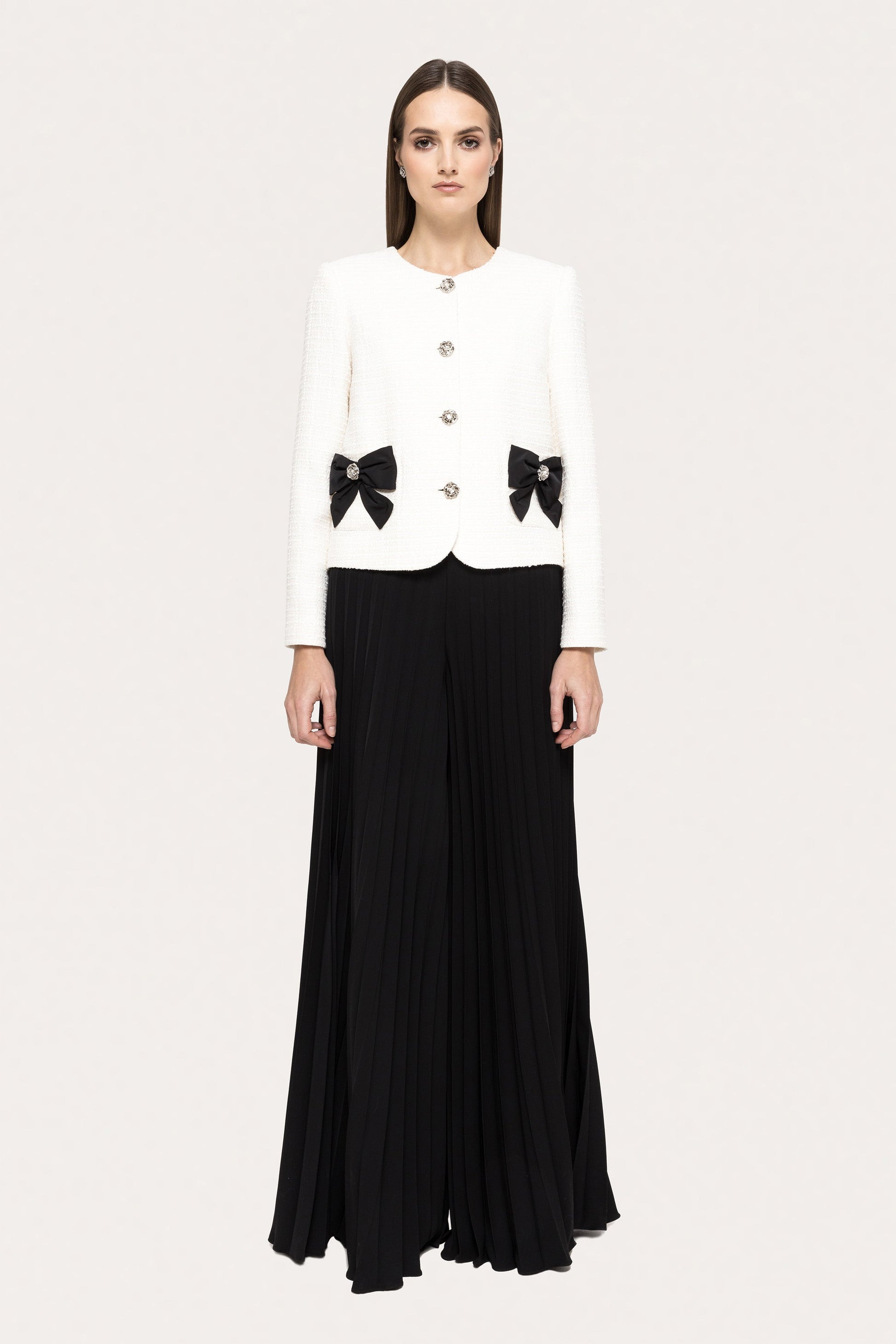 Feminine and refined, our white bouclé jacket with black accents and bow embellishments offers a sophisticated edge. A cropped cut makes it ideal for layering over dresses or sleek trousers.