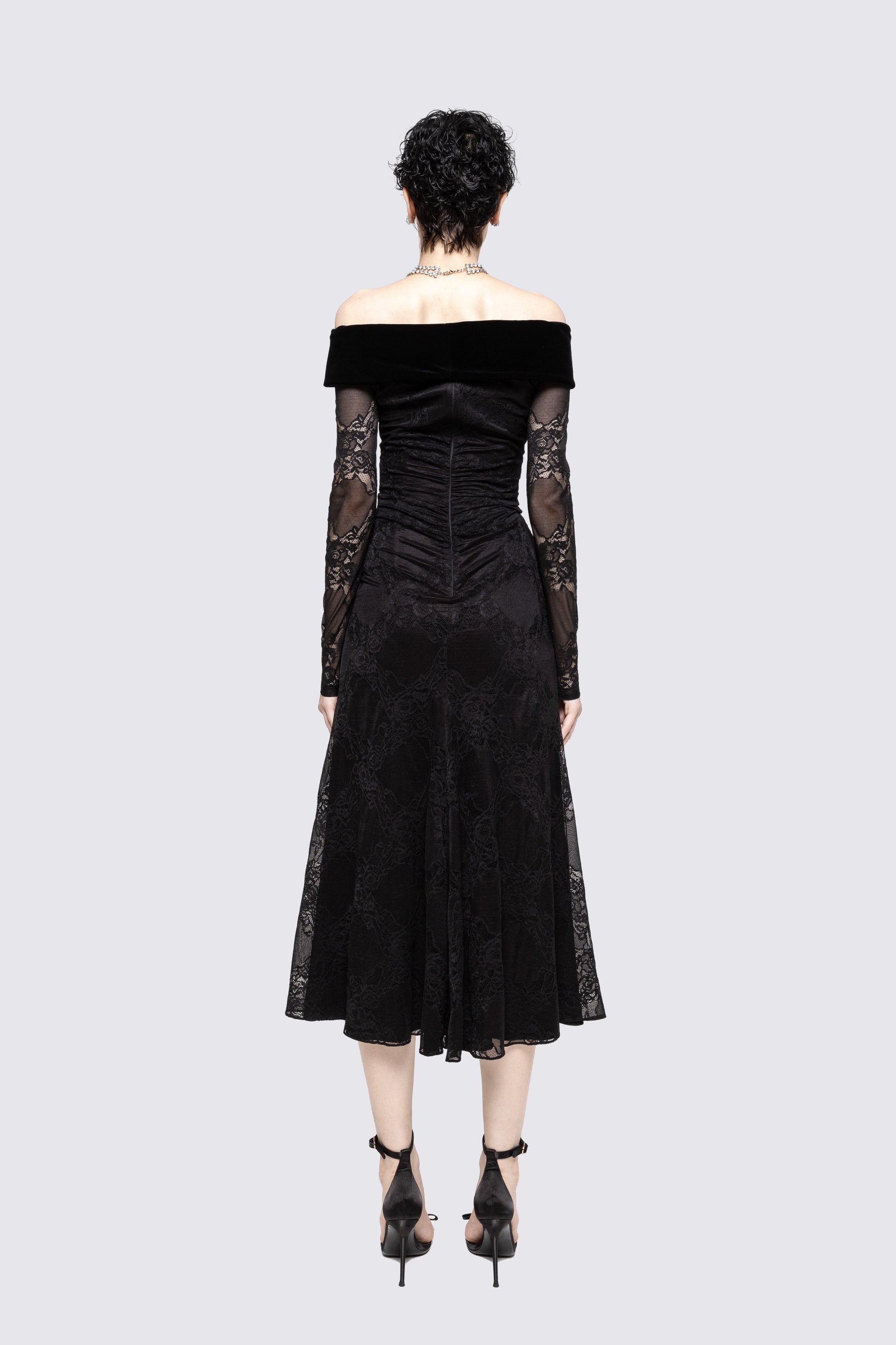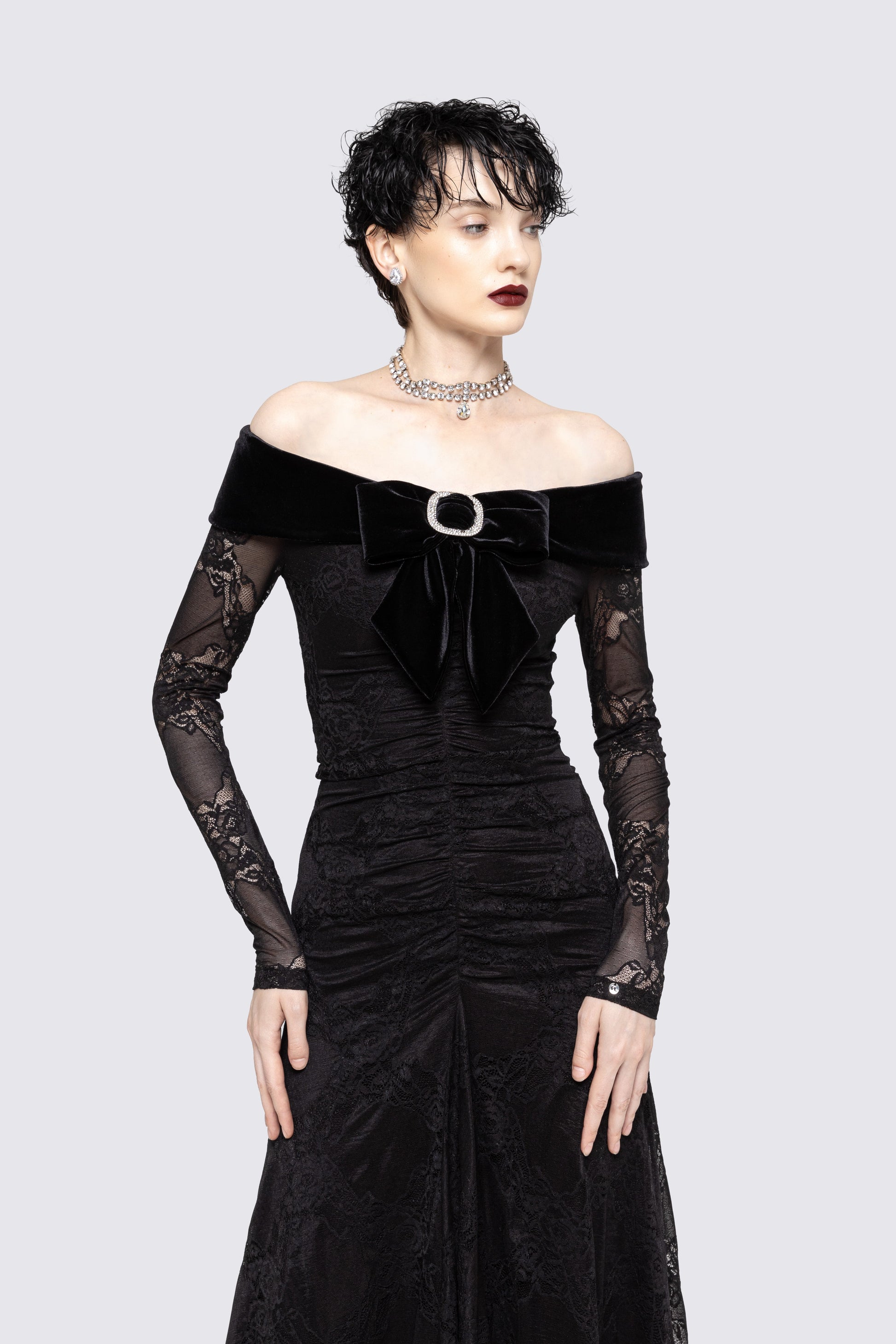 A sophisticated lace midi dress featuring an elegant bow accent. The delicate fabric and feminine detail make it an impeccable choice for refined gatherings.