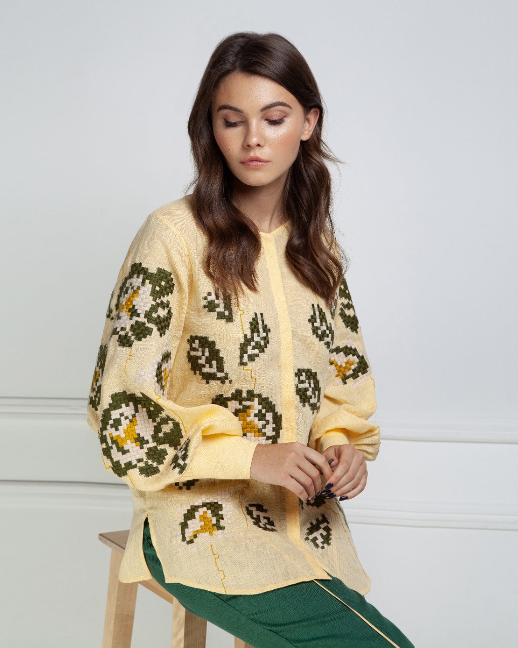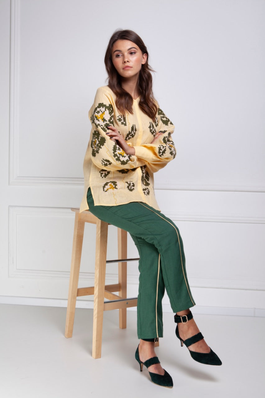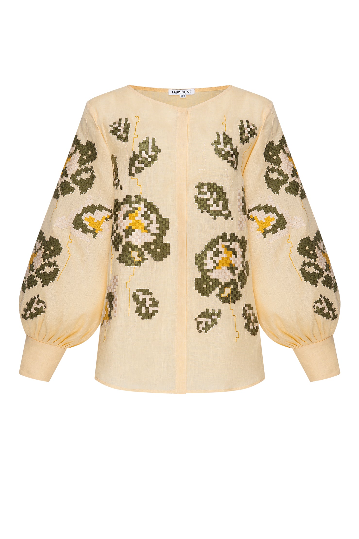 Indulge in the refined beauty of the Camelia Beige Blouse by FOBERINI. A stunning example of craftsmanship, this blouse is delicately embroidered with a floral ornament in soothing green and mustard hues. The elegant button closure at the front, paired with high cuffs on the sleeves, adds to the timeless charm of the piece.