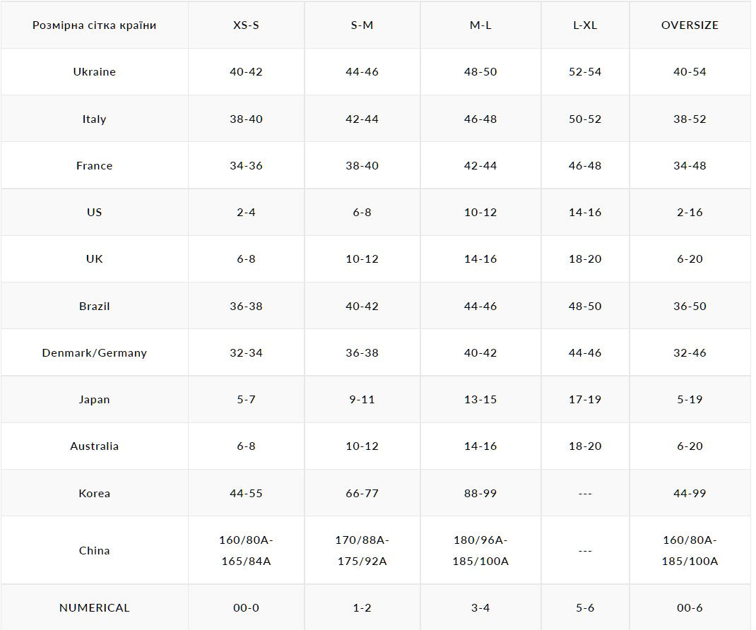 | Ukraine | 40-42 | 44-46 | 48-50 | 52-54 |