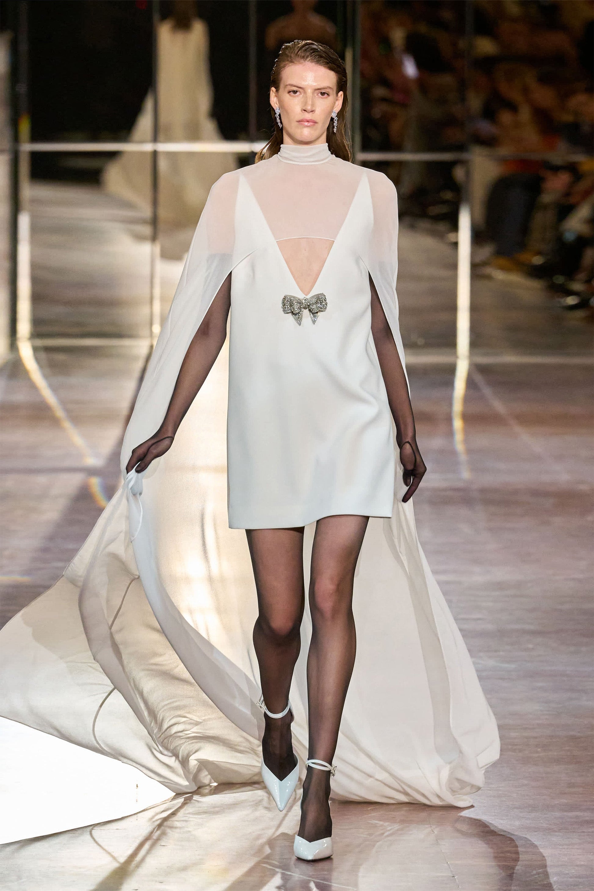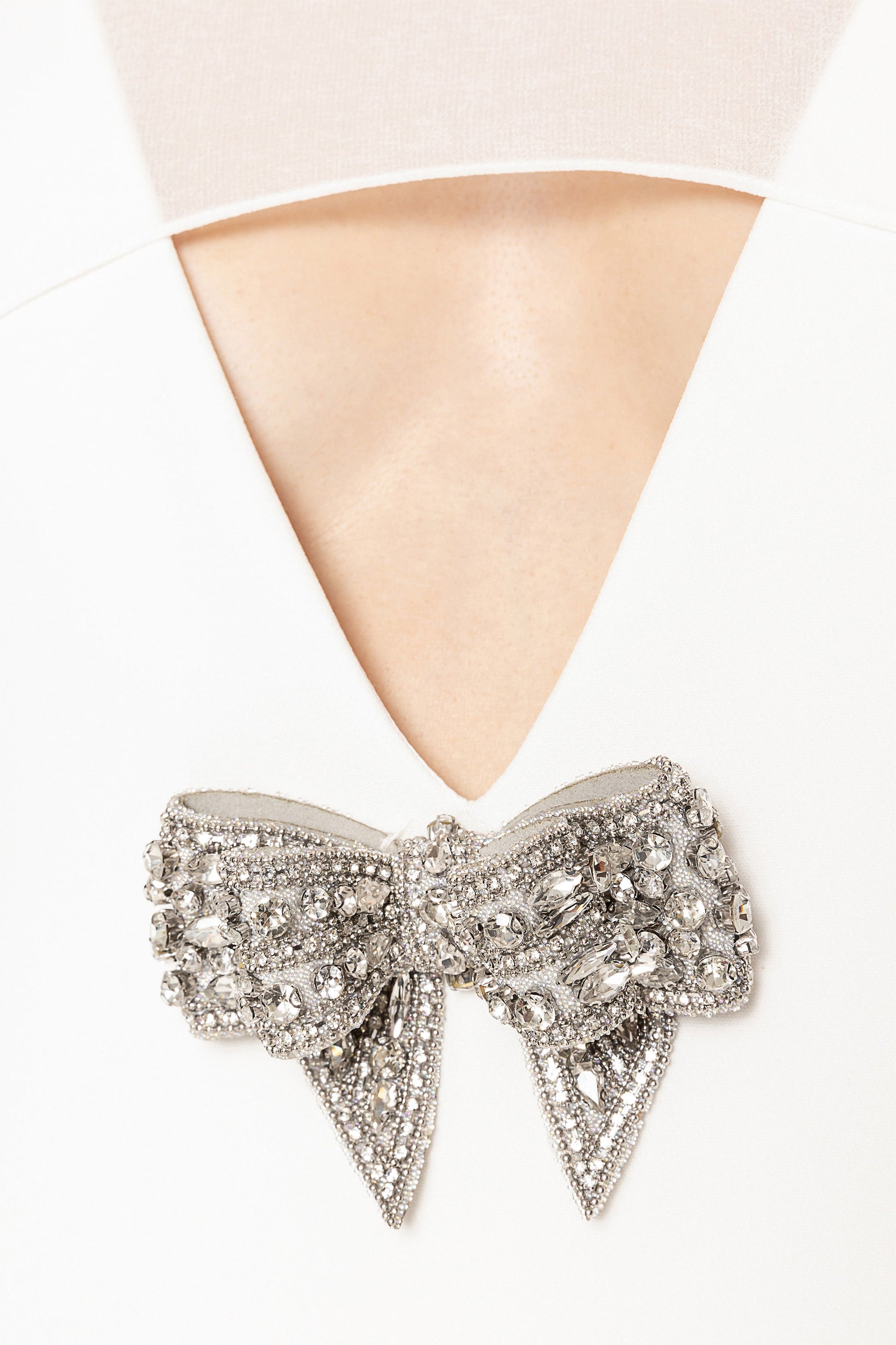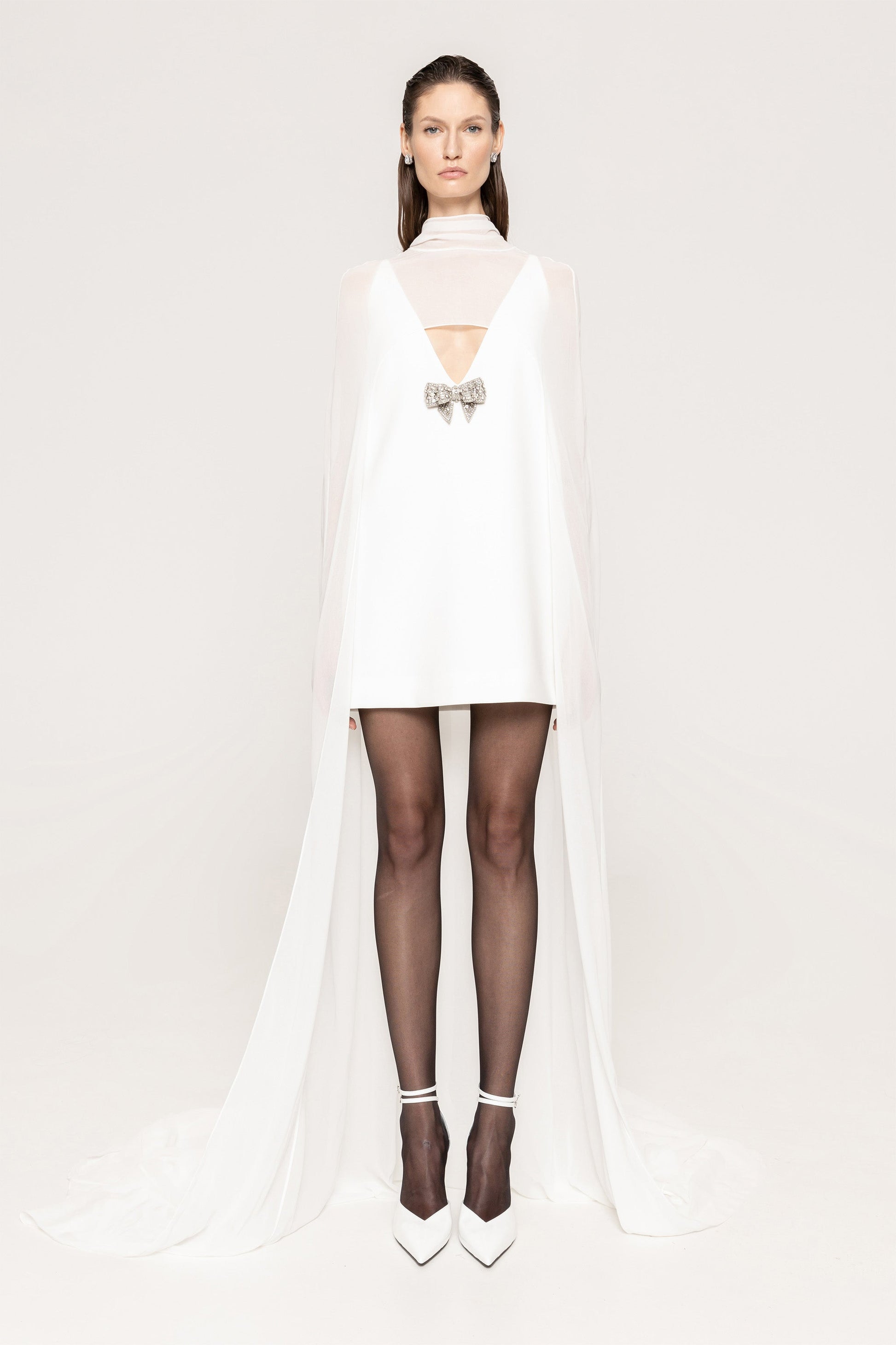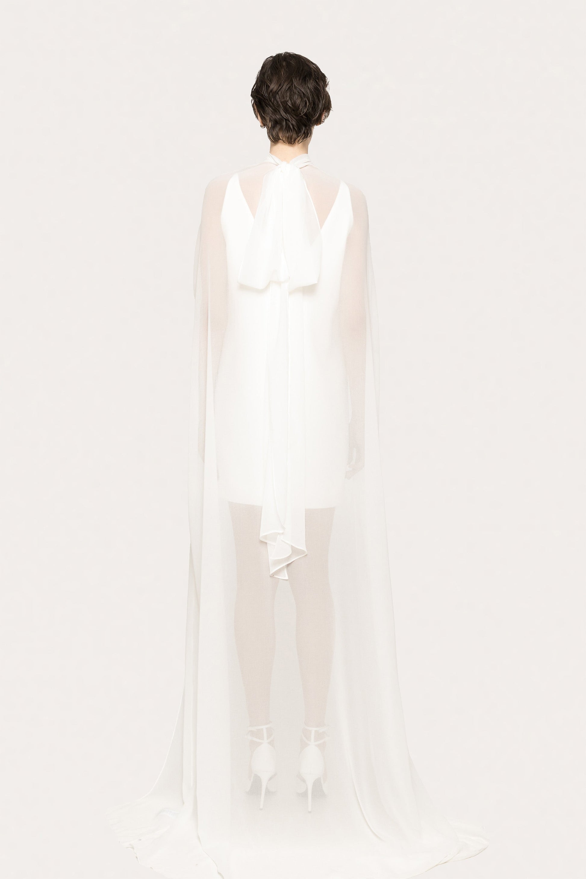 Daring and graceful, this backless mini dress features a structured cape and a flowing train. The crisp crepe texture adds elegance, while the silhouette flatters for weddings, civil ceremonies, or chic evening occasions.