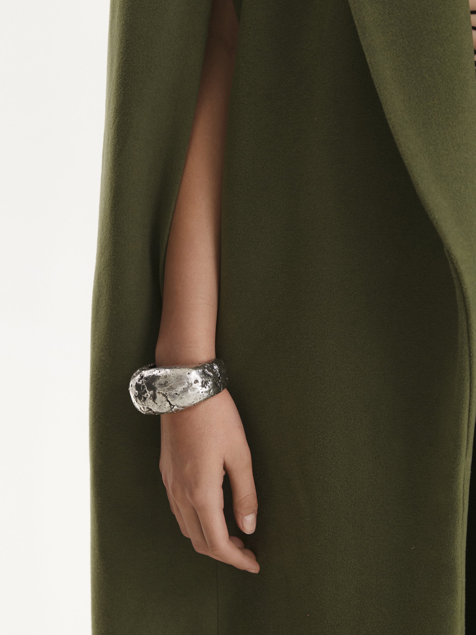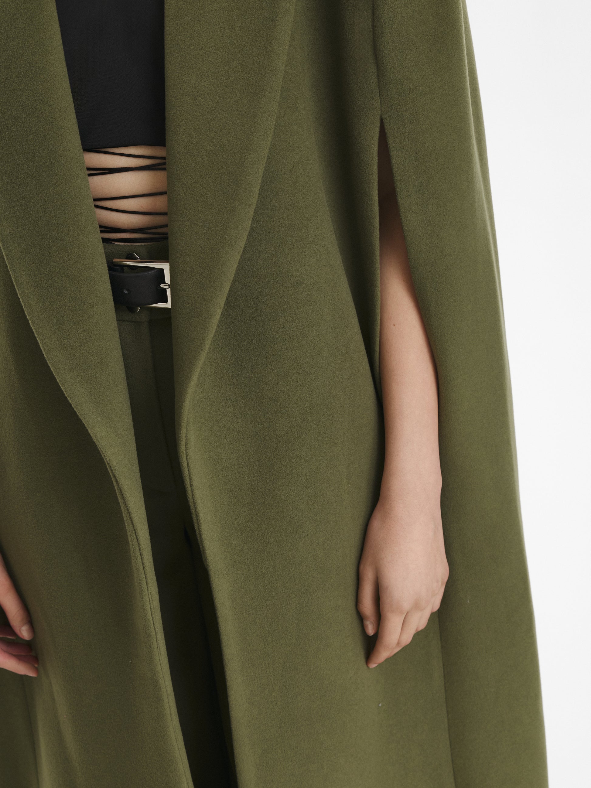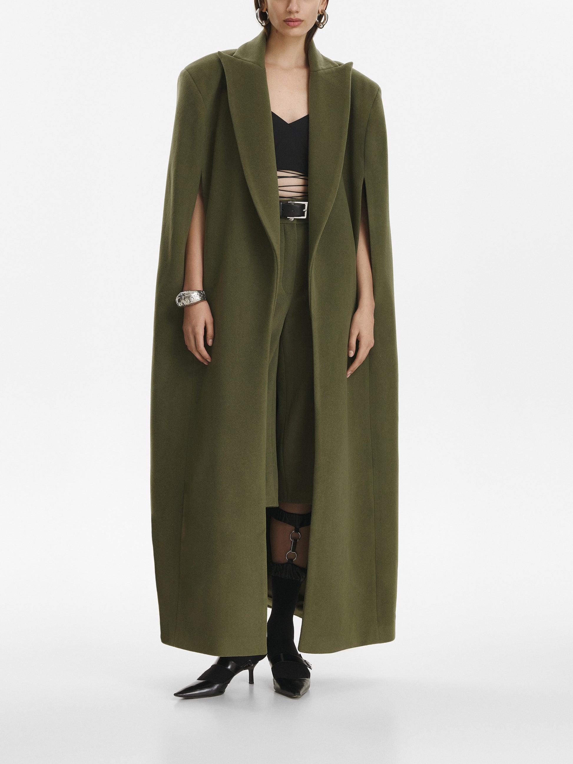 Made from cashmere fabric, cut to an imposing, floor length silhouette, this statement piece combines comfort and class.