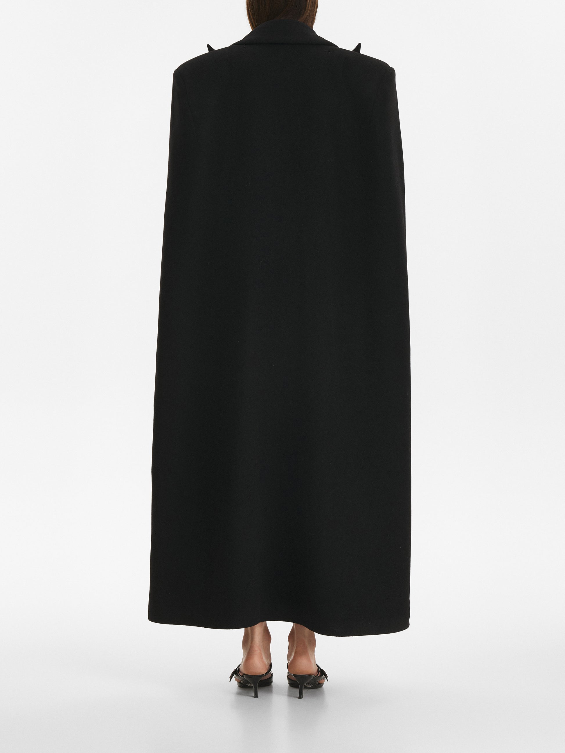Made from cashmere fabric, cut to an imposing, floor length silhouette, this statement piece combines comfort and class.