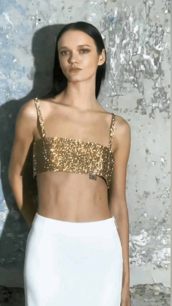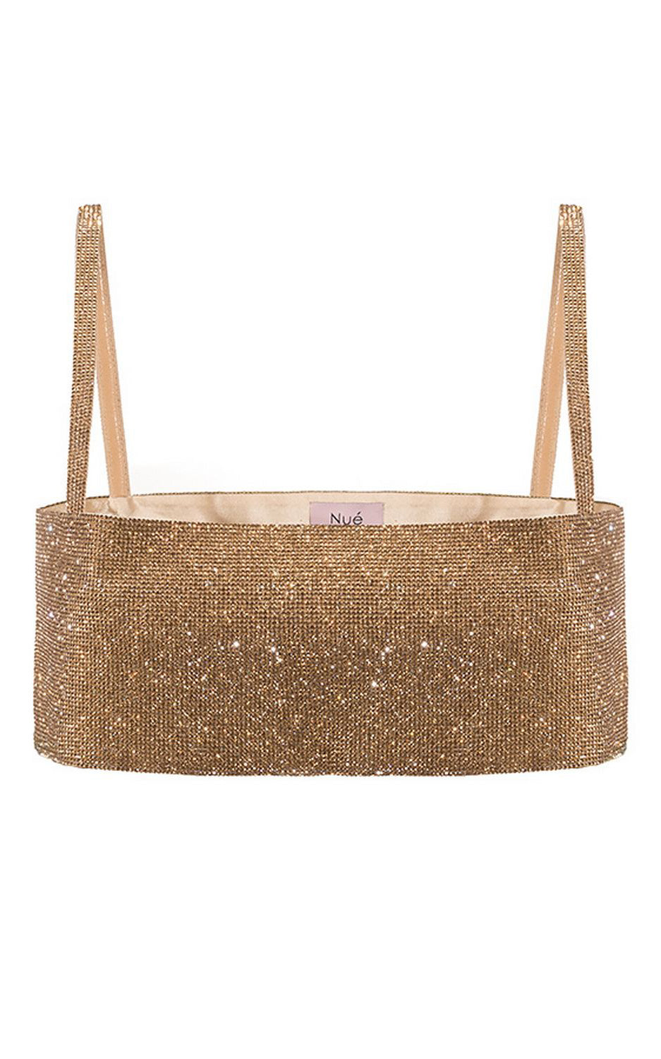 NUÉ signature item. A rhinestone top with a cropped length, square neckline and silicone-based spaghetti straps. Fully lined with hook-and-eye closures on the side. Charlotte top is made from signature rhinestone fabric with glued rhinestones. Dry clean. Made in Ukraine.