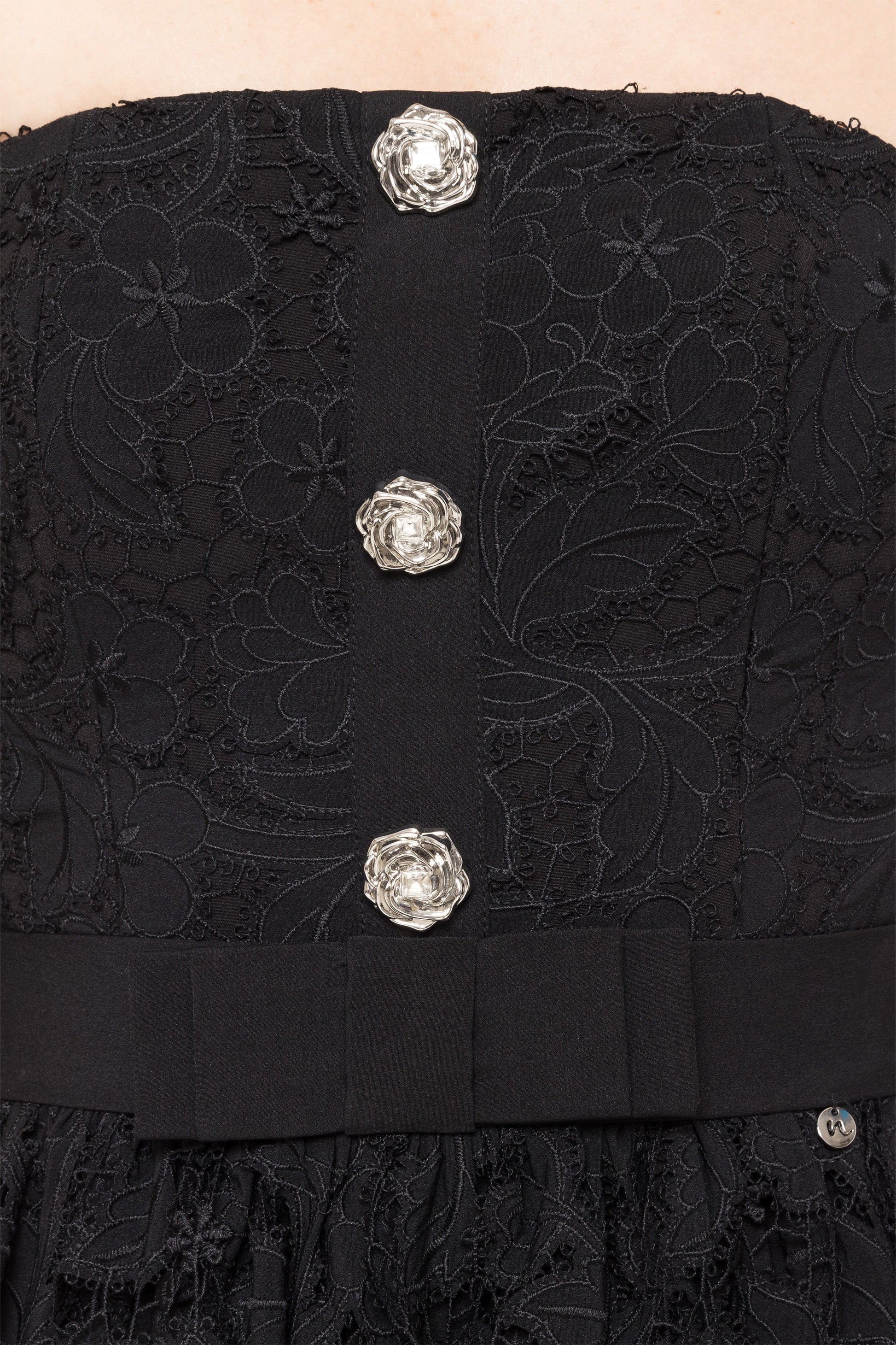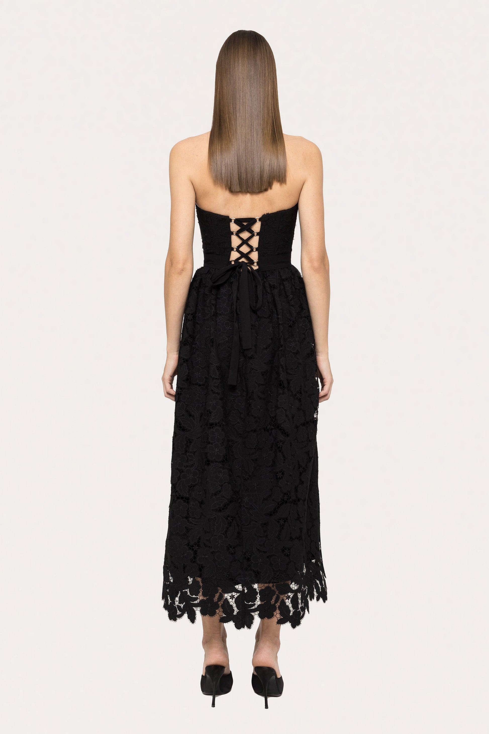 Refined seduction — this black lace dress features a corset-inspired bodice and a strapless cut that sculpts the figure. Perfect for evening receptions, romantic dinners, or high-impact events where elegance meets edge.