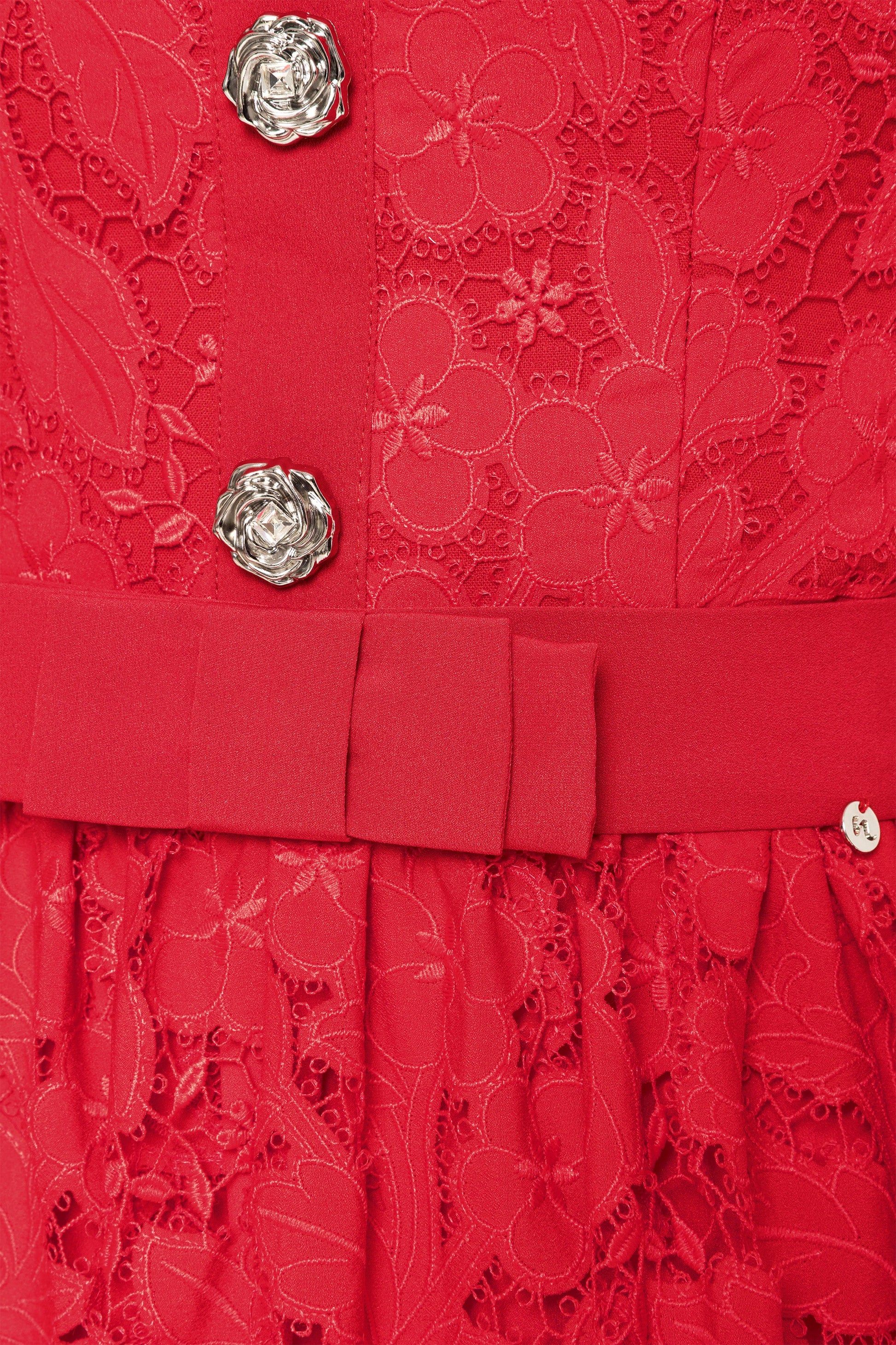 Bold and refined, this red lace dress showcases a corset-style top and a strapless neckline, exuding vintage charm with modern finesse. A show-stopping choice for weddings, galas, or any celebration where confidence is key.