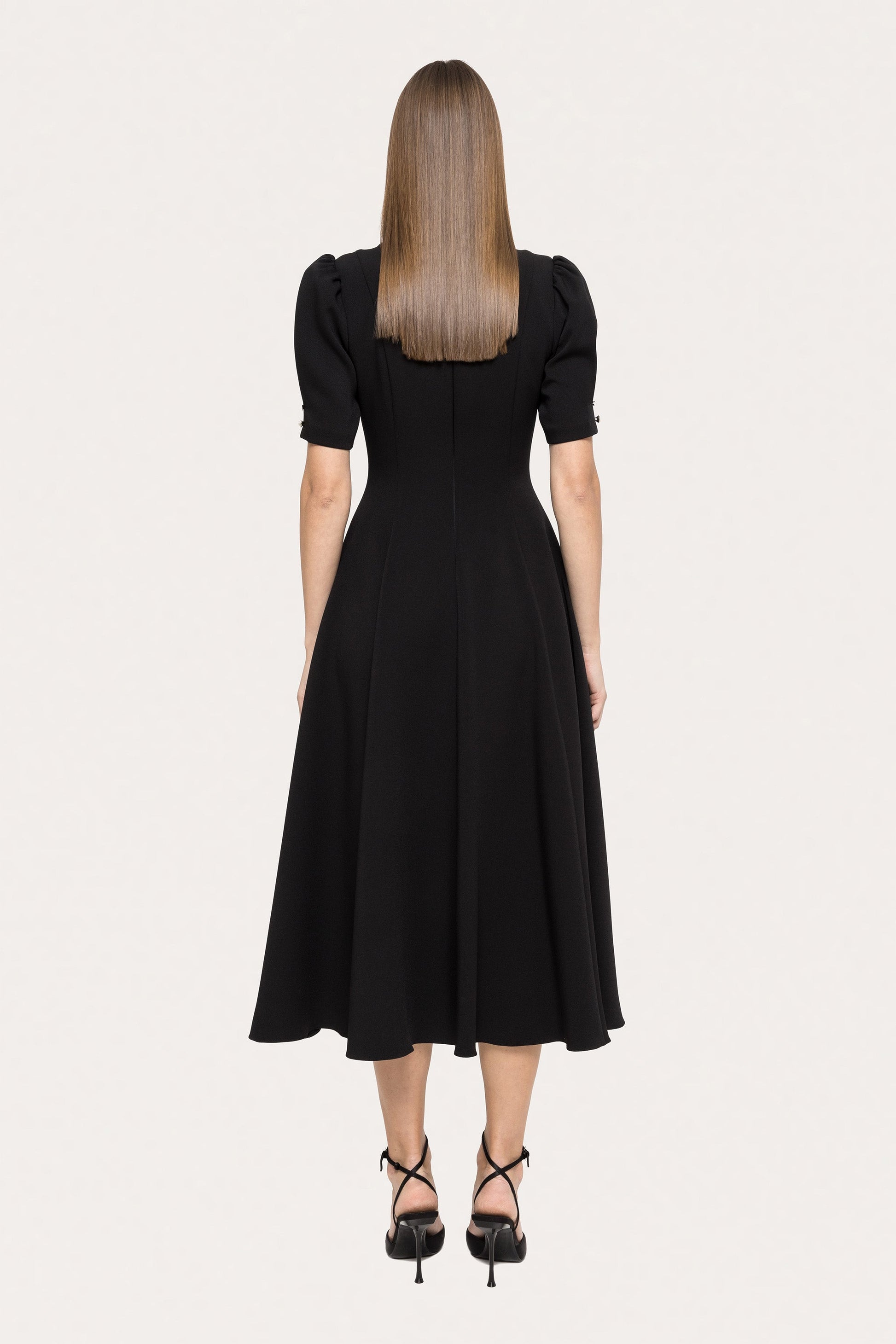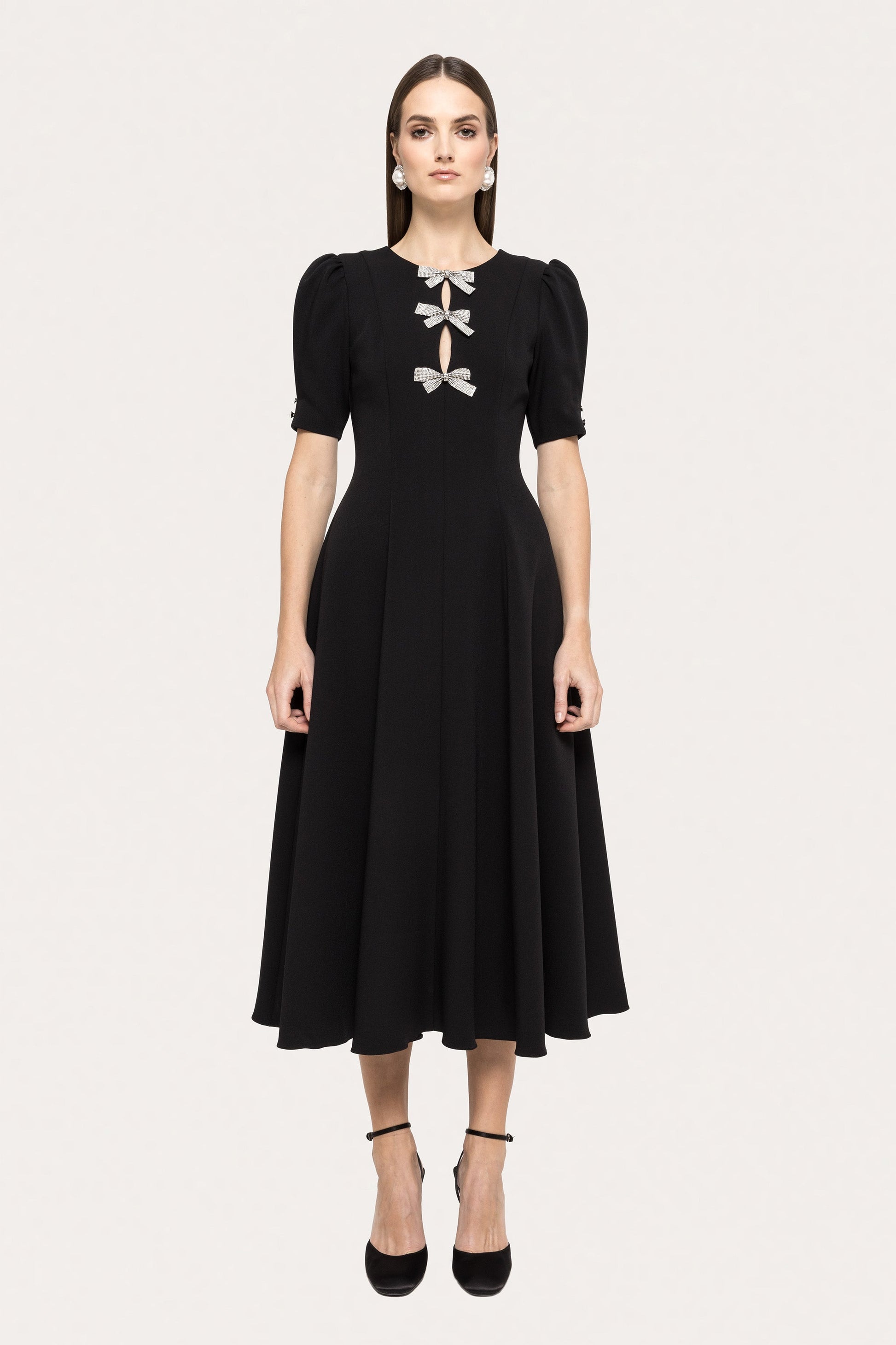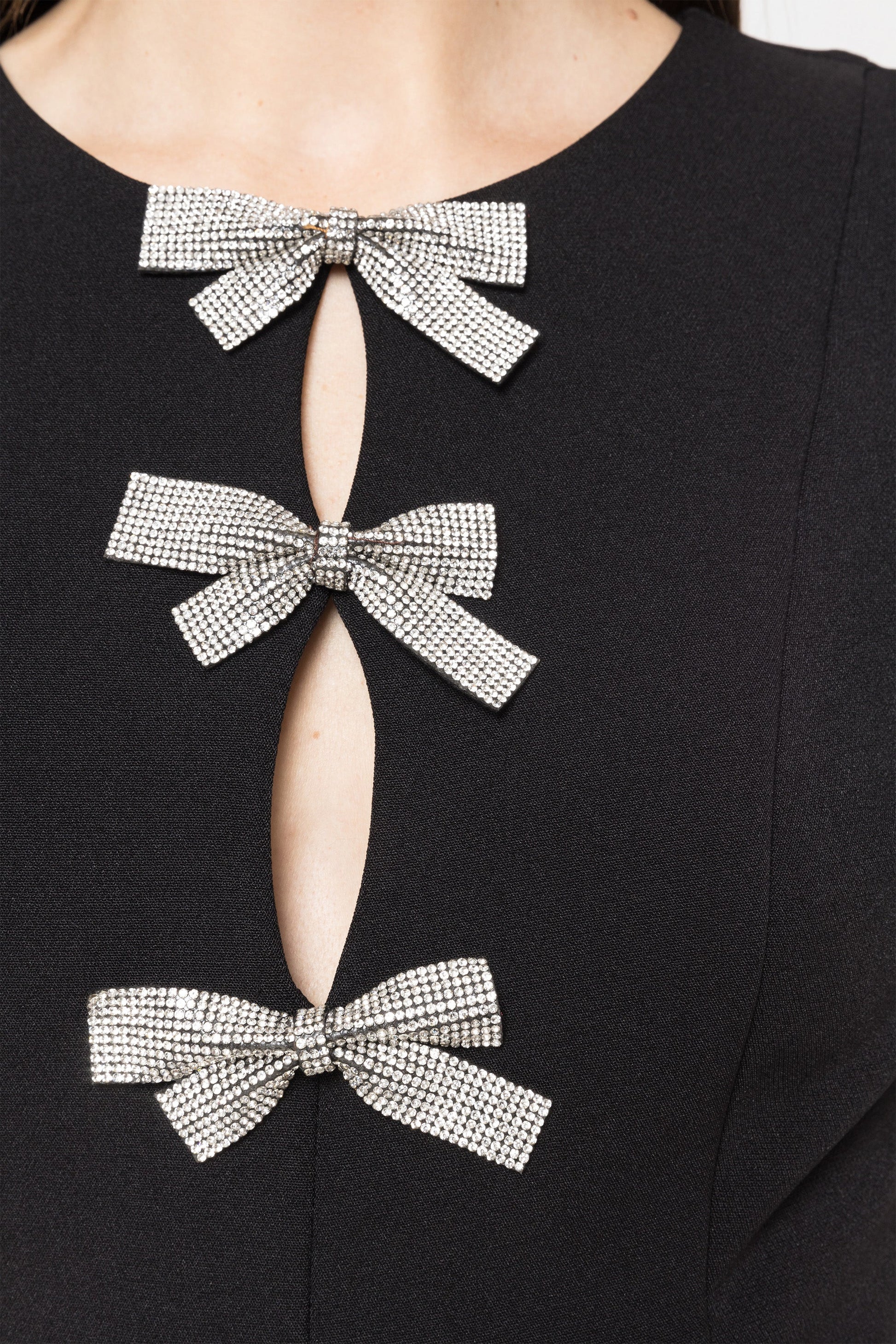 Understated yet eye-catching, this midi dress in smooth crepe fabric features a shimmering crystal bow. A graceful choice for daytime events or elegant parties.
