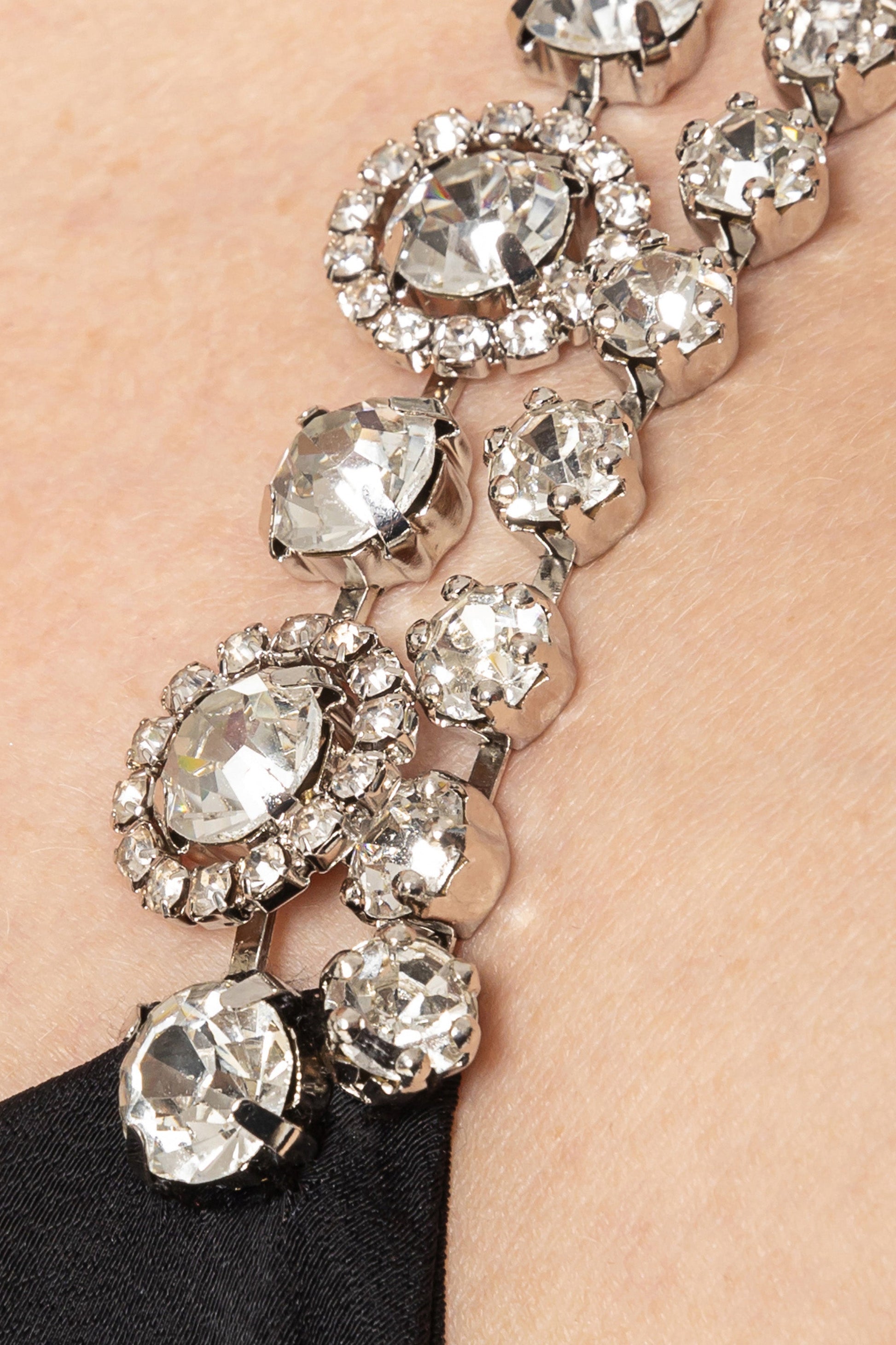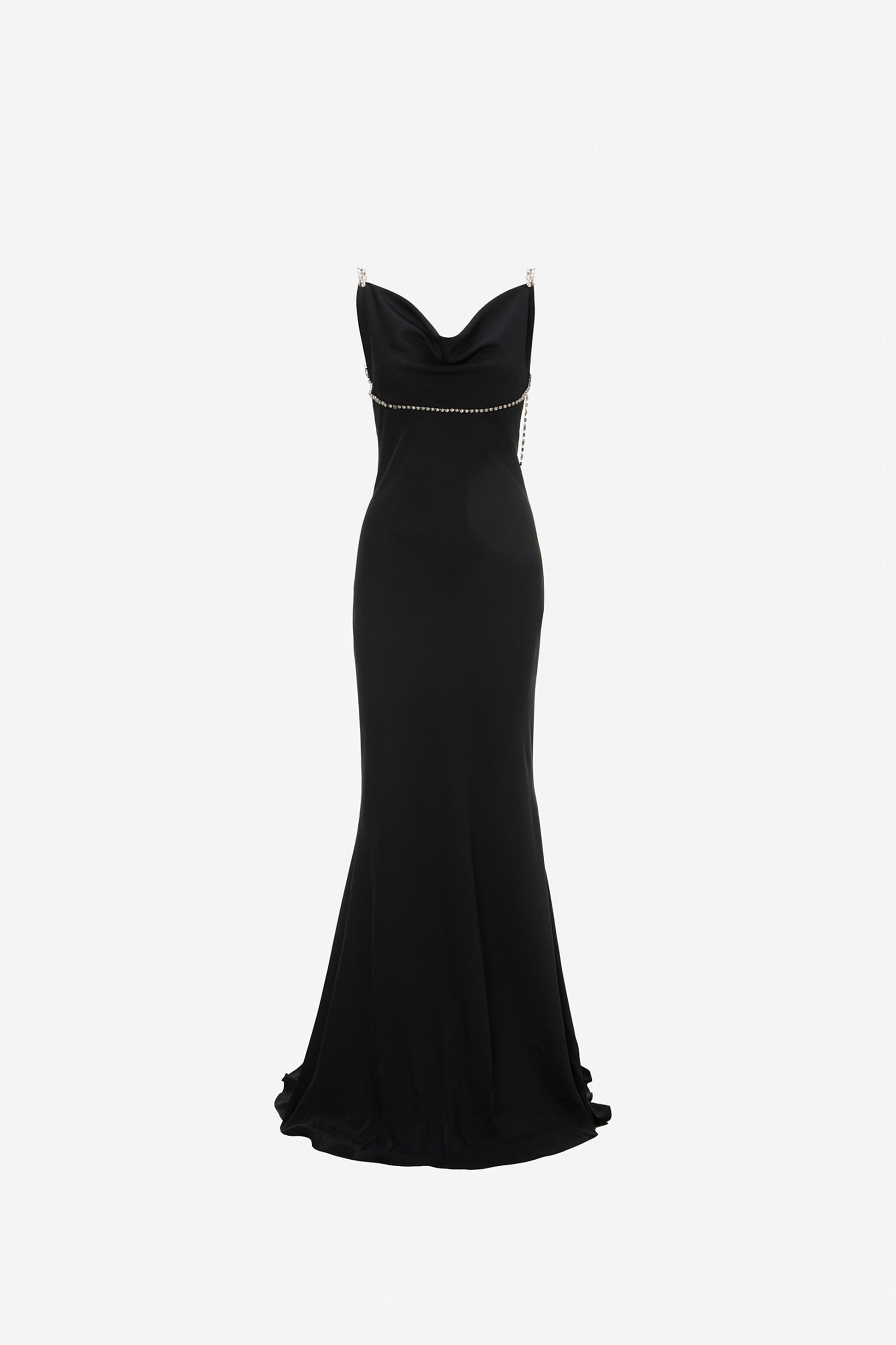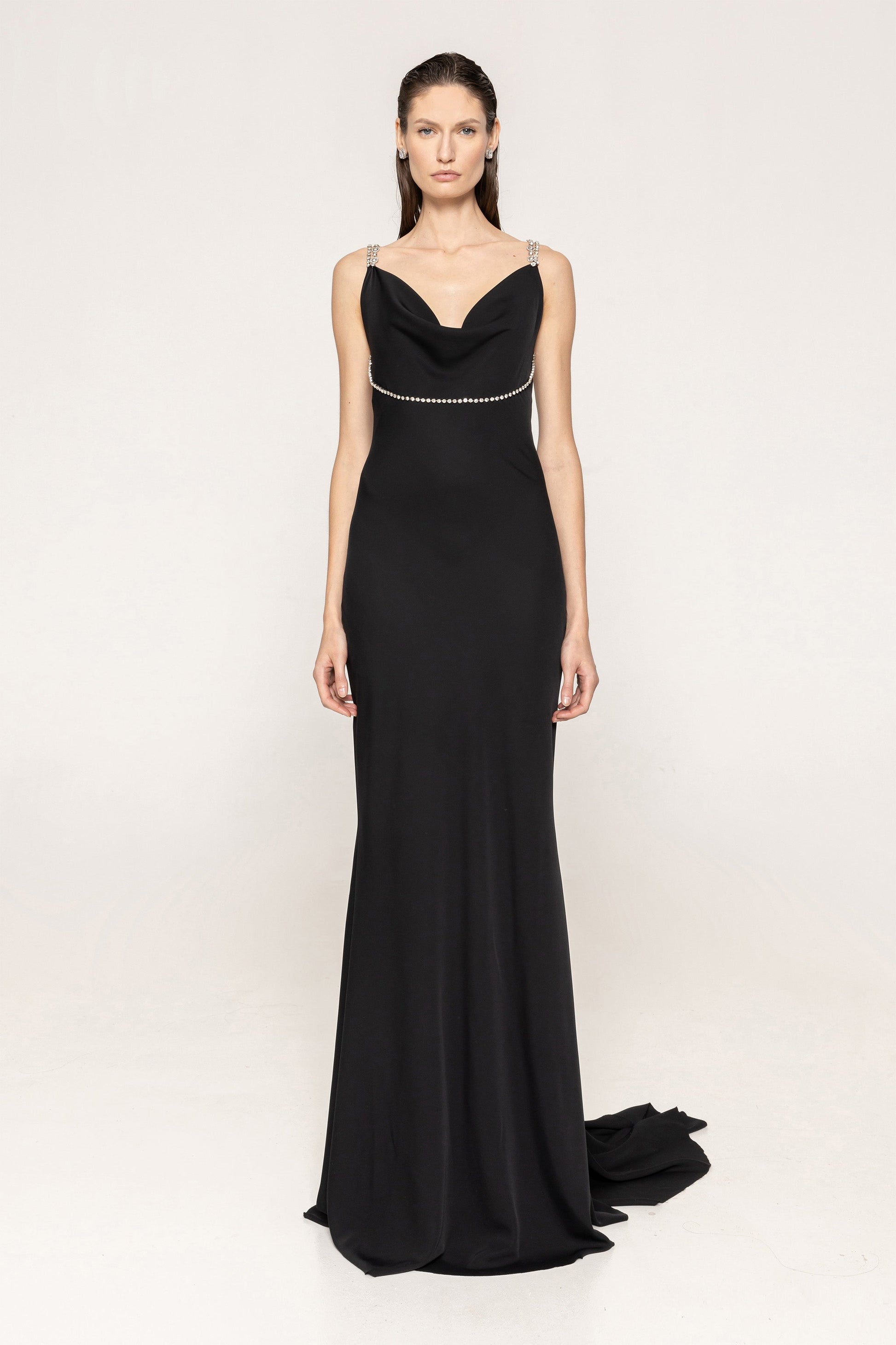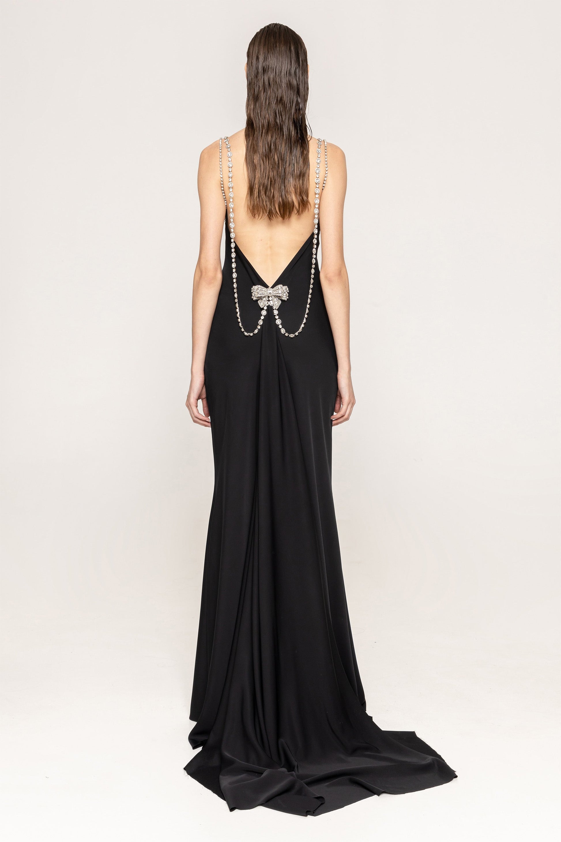 Elegant and dramatic, this black open-back gown features a sweeping train and shimmering crystal embellishments. Perfect for formal galas, evening banquets, or showstopping moments.