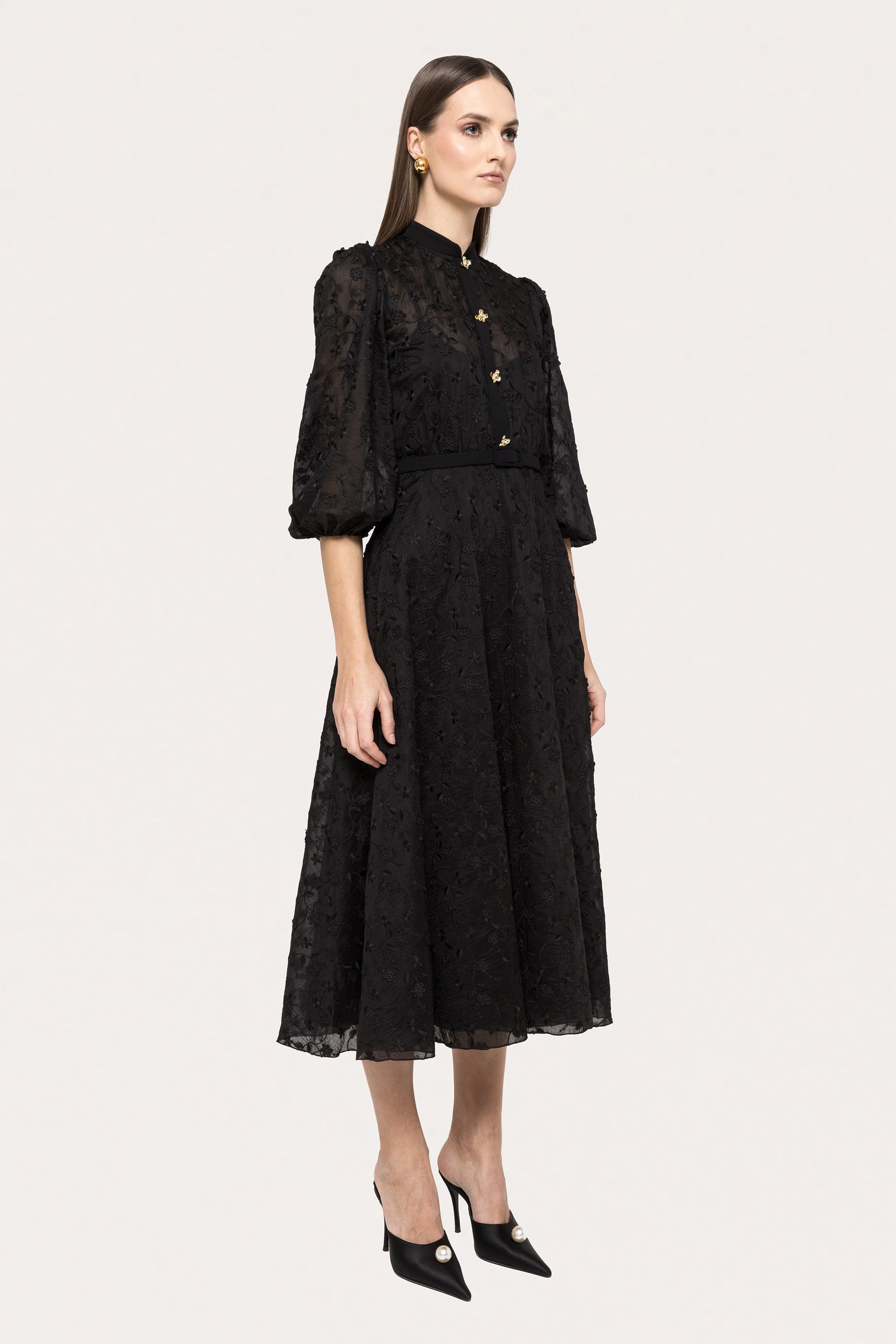 Light and graceful, this lyocell midi dress showcases delicate floral embroidery. A beautiful piece for daytime events, relaxed weddings, or garden soirées.