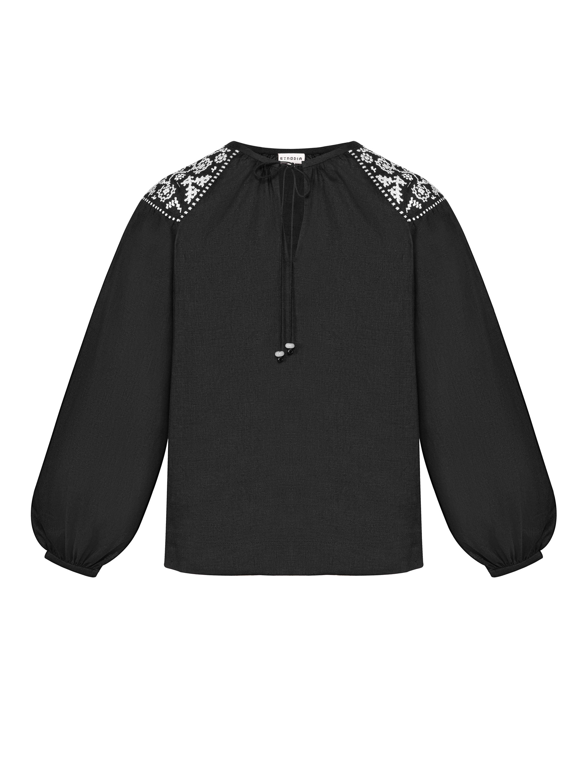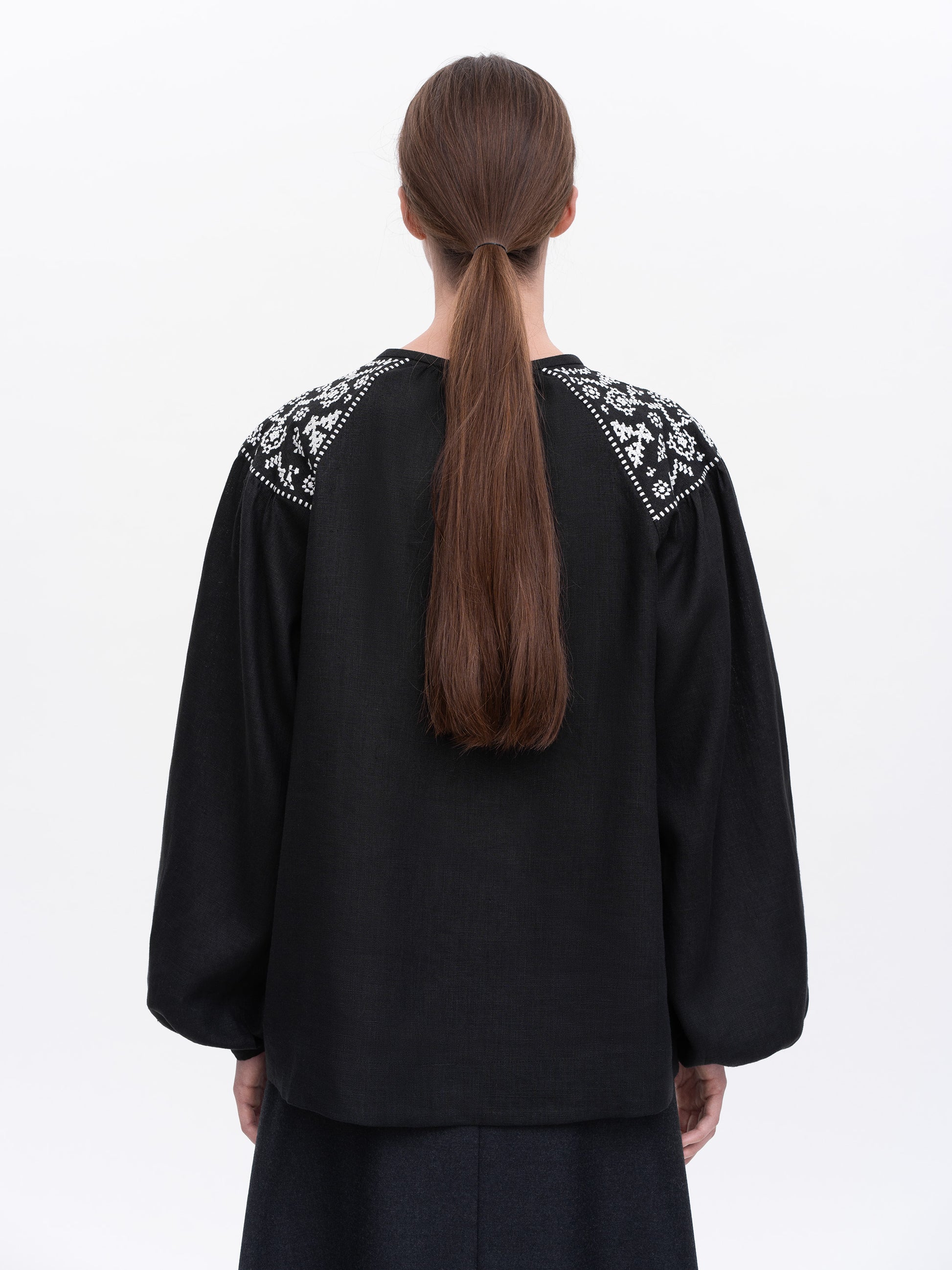 A fine floral ornament follows the rhythm of ancient hand stitches. It is placed on shaped sleeve panels that reference a key element of the traditional shirt — Ustavka (a distinctive insert).