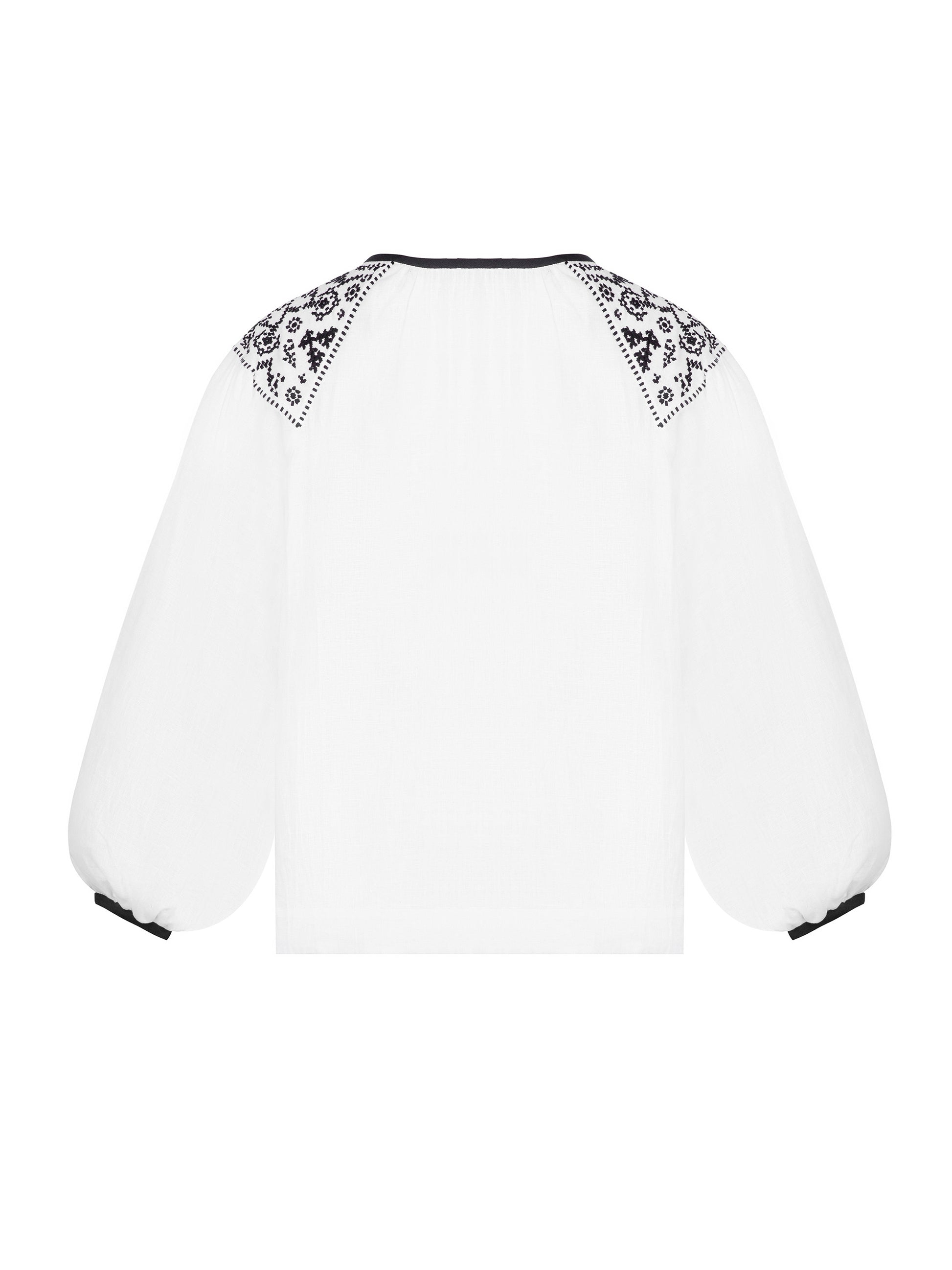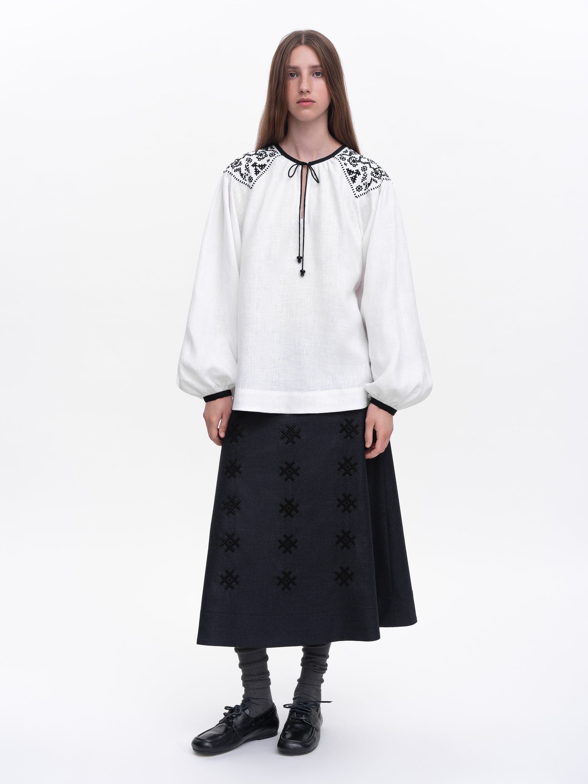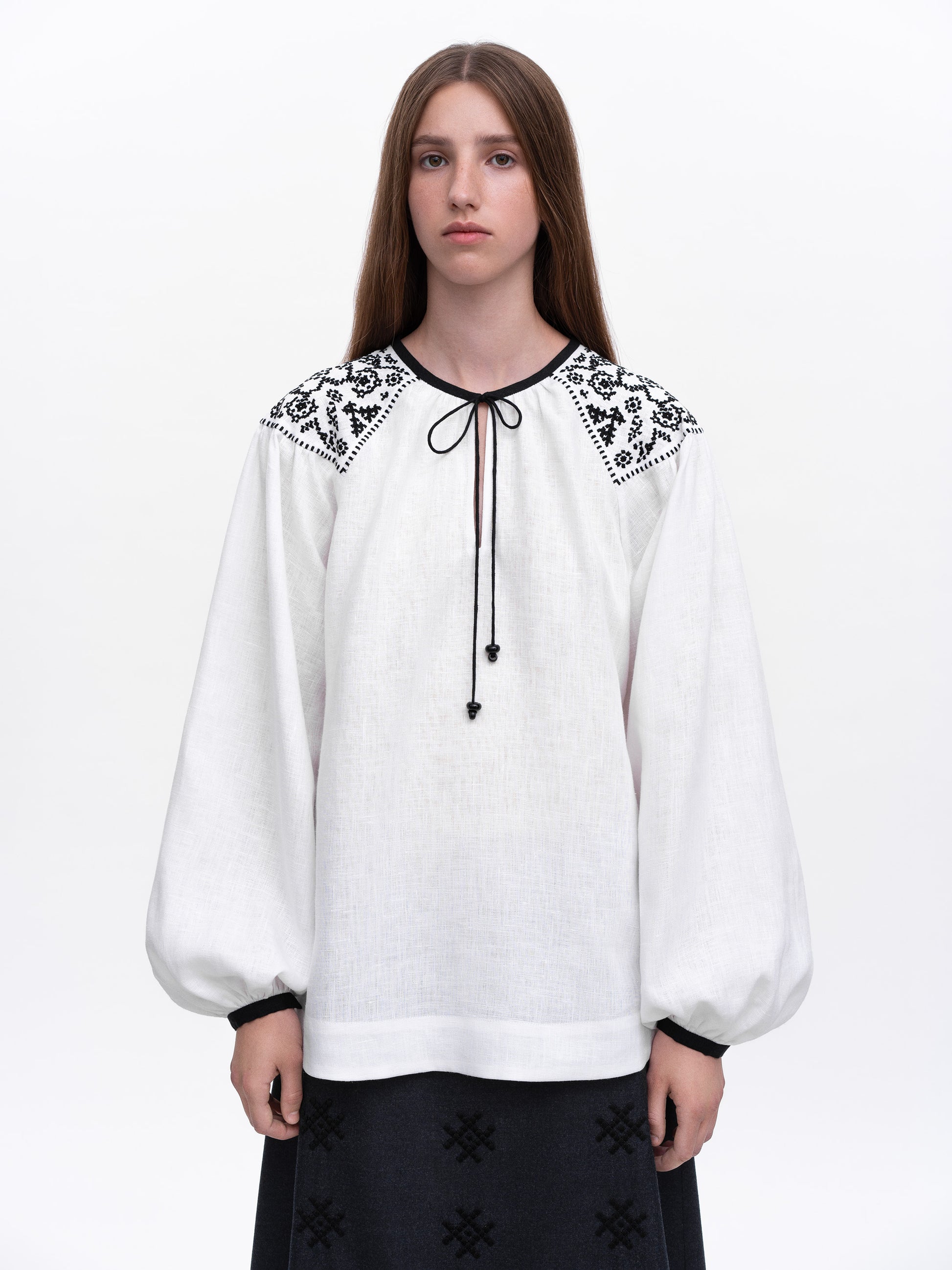 A fine floral ornament follows the rhythm of ancient hand stitches. It is placed on shaped sleeve panels that reference a key element of the traditional shirt — Ustavka (a distinctive insert).