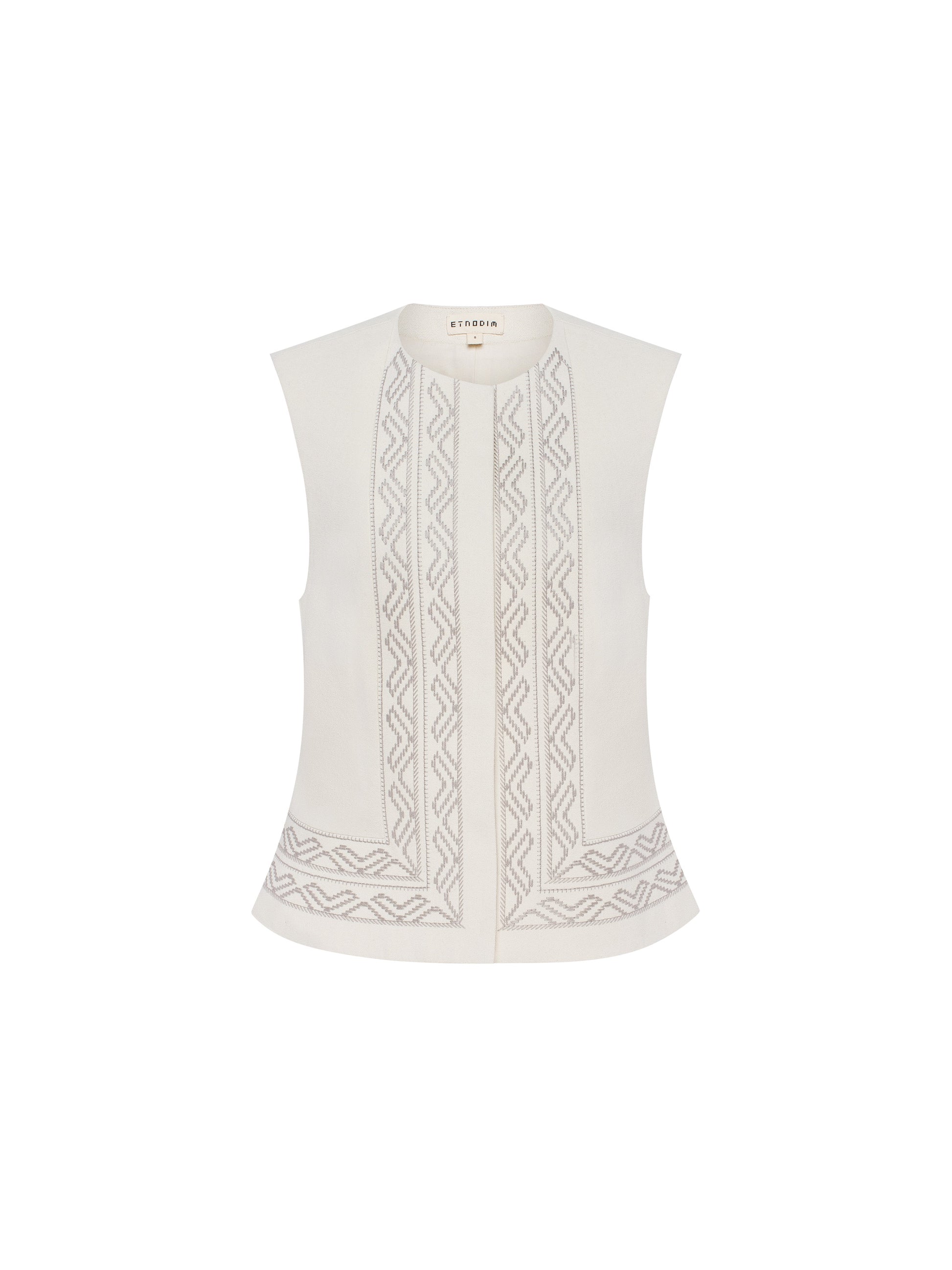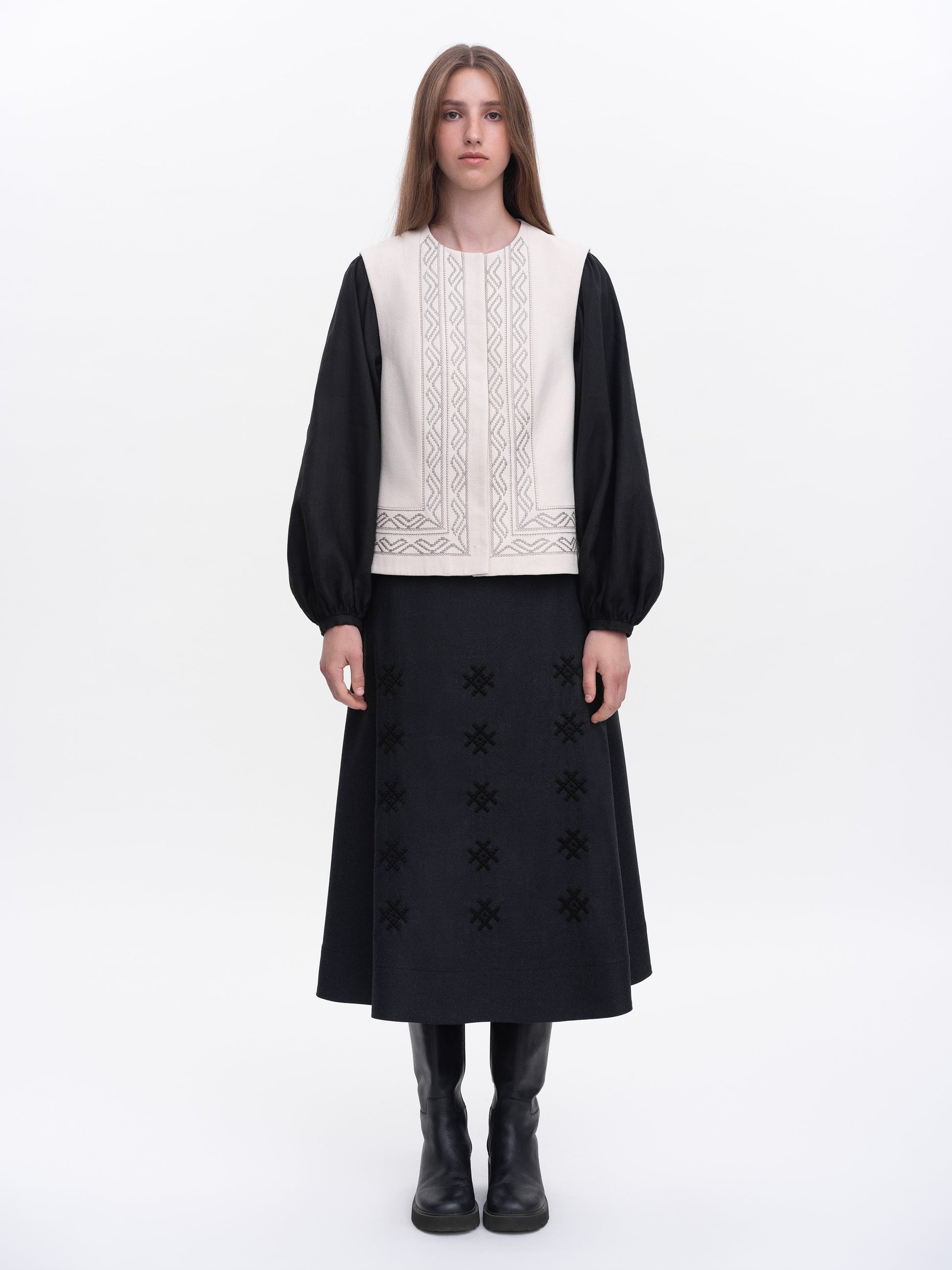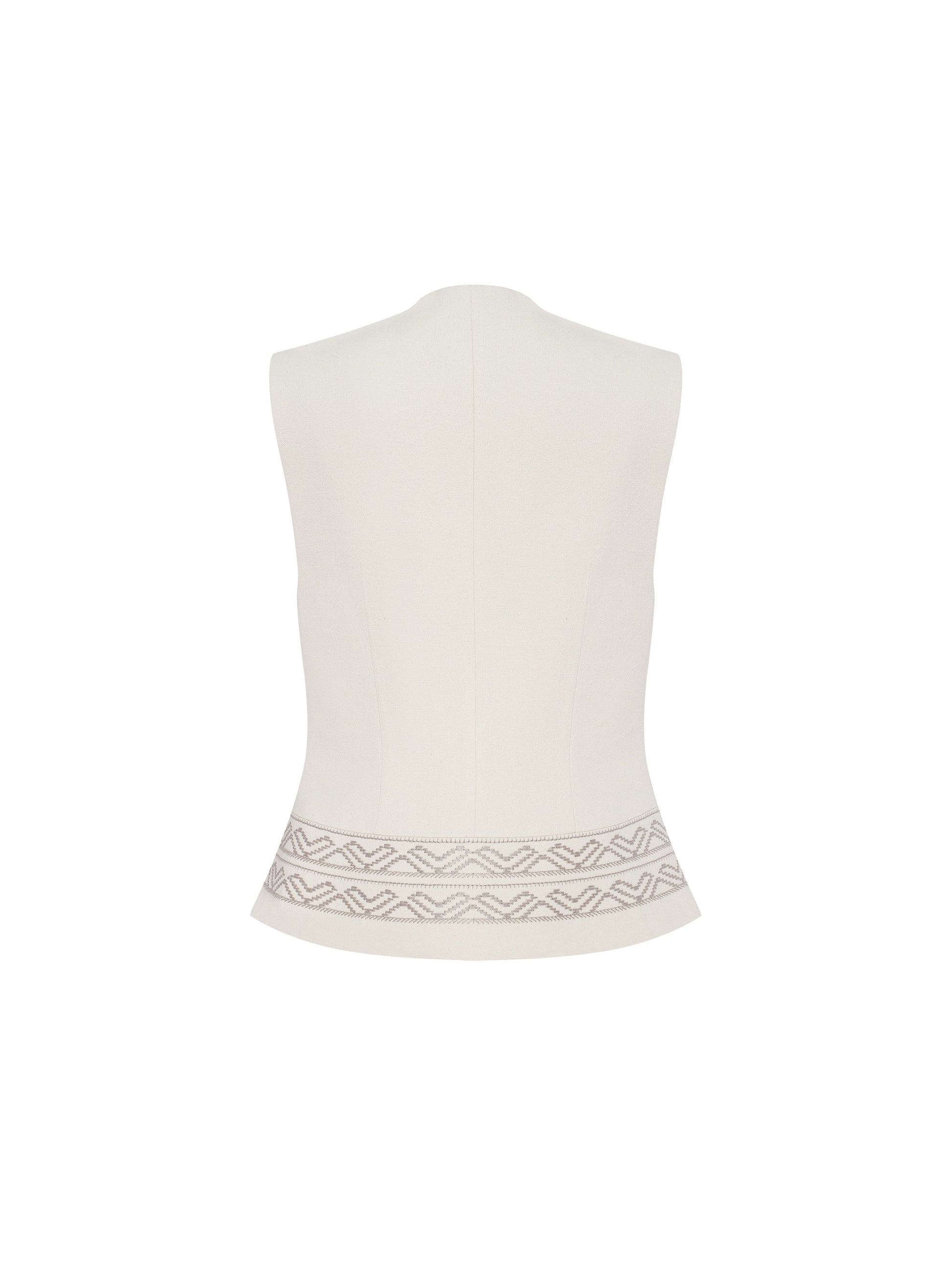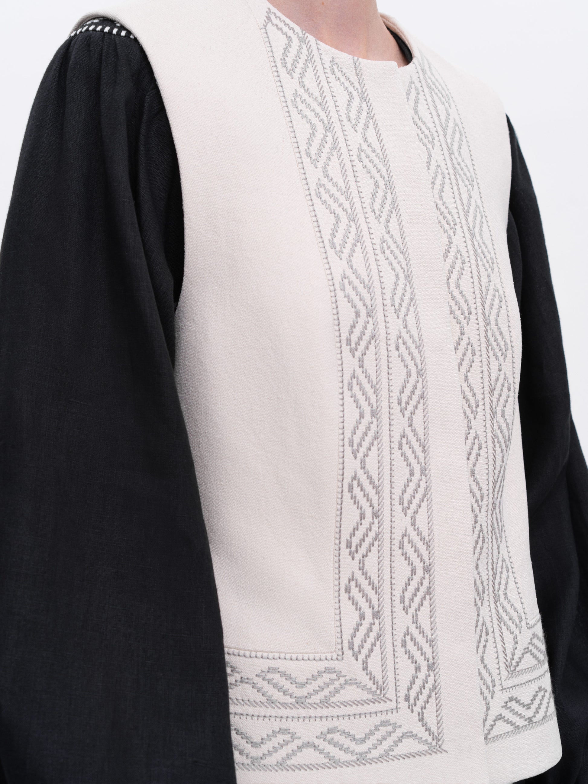 Milky-white vest made of wild silk. This natural material is spun from short fibers, creating a textured, dense fabric that retains warmth.
