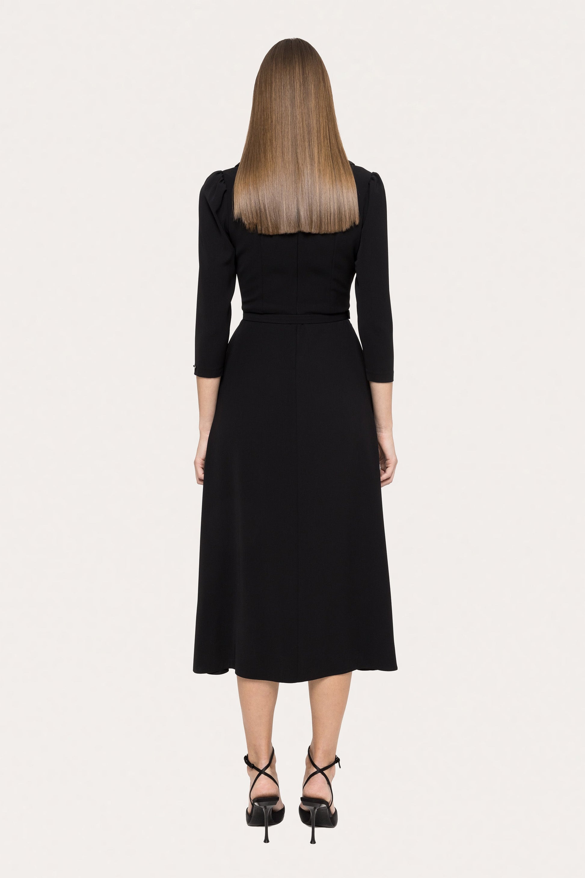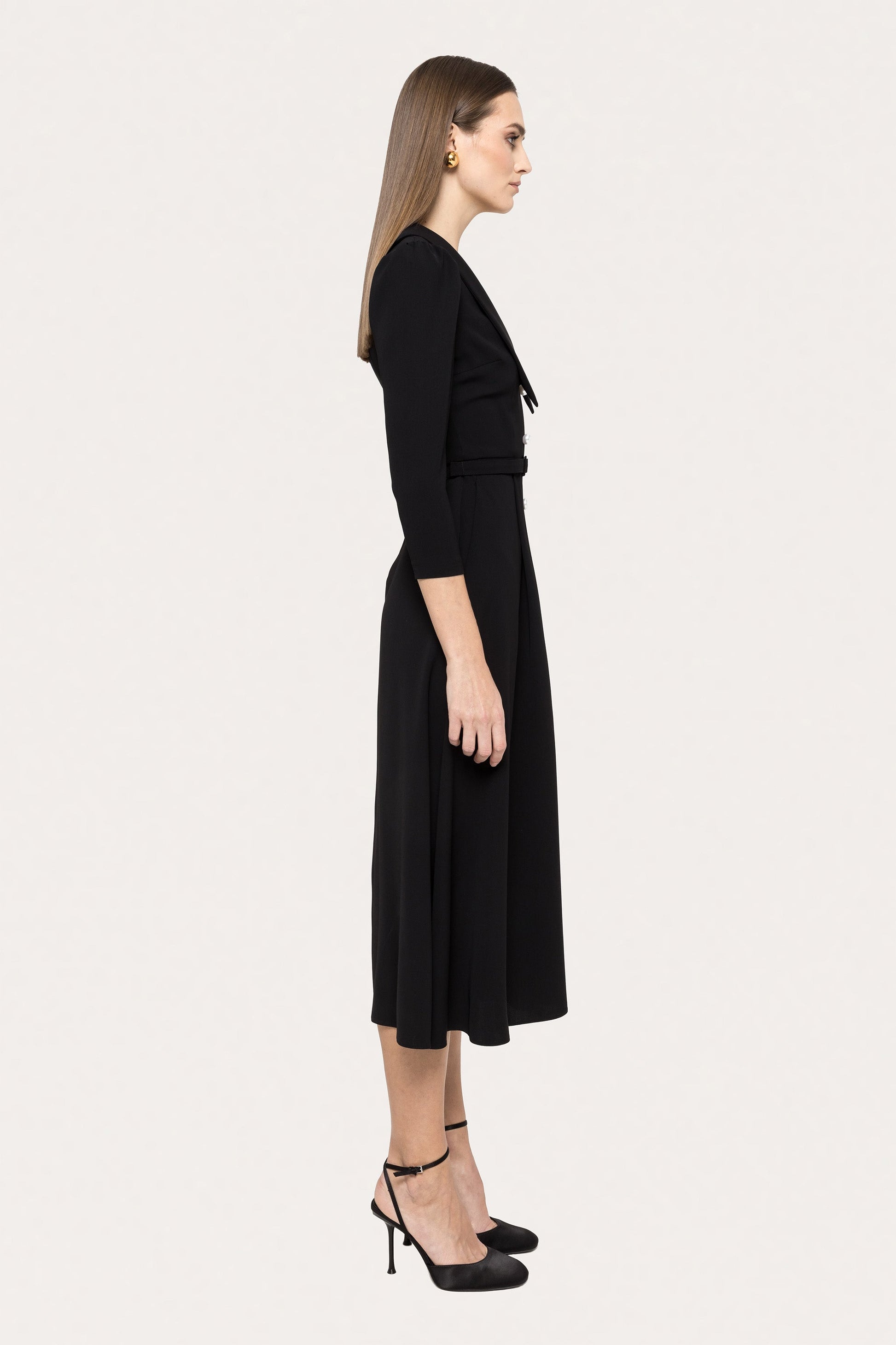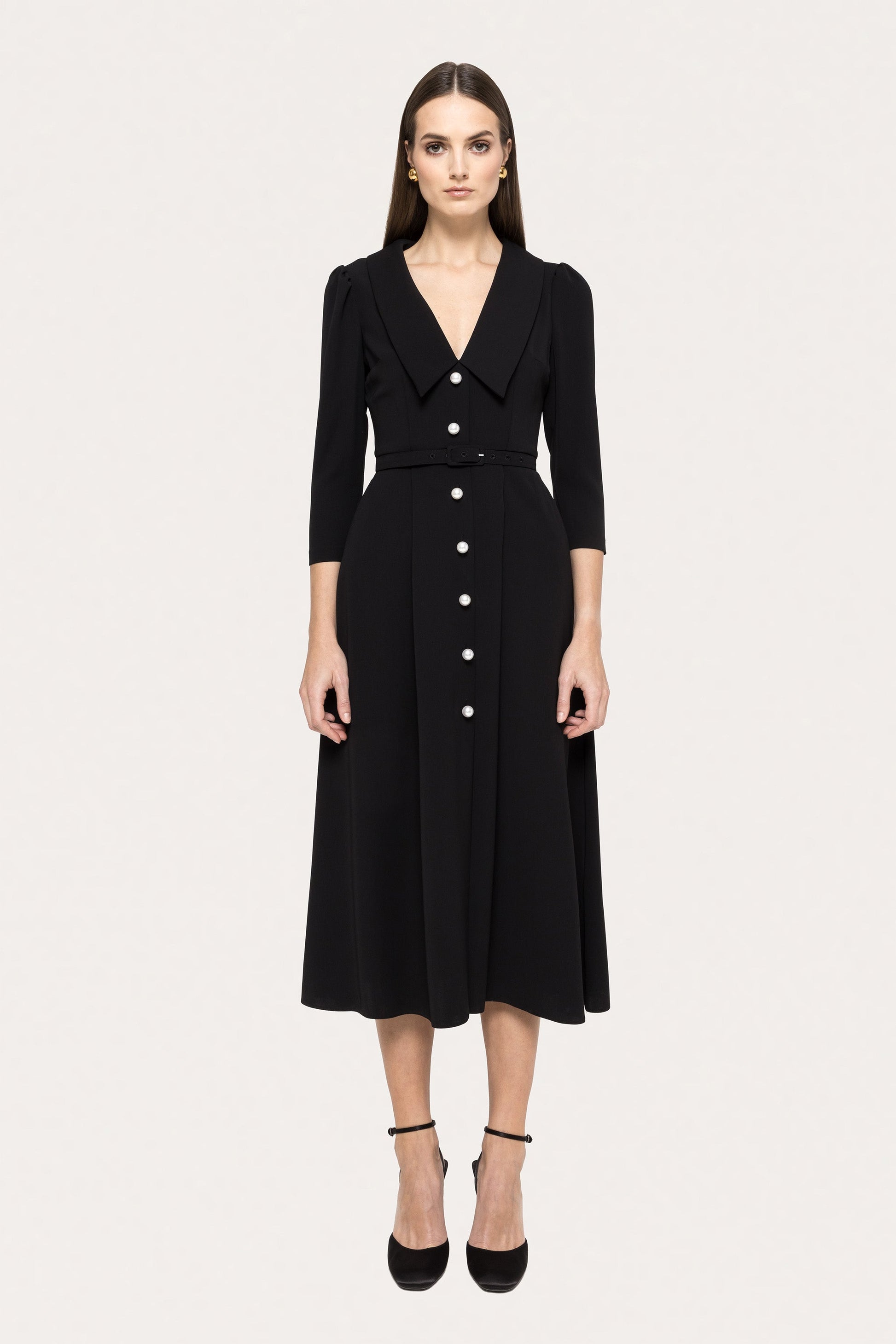 Timeless and polished, this black midi dress features faux-pearl buttons for a touch of elegance. Perfect for office wear, meetings, or graceful day events.