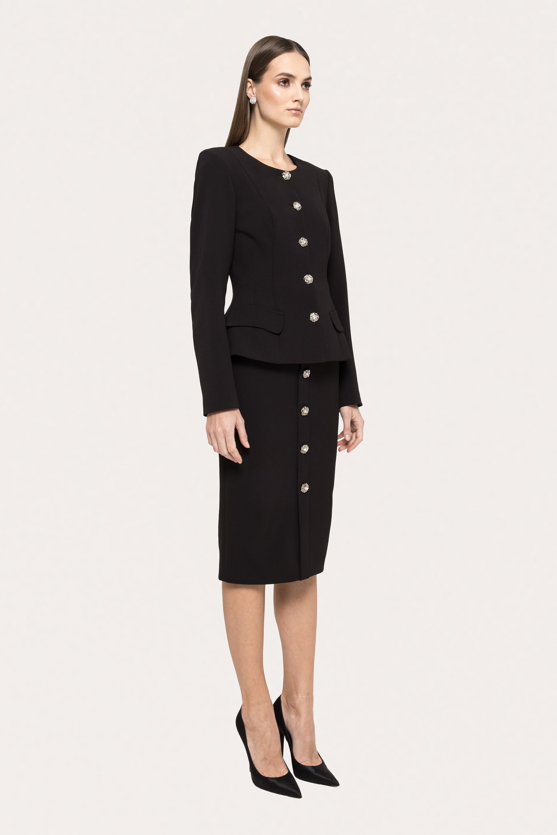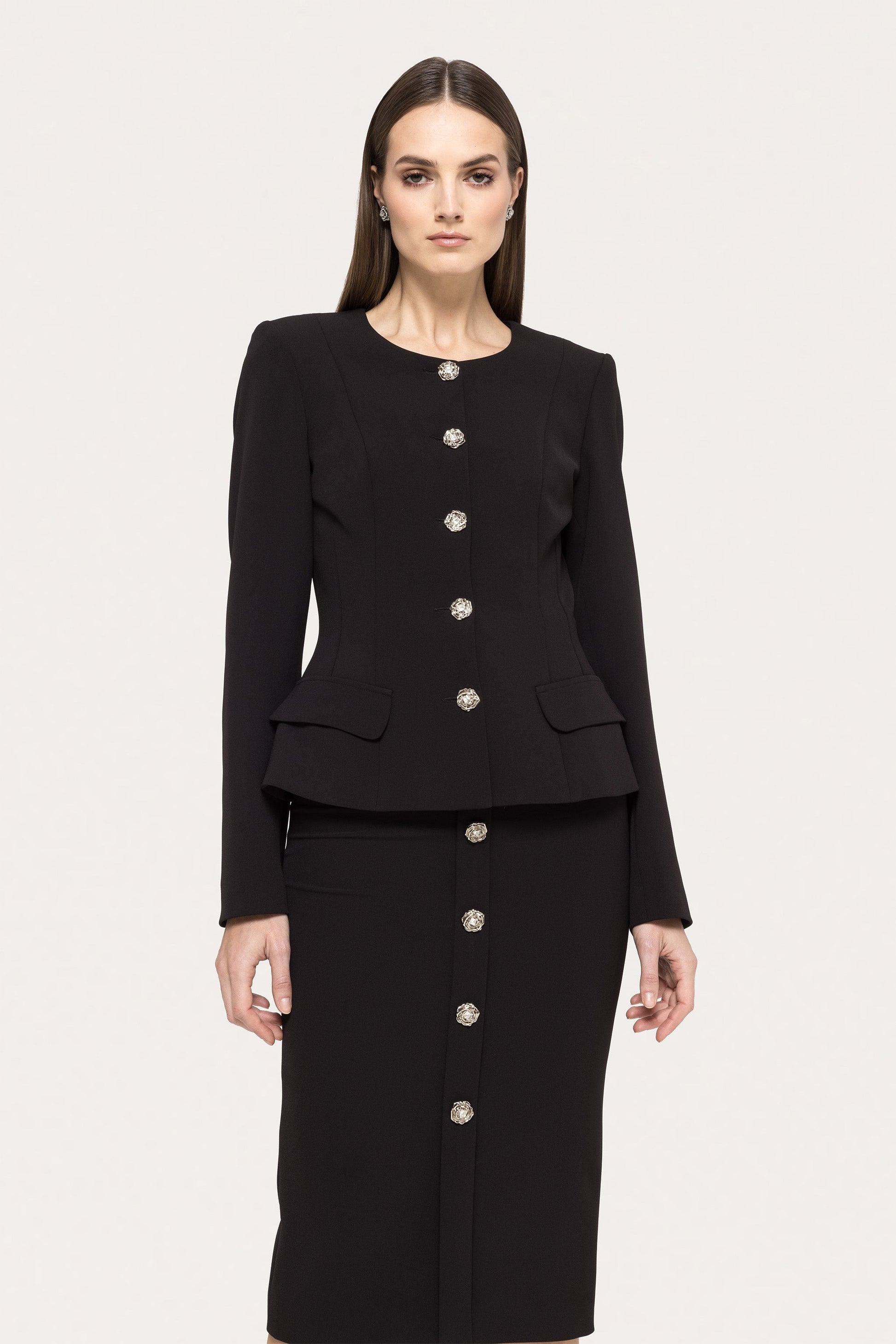Sleek and structured, this black fitted jacket offers sharp tailoring for modern elegance. Wear it from office hours to evening dinners with ease.
