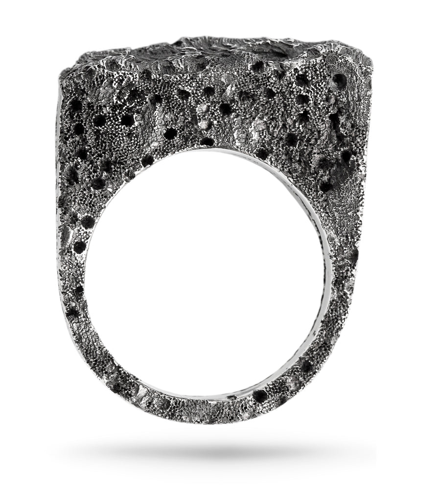 Explore the ocean’s hidden elegance with the Heliopora Ring from the Coral Shadow Collection. Crafted from black vintage silver, this ring captures the raw beauty and intricate textures of petrified corals, offering a truly unique piece that reflects the tranquil mystery of the ocean depths.