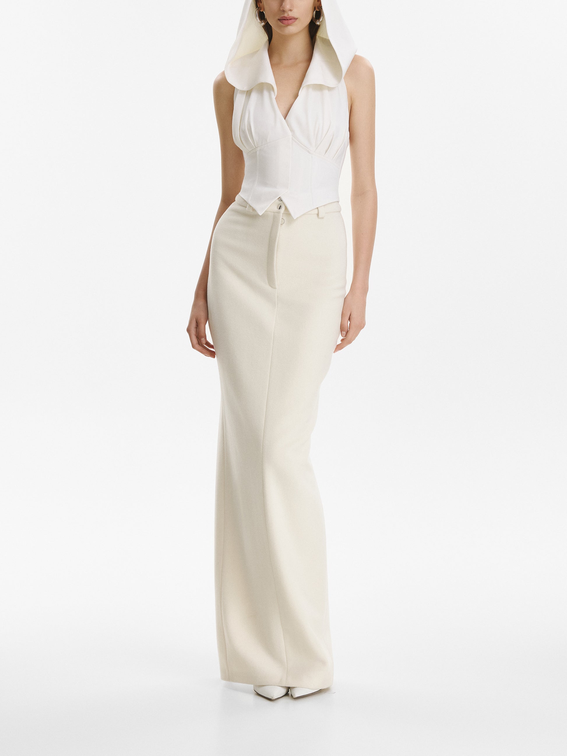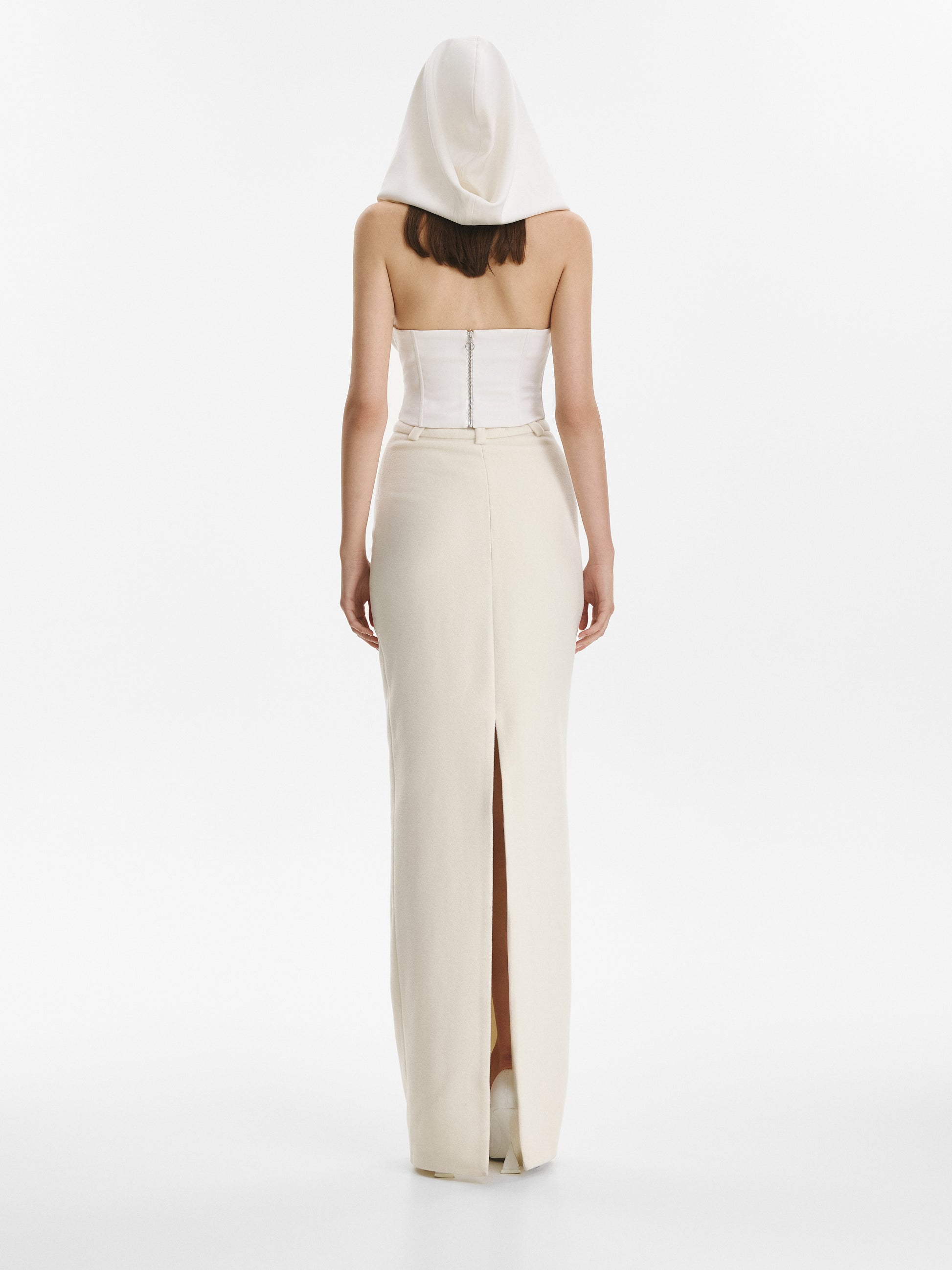 Definitely a wardrobe staple, this piece is crafted in luxurious merino wool, featuring a figure sculpting open back corset, accented with brand’s signature silver buttons, while the oversized hood adds a dramatic finishing touch.