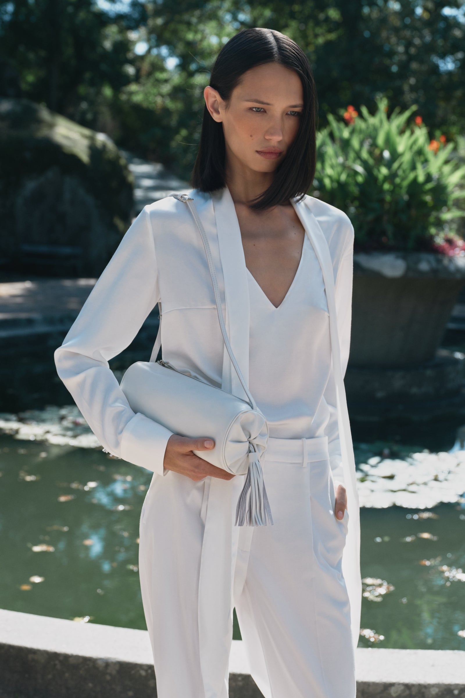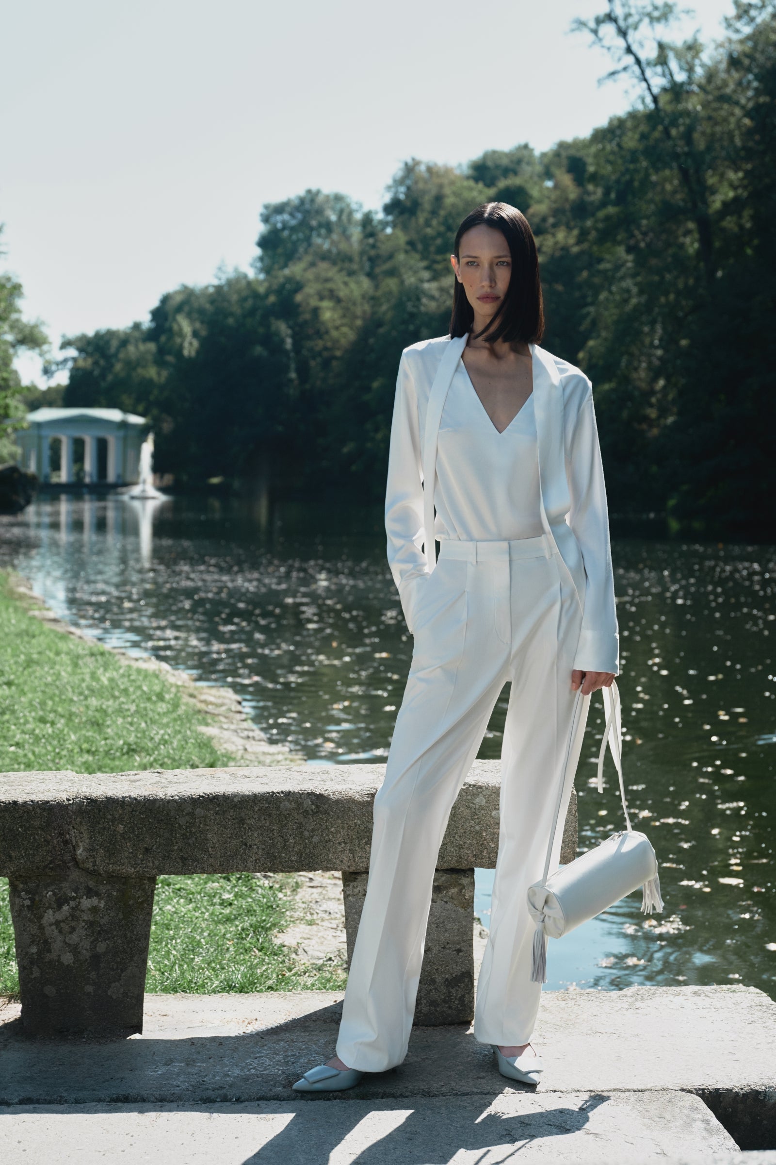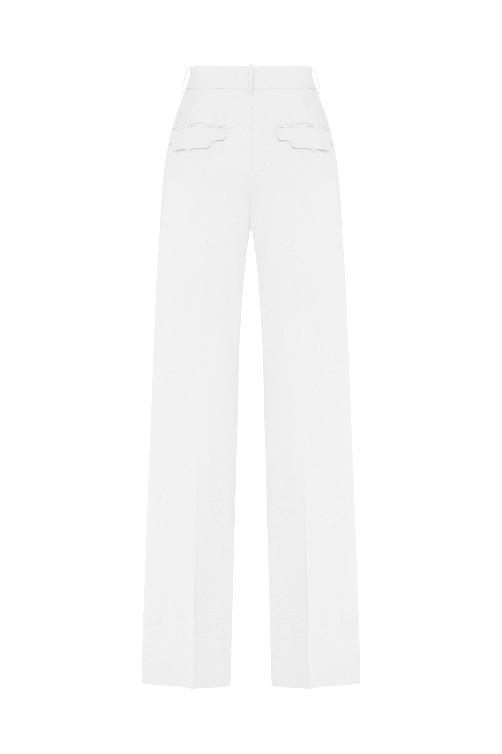 Straight high-waisted trousers in viscose with front pleats. Features side and back flap pockets
