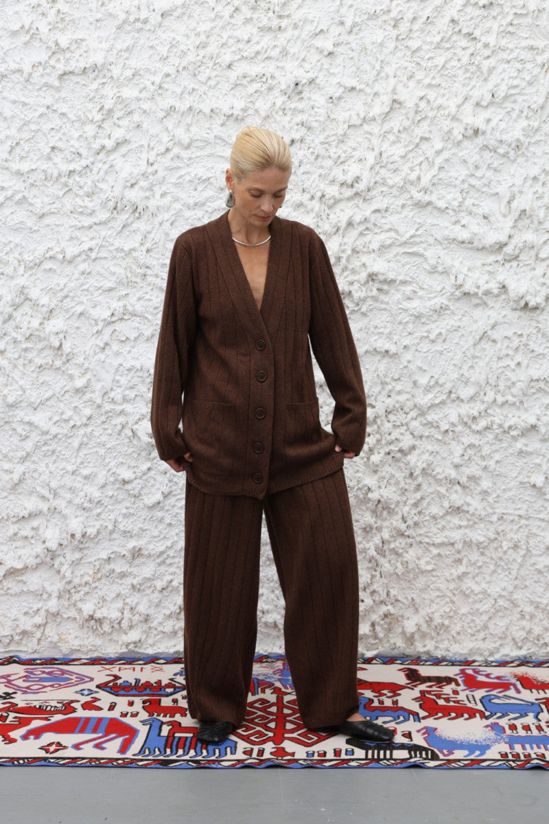 Full-length knit pants made of wool yarn with a smooth knit featuring voluminous vertical stripes that change direction at the tapered sections. High-rise fit with an elastic waistband. Loose from the hips and dramatically tapered at the ankles.