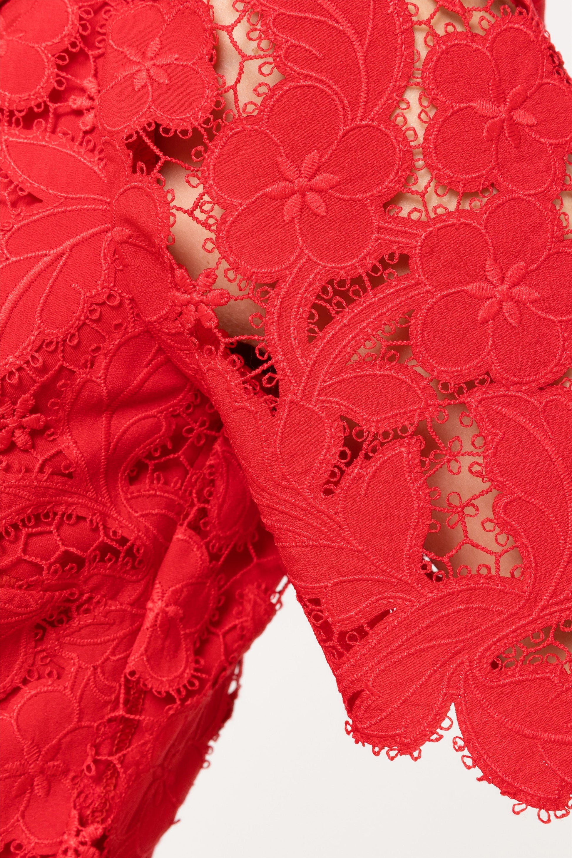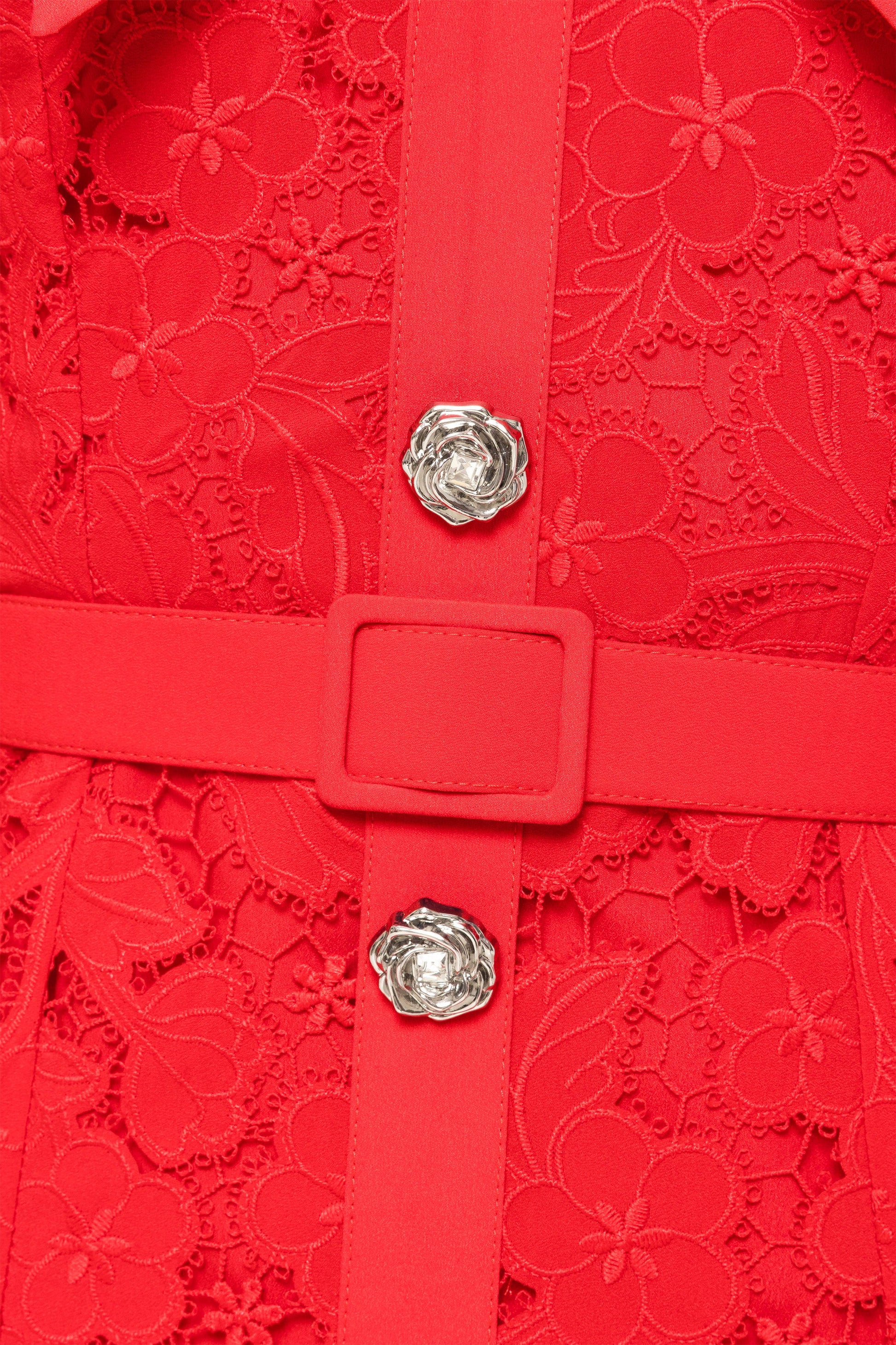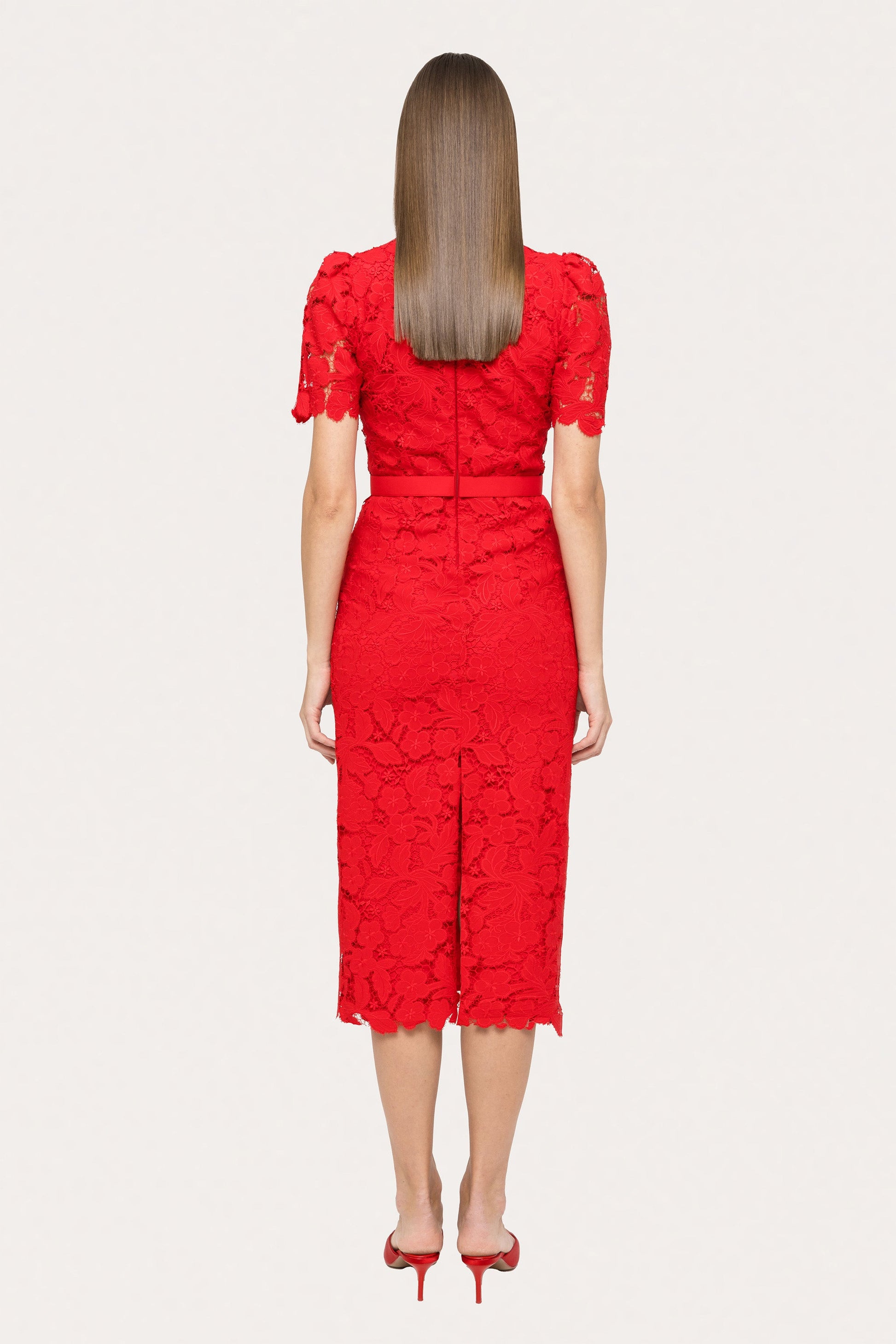 Elegant and sultry, this red lace bodycon midi dress features short sleeves and a figure-hugging silhouette, ideal for cocktail parties and formal events.