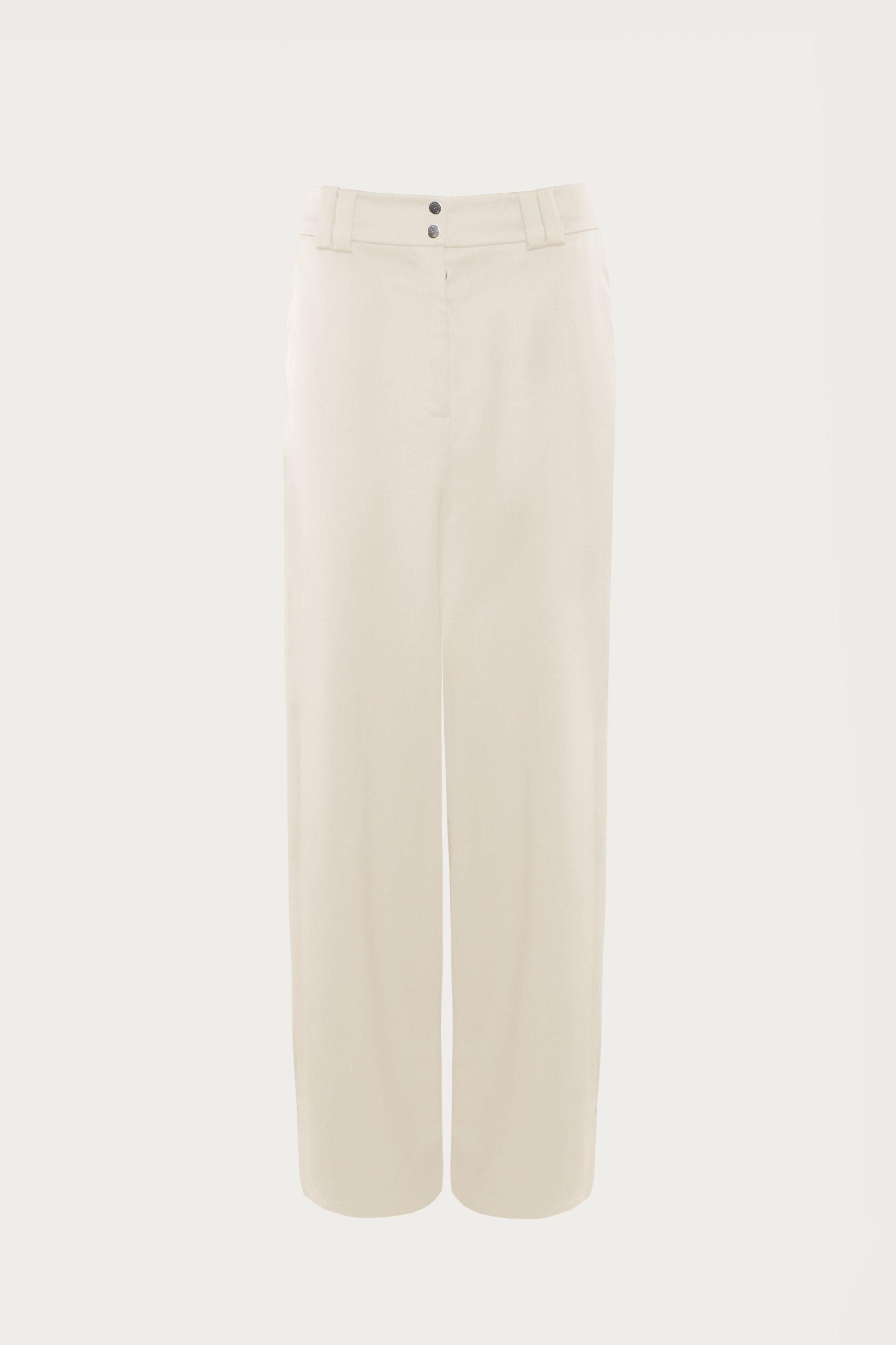 These wide-legged trousers, crafted from lightweight wool, offer a relaxed fit with a comfortably low drop. Complete with a zipper and snap closure,and side pockets, they ensure both style and ease of wear.