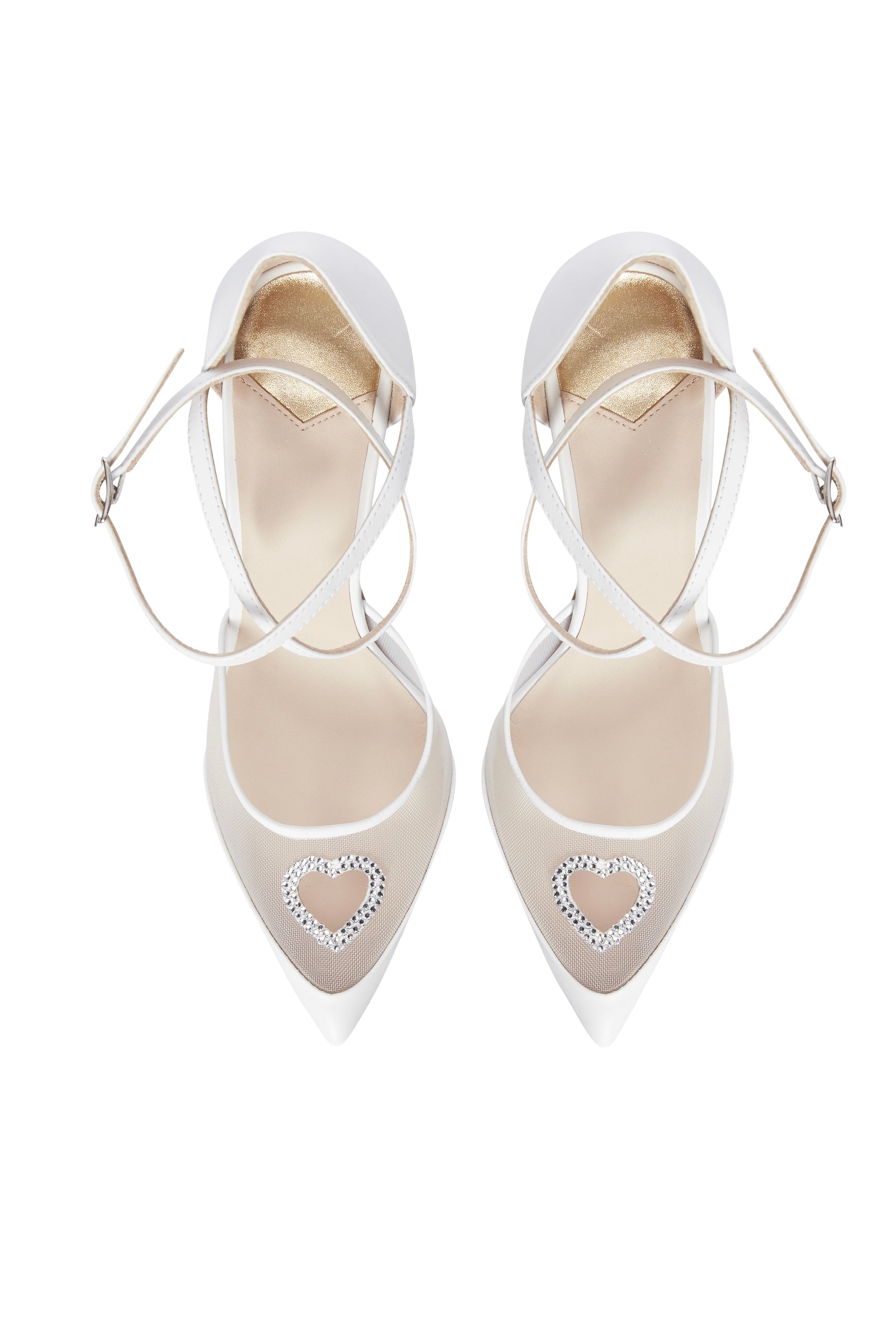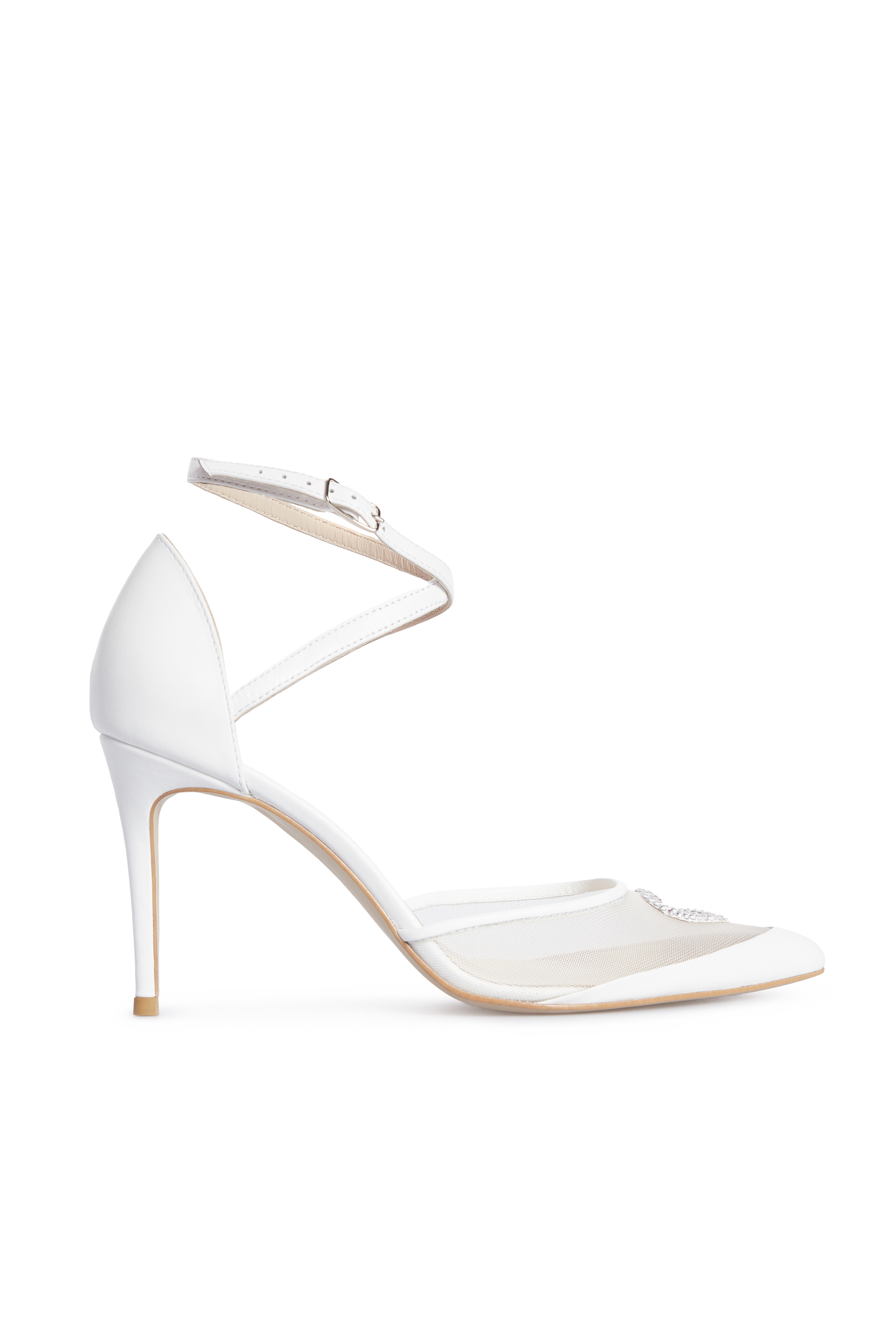 Pointed-toe sandals with 8.5 cm (3.3") heels are made from genuine leather and transparent shoe mesh. The pair features a heart-shaped cutout adorned with decorative rhinestones. The wear-resistant tunit outsole ensures durability, while the soft leather insole with Memory Foam provides added comfort during walking.