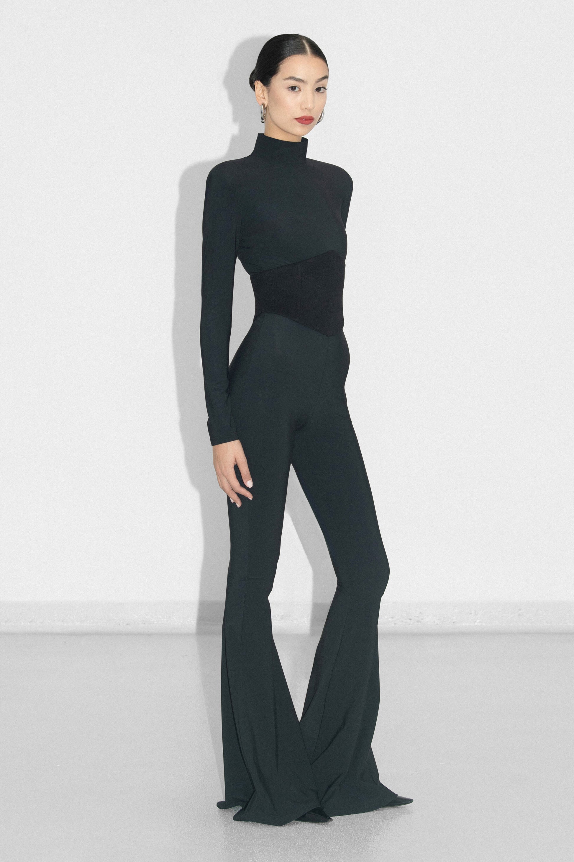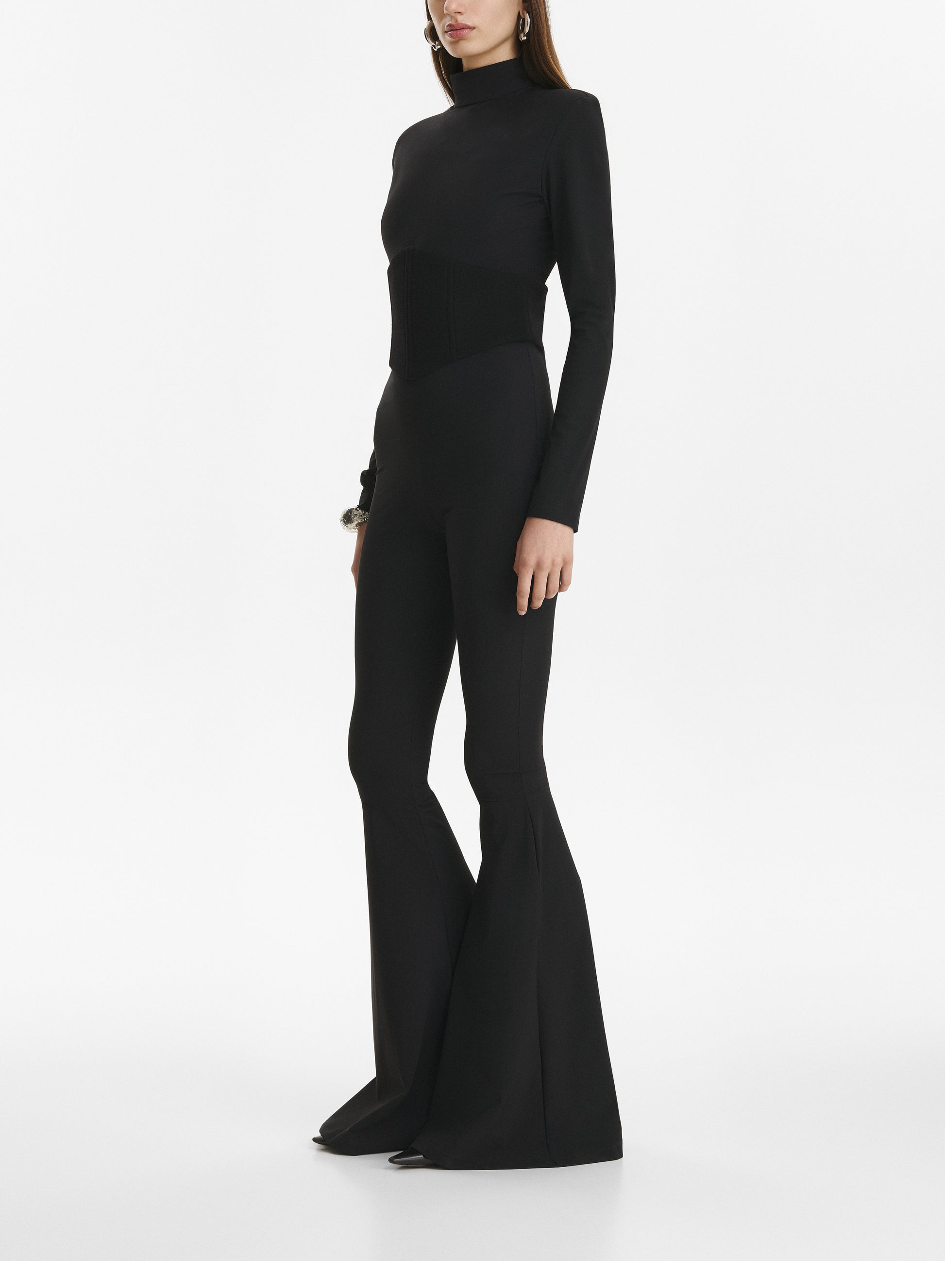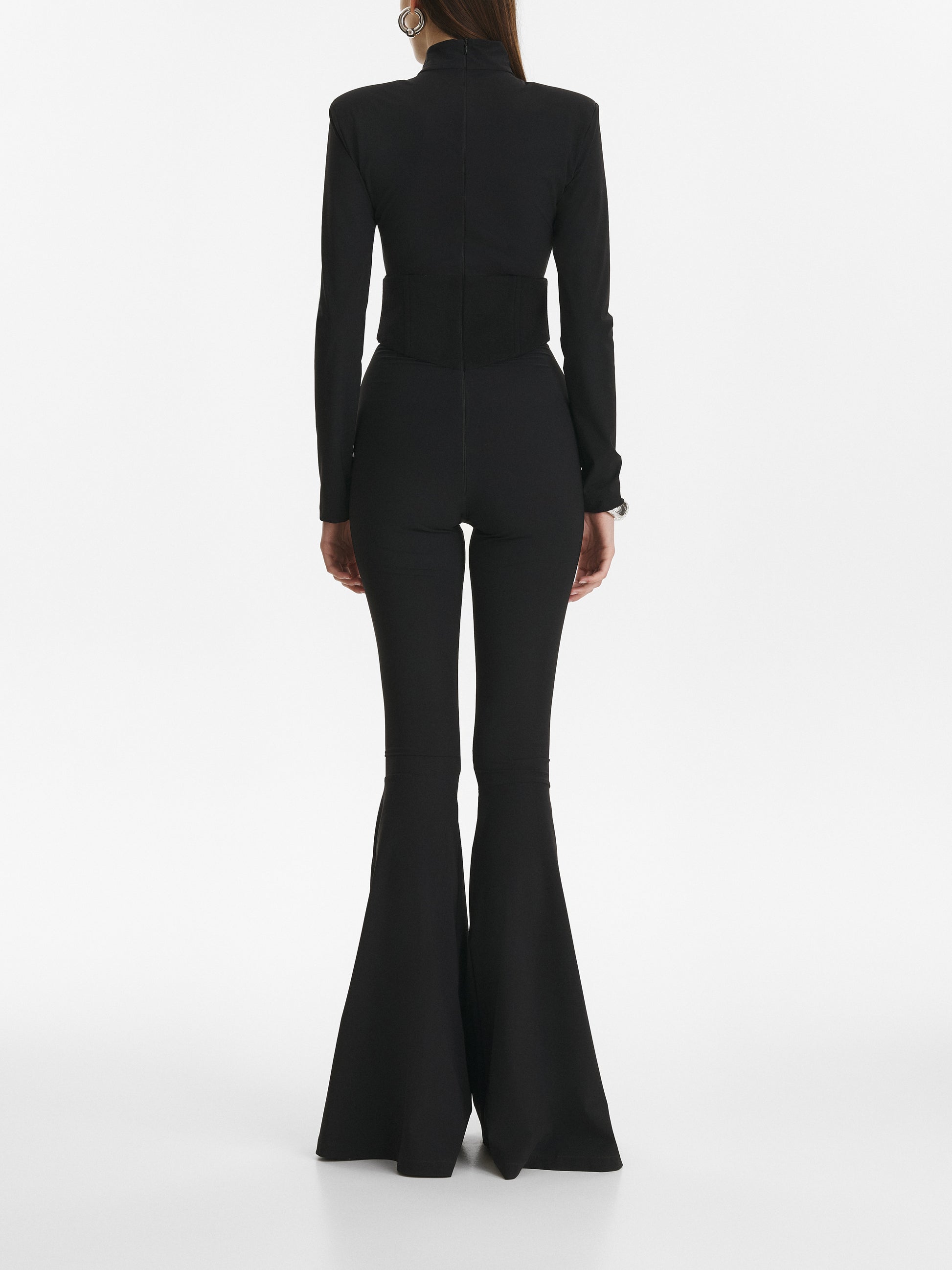 .Inspired by 70s tailoring, this statement jumpsuit is made from lycra fabric with a figure sculpting design. It features a wool corset that highlights the waist, while the flared trousers elongate the silhouette.