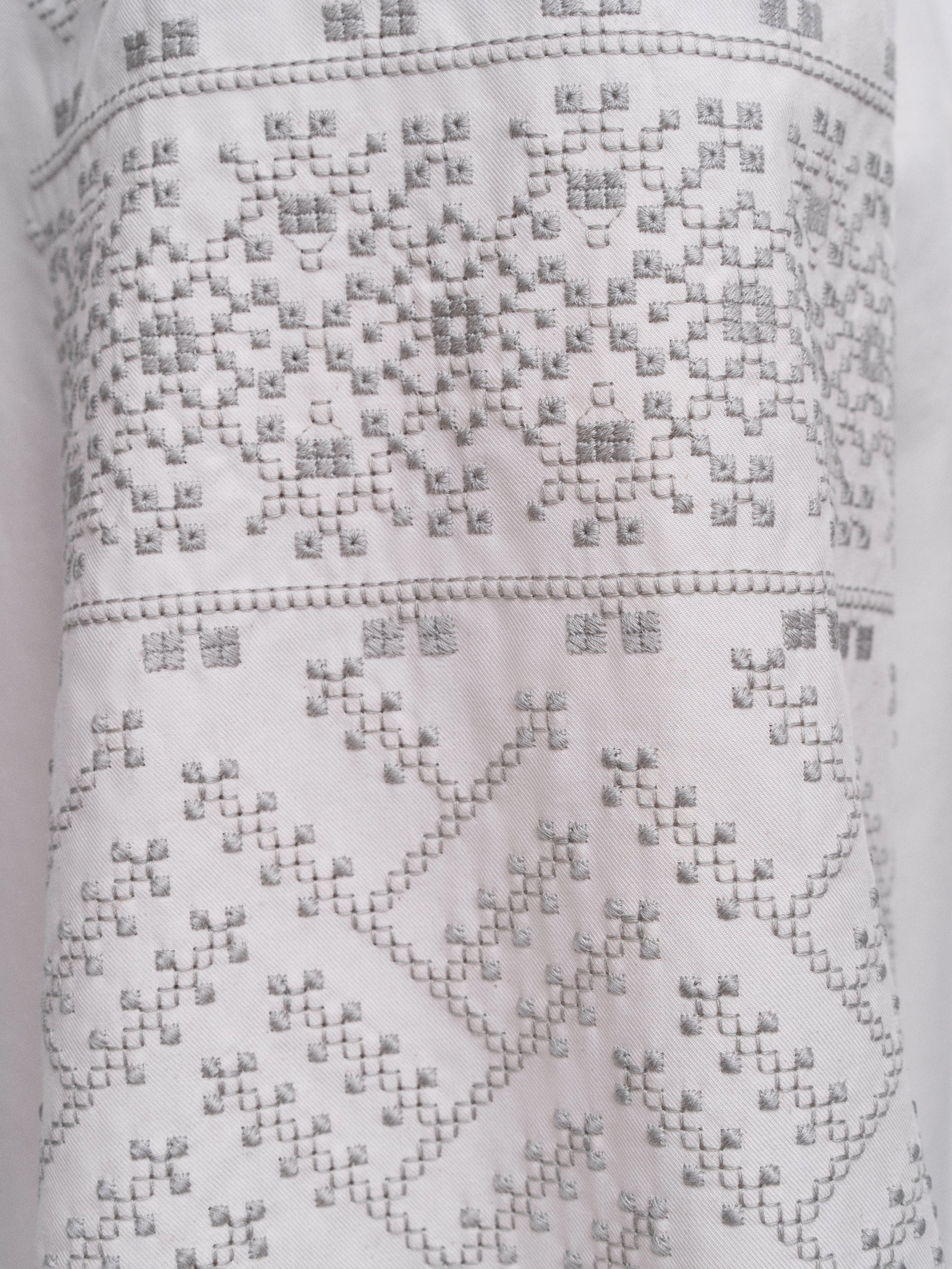 The pattern on the sleeves is inspired by ornamental samples collected by Hanna Hrabovska, a Ukrainian embroidery artist. It is made with light grey threads, a shade that was historically obtained from alder bark.