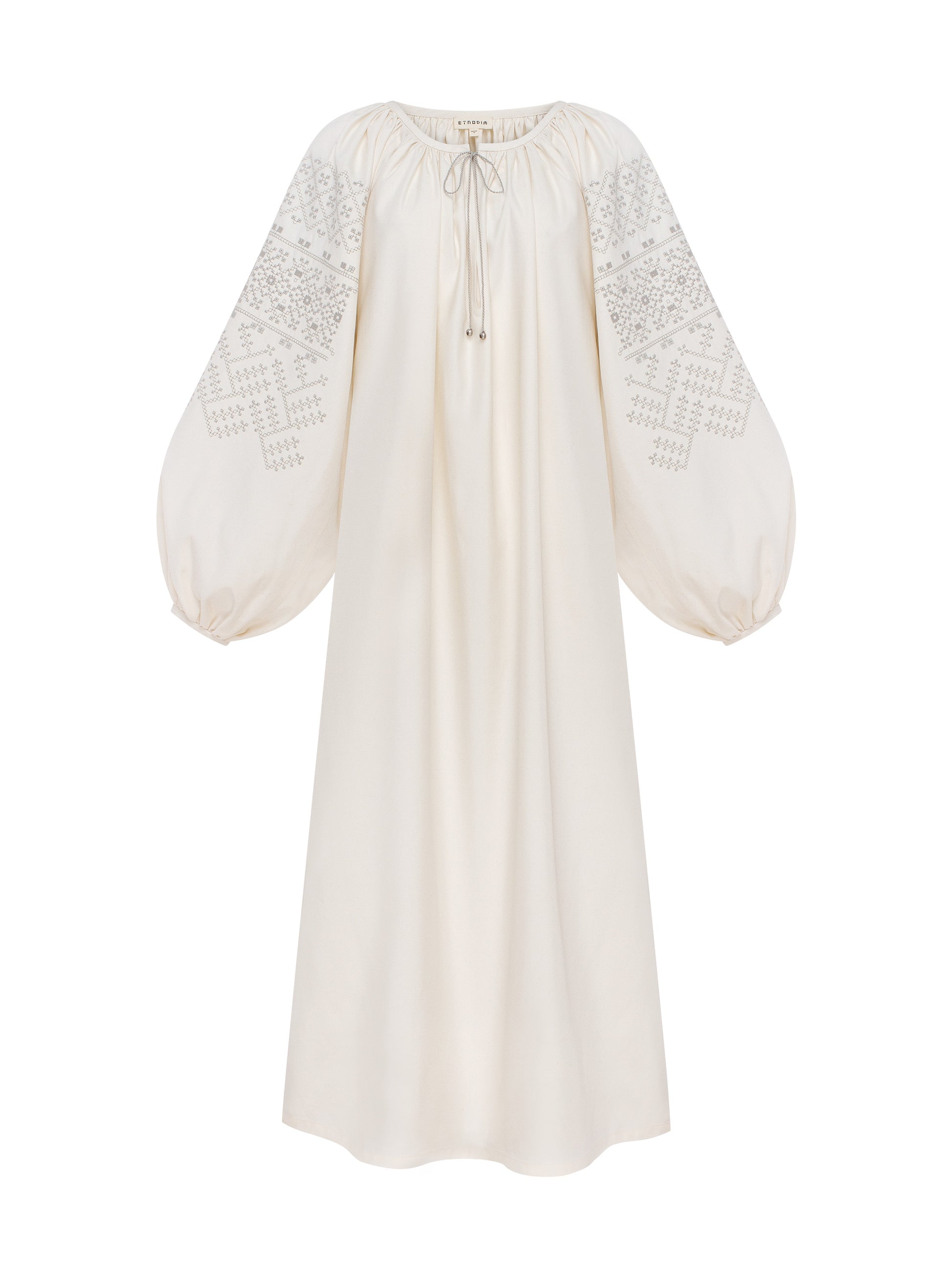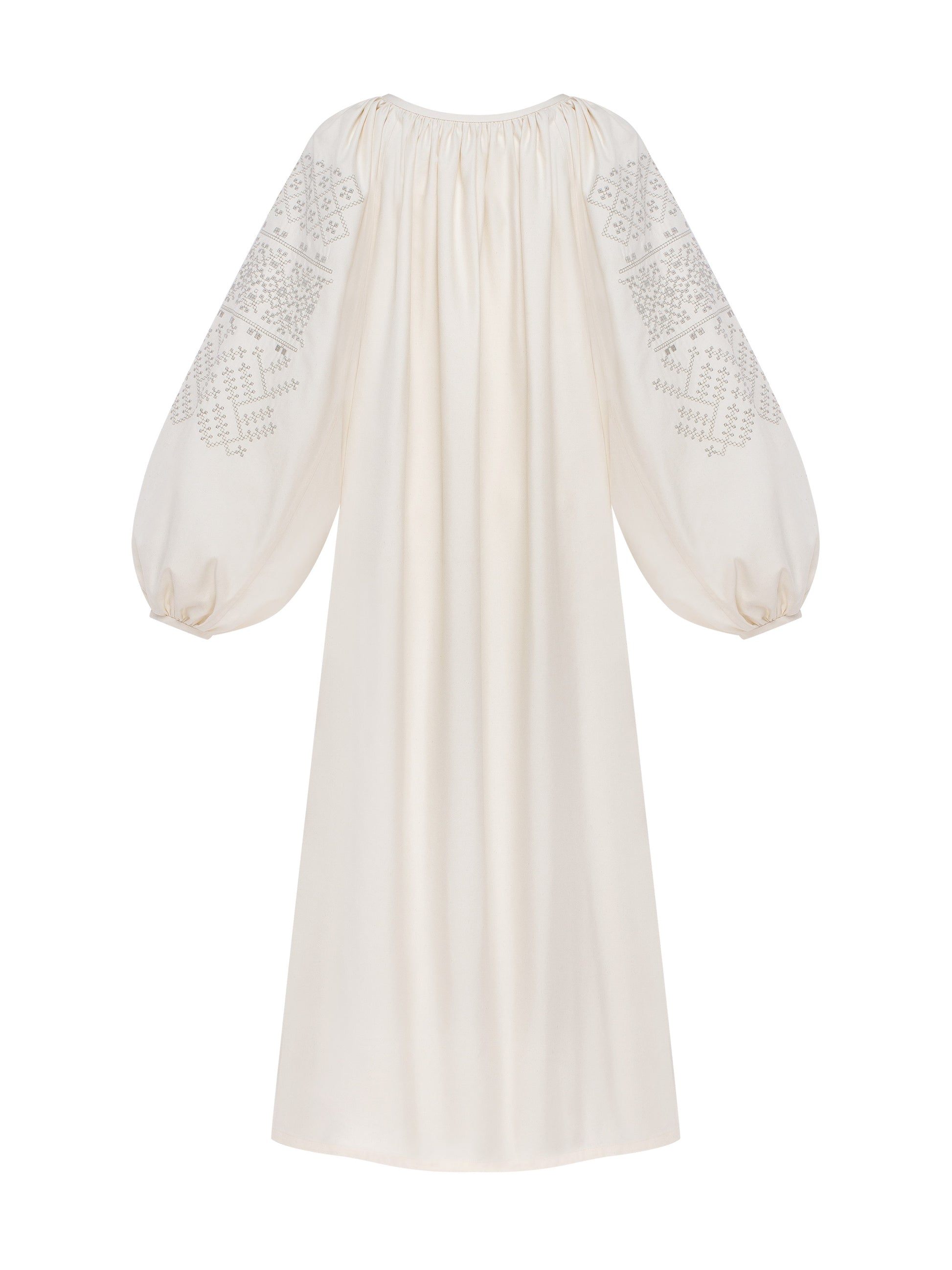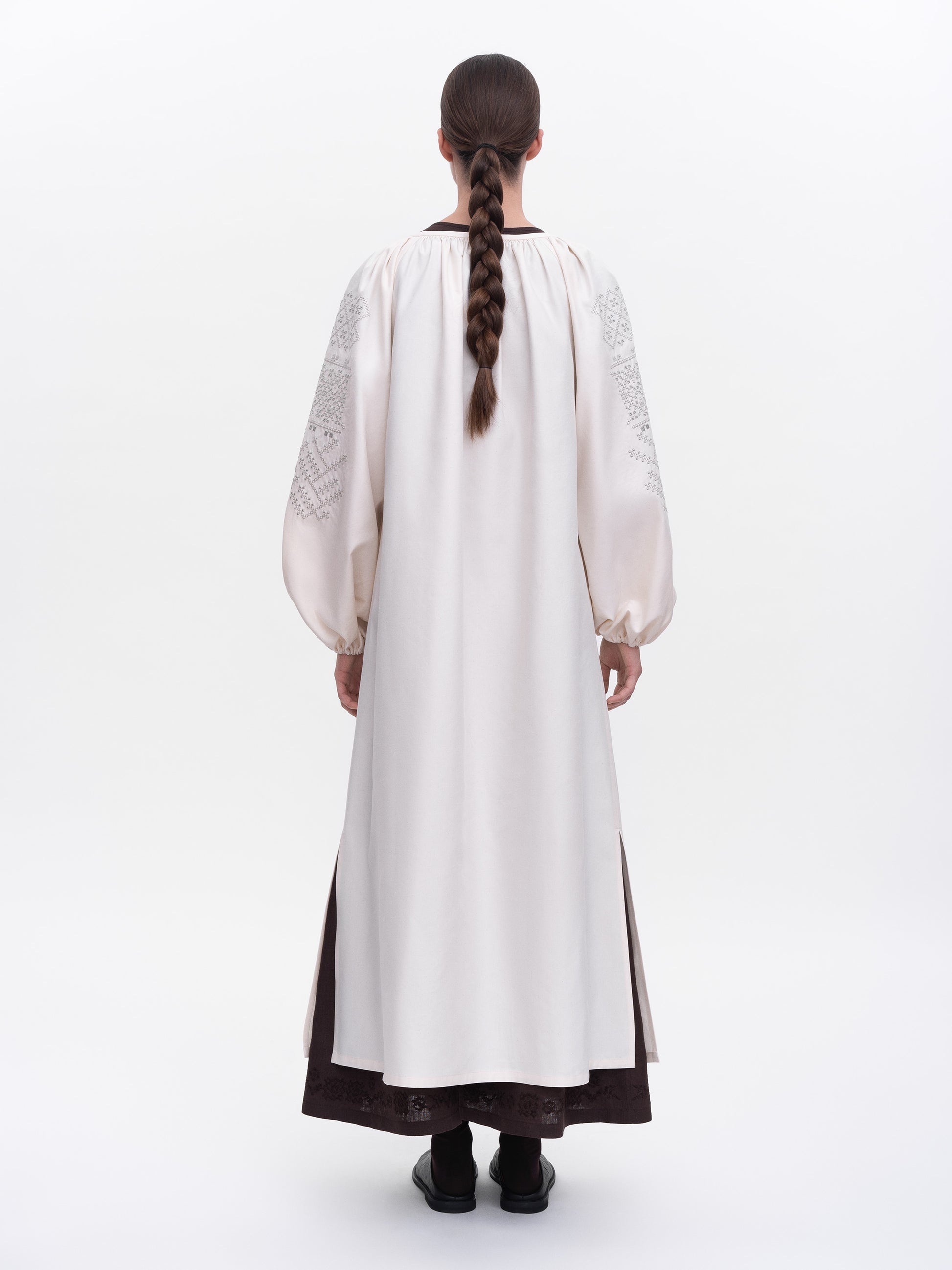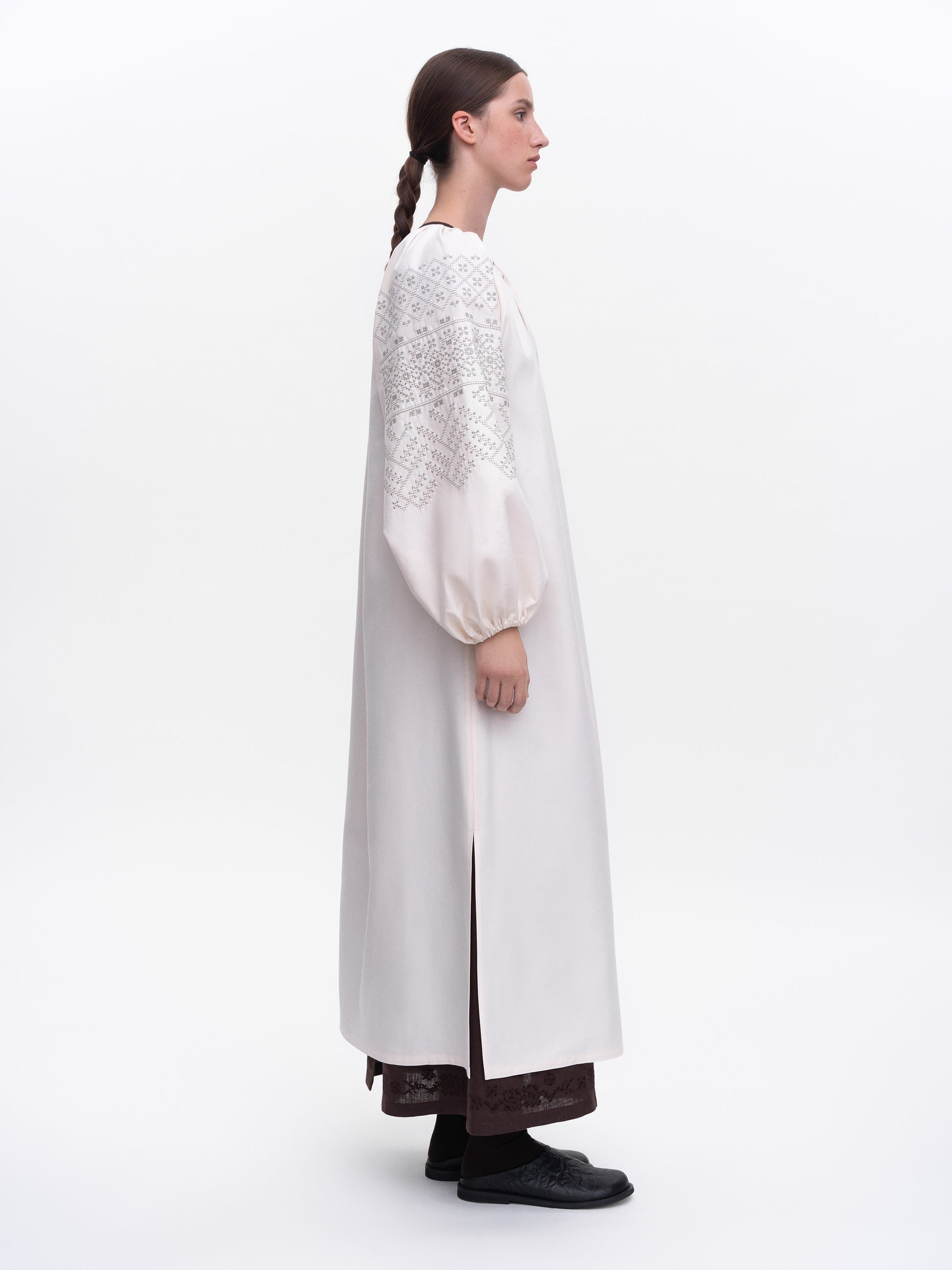 Dress that follows the cut of a traditional Ukrainian shirt, inheriting its length, volume, and wide sleeves gathered at the collar.