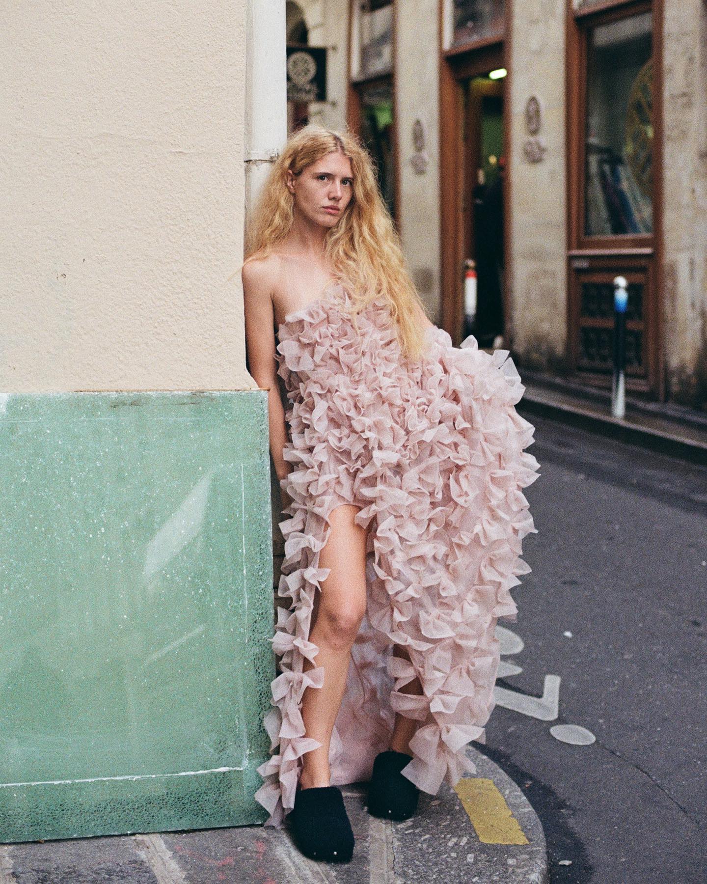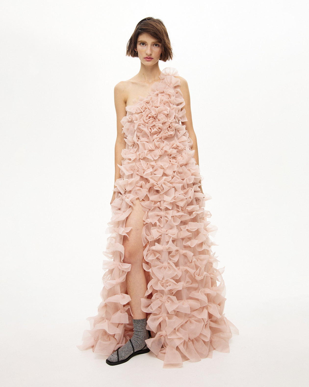 Step into a world of enchantment with the Bowfall one-shoulder dress by PASKAL. This powder-colored gown, adorned with hand-folded bows cascading in a gradient, effortlessly merges romance with edge. The daring high slit and one-shoulder design elevate its modern Cinderella vibe, blending sensitivity with a punk-ish twist.