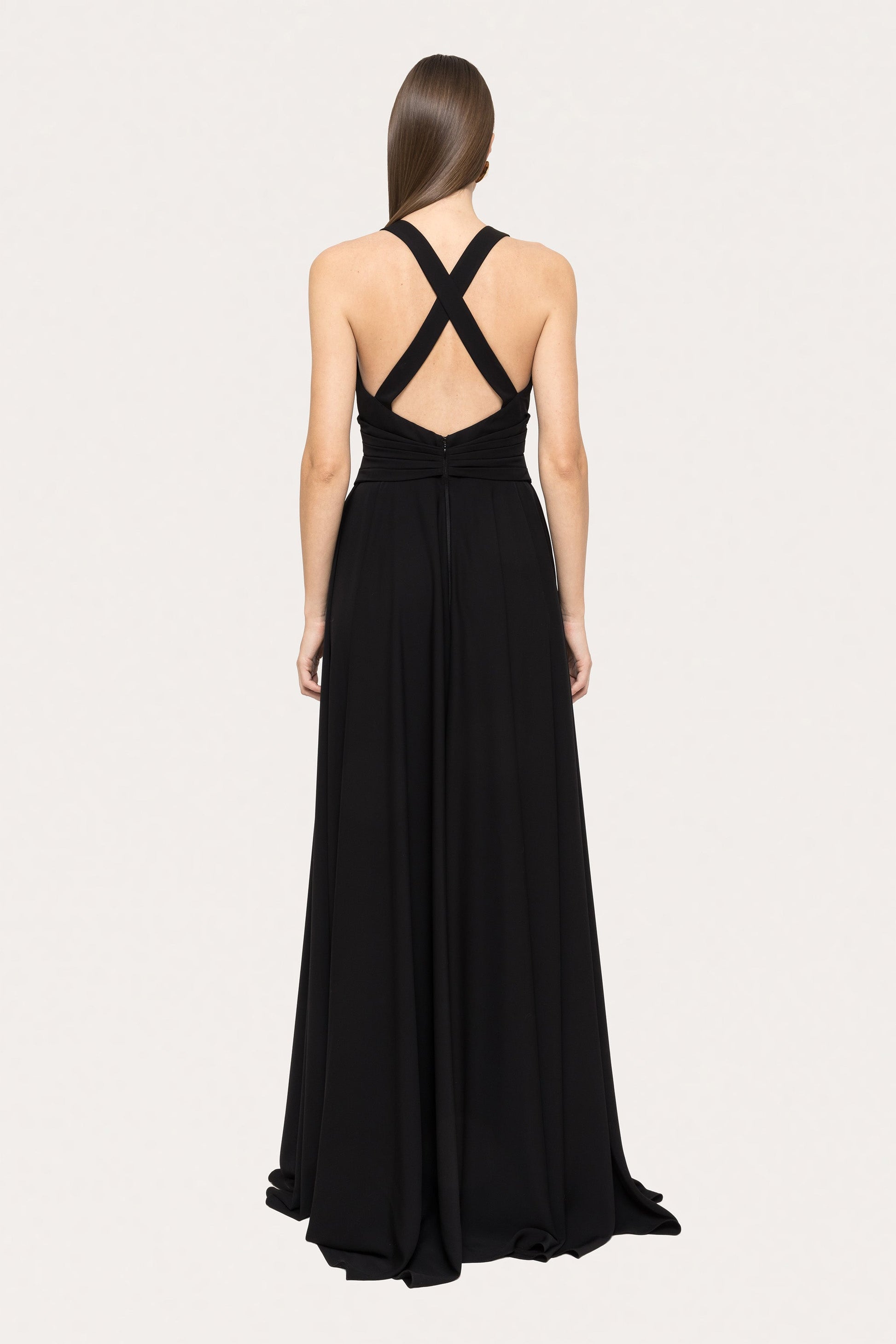 Sophisticated and striking, this black maxi dress with pearl details and an open back is a perfect choice for weddings, baptisms, or elegant evening events.