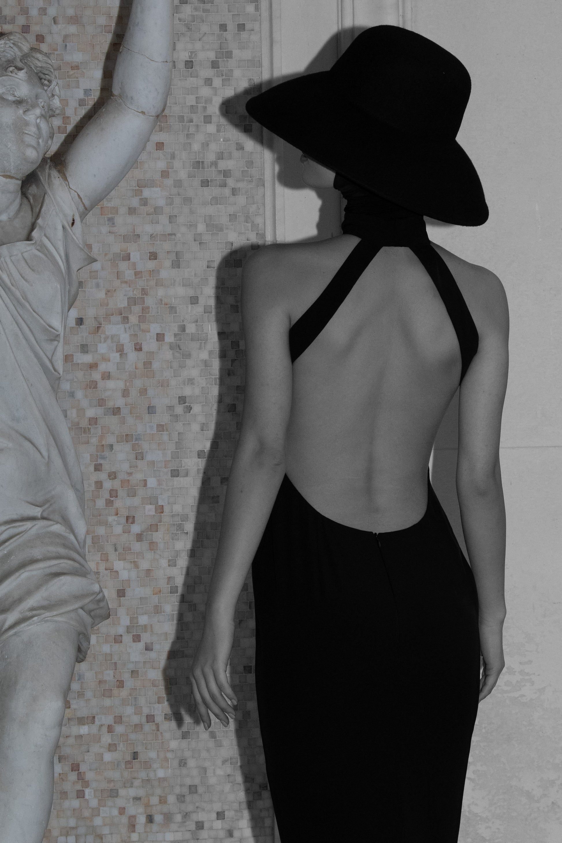 Halter neck midi dress, crafted in crepe fabric, featuring an open back, and a mermaid silhouette.