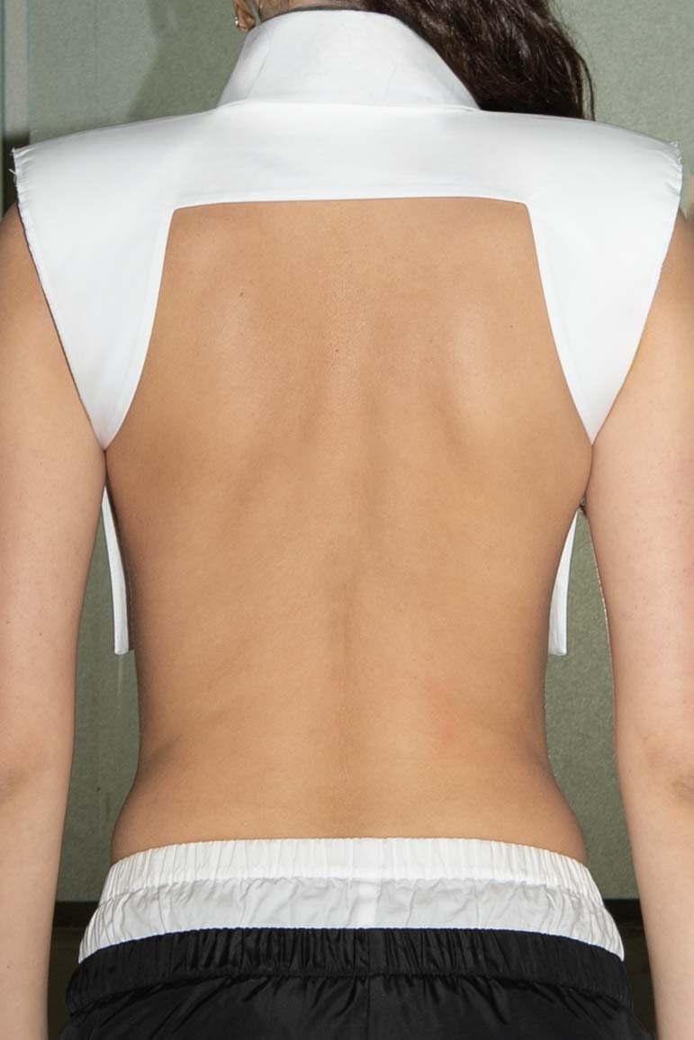 This optical white open-back shirt is crafted from 100% premium cotton, offering a breathable and smooth finish. The design highlights an elegant open back for a contemporary and airy look.