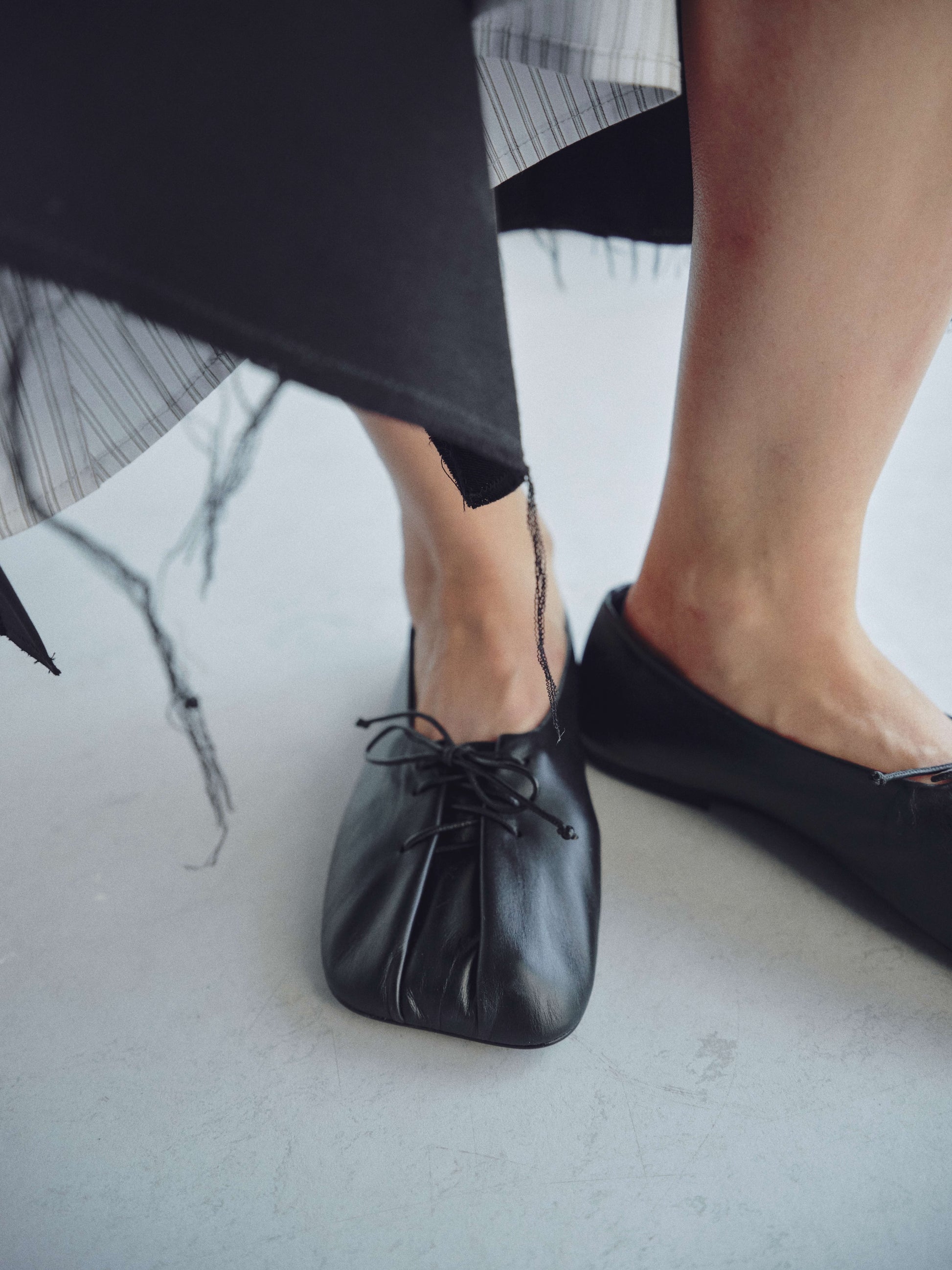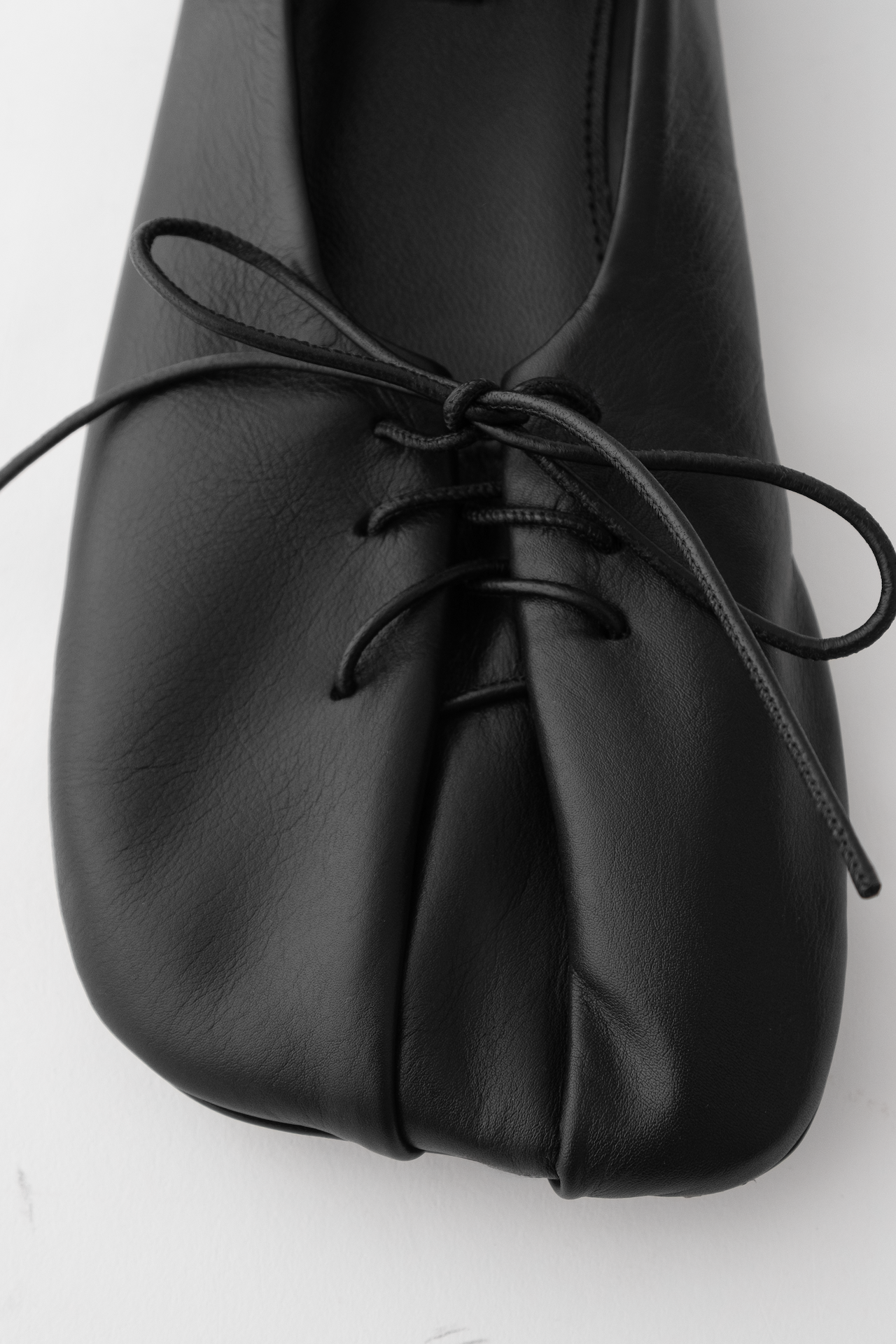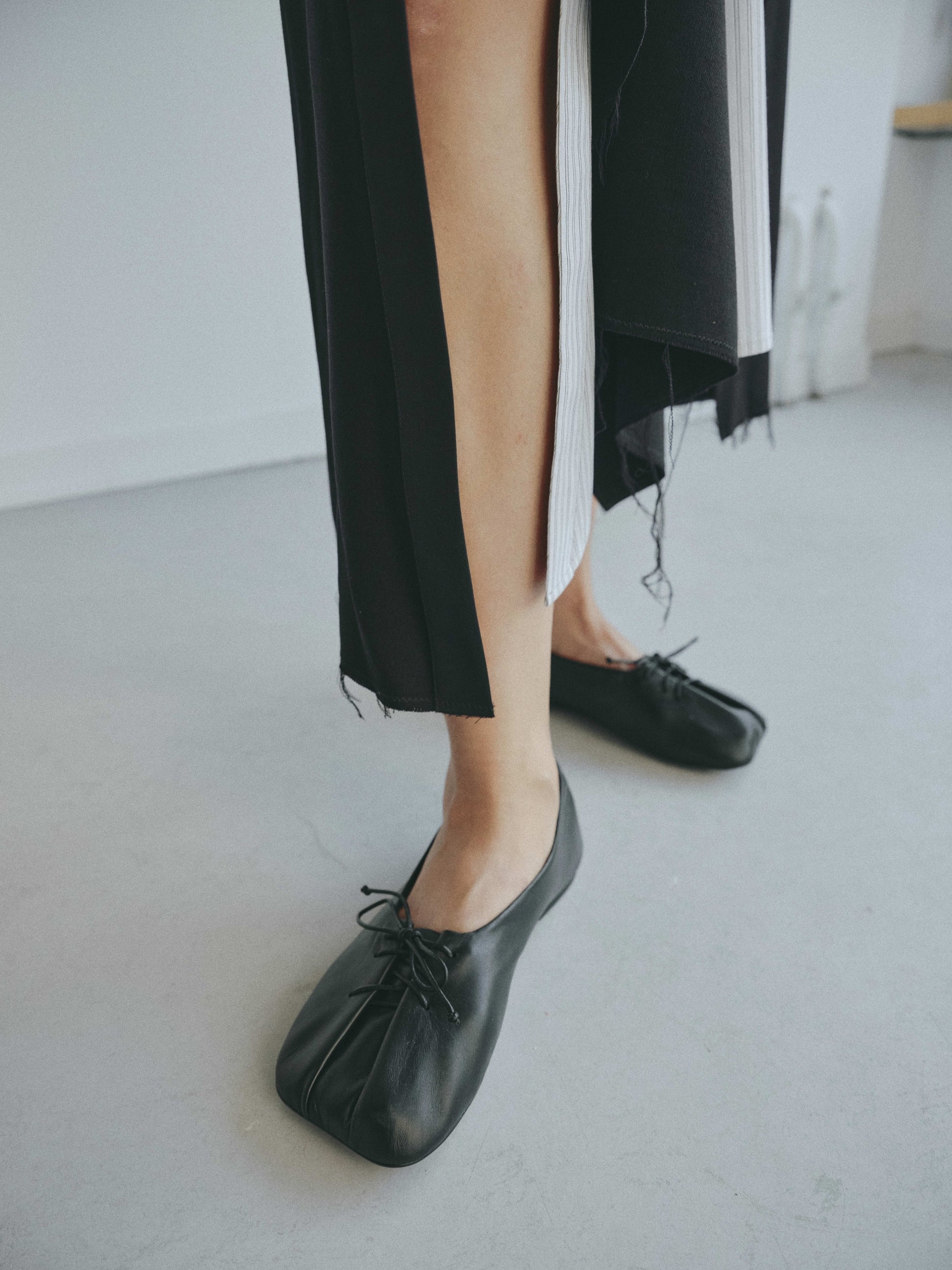 Made of the softest calfskin and lining. They are folded on your foot with a leather cord. The cord also regulates the fullness of the ballet flats, which is why they are suitable for any height and foot width.