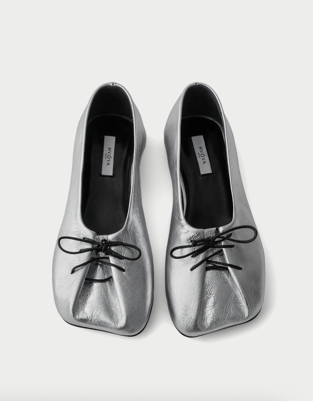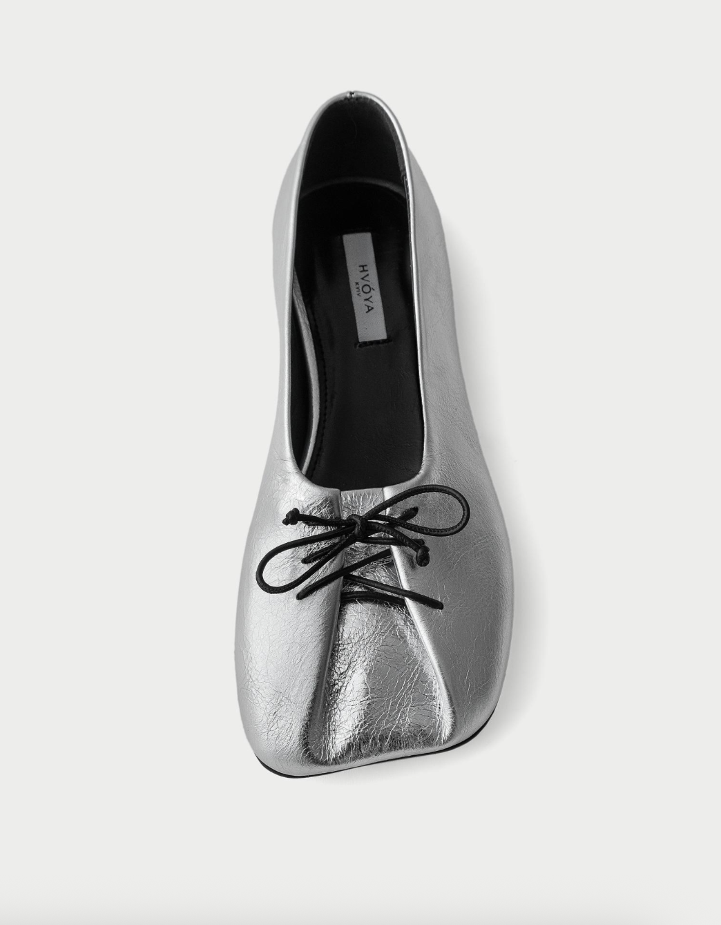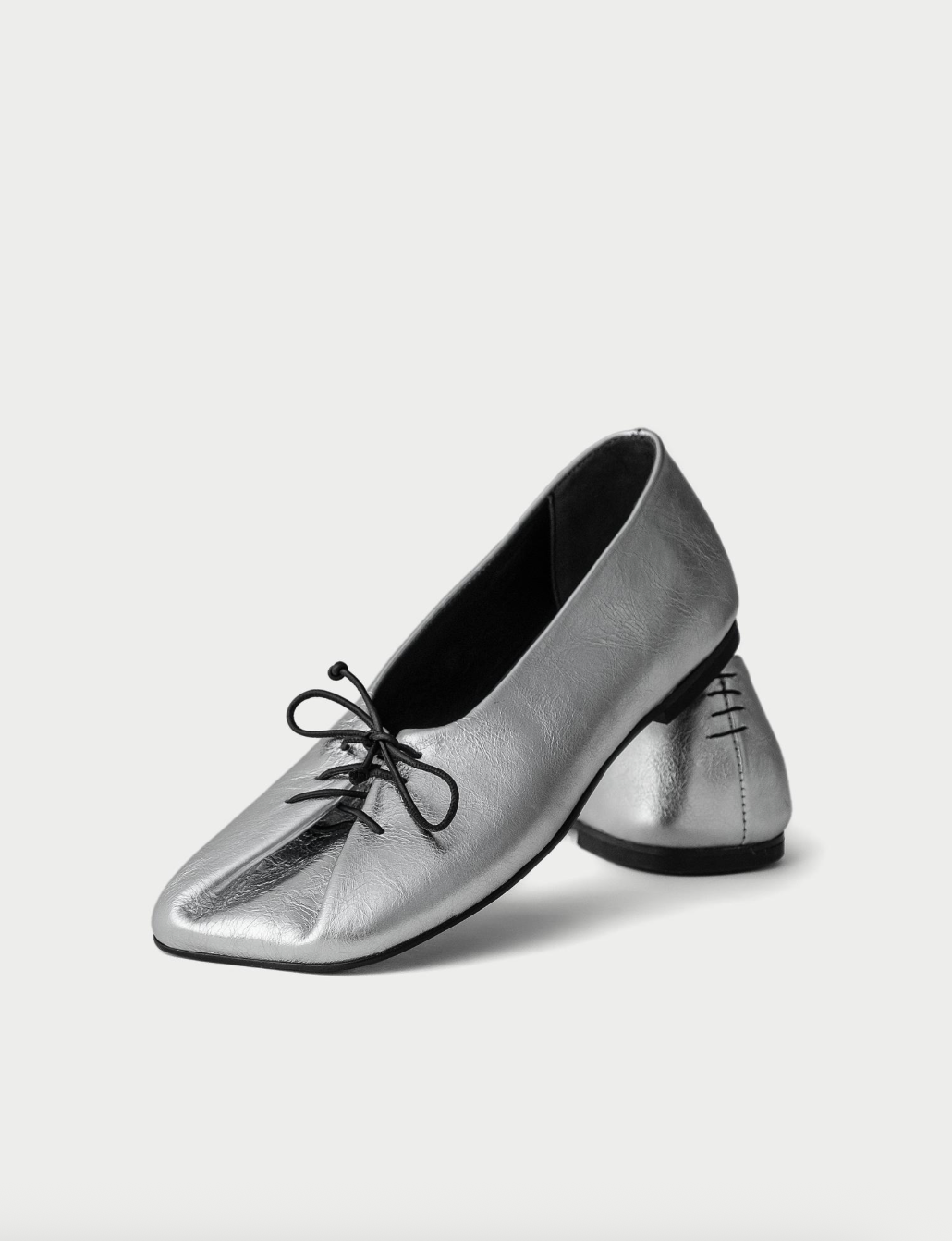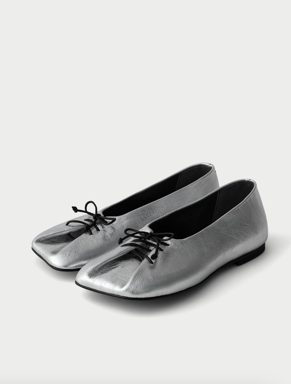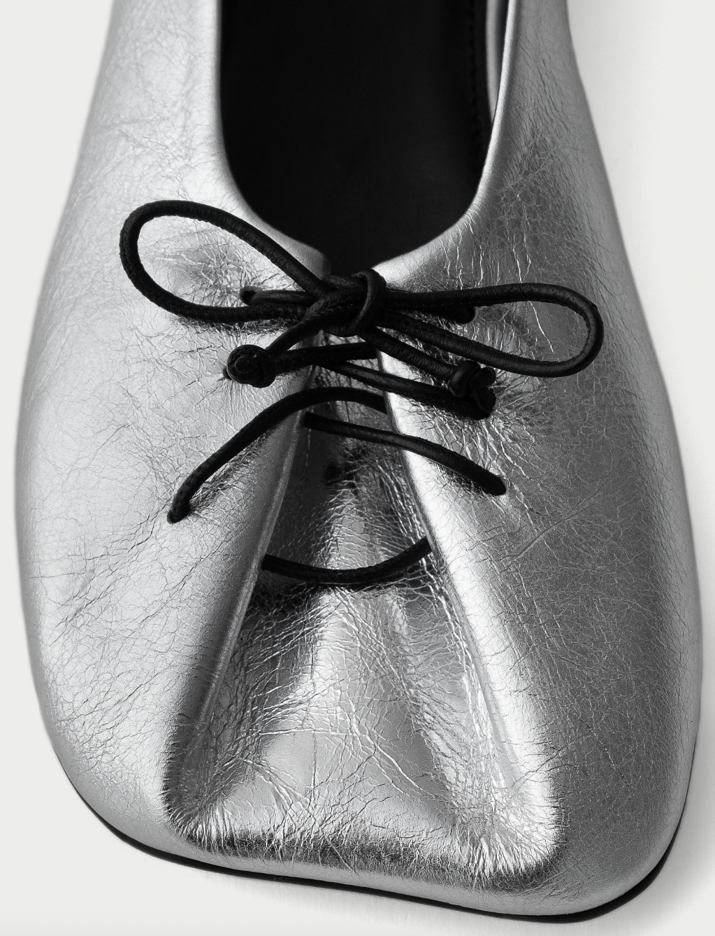 Silver ballet flats made of calf leather with a delicate texture and a statement square toe. Adjustable lacing allows for a customized fit to any foot width. The model features a soft leather lining for all-day comfort and natural breathability.