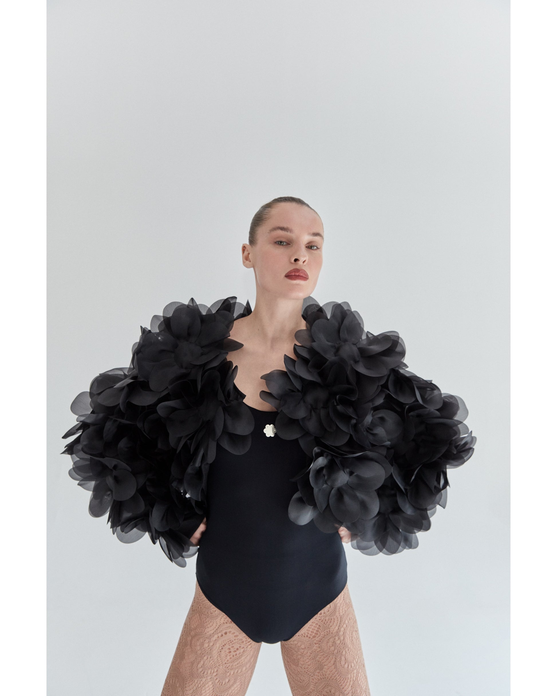 An organza bomber jacket is embellished with 3D peony flowers that reveal the beauty of feminine nature. 630 petals are crafted using PASKAL’s signature laser-cut technique and carefully arranged by hand, shaping a piece with a couture character.