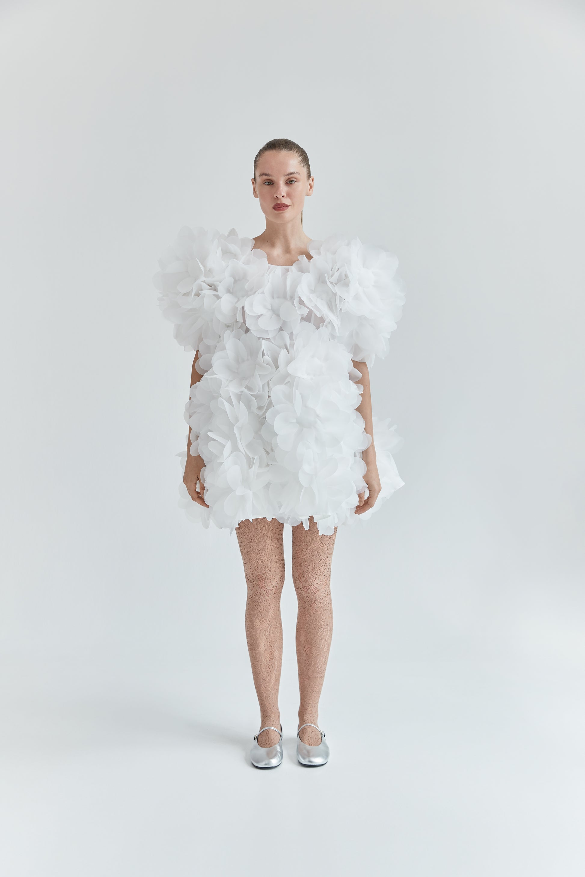 An organza dress is embellished with 3D peony flowers that reveal the beauty of feminine nature. 1,260 petals are crafted using PASKAL’s signature laser-cut technique and carefully arranged by hand, shaping a piece with a couture character. The PASKAL Peony dress brings softness and ultra-femininity to outfits for special occasions, parties, or those moments when you simply feel like blooming.