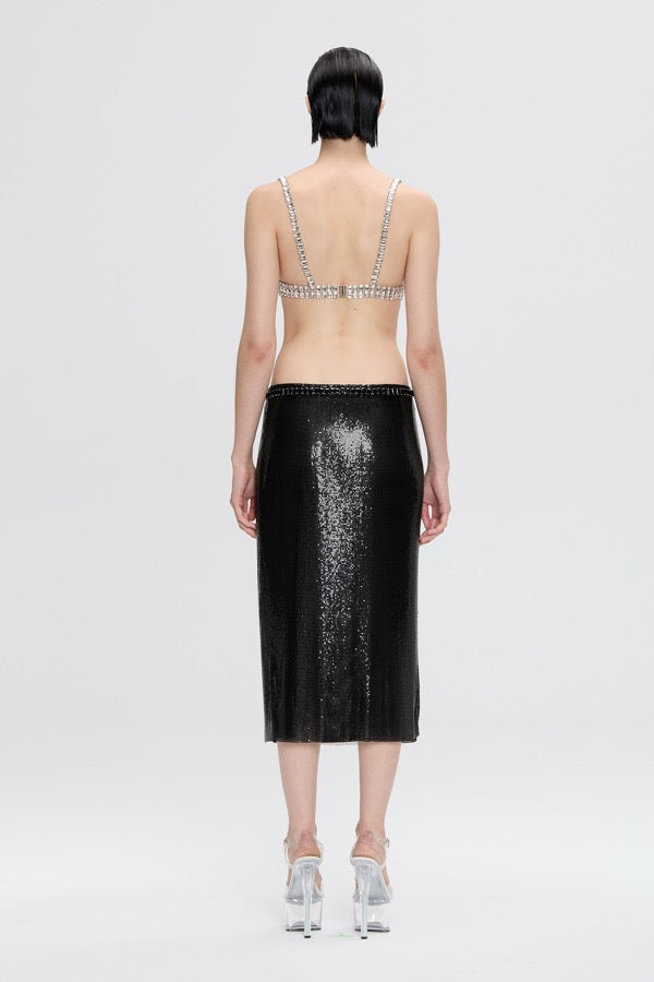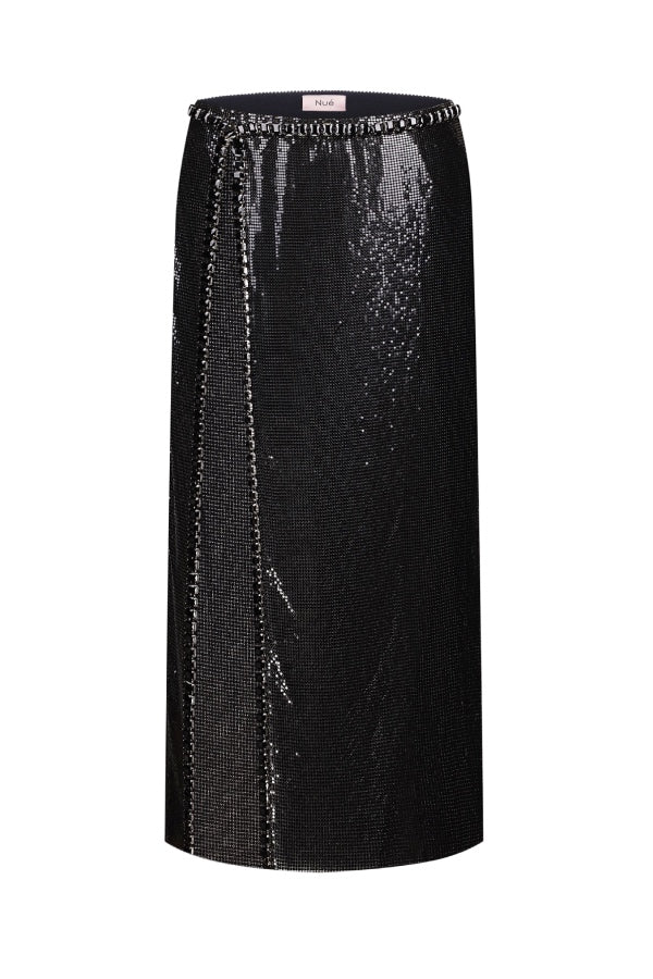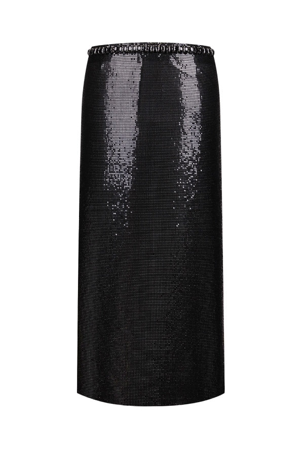 A midi skirt with a figure-skimming fit and a low-rise waist. It is made from lustrous black metal mesh with a mild mirrorball- like shine. The skirt features a high front slit with mesh and is embellished with rhinestones at the waist and along the edges of the slit.
