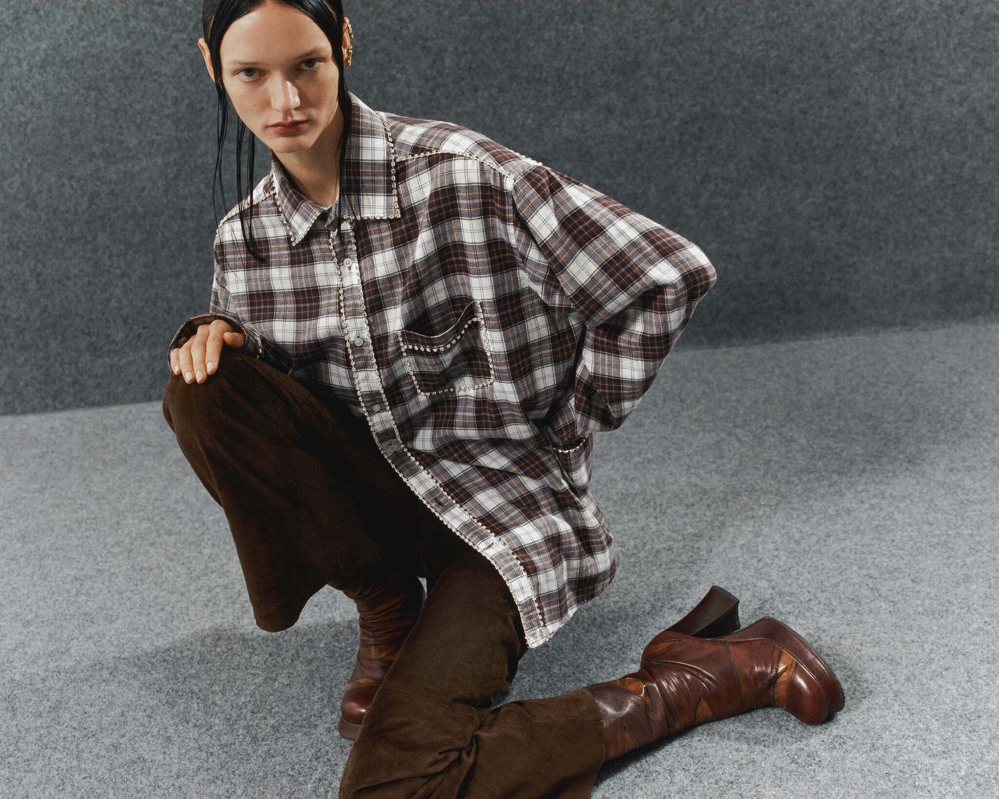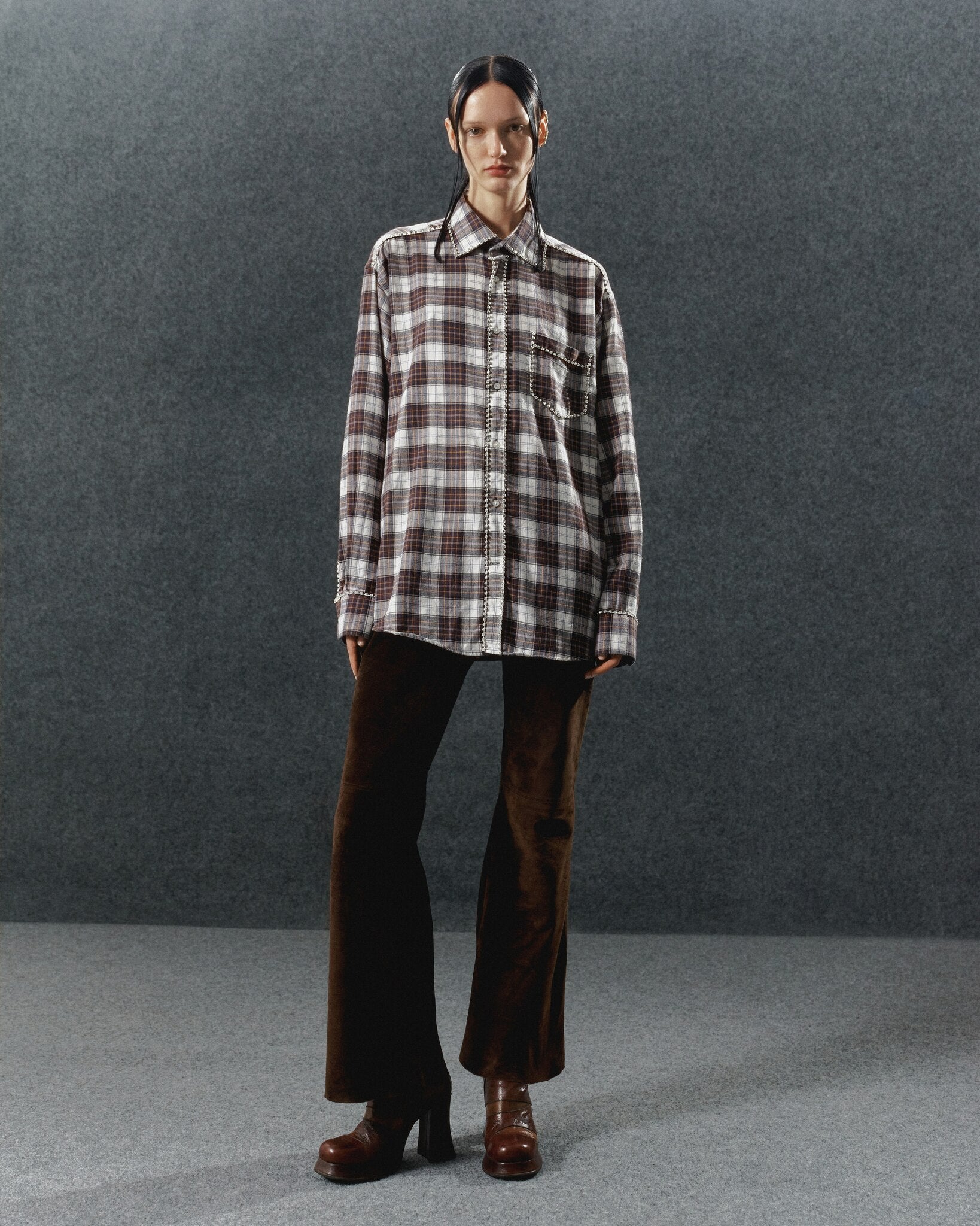 Introducing the REDESIGNED SHIRT 129 OMELIA, a luxurious shirt hand-decorated with large rhinestone crystal chains. These exquisite designs features crystals on the front pocket, cuffs, shoulder seam, collar, button placket, and back yoke, elevating the classic shirt into a statement piece of glamour.