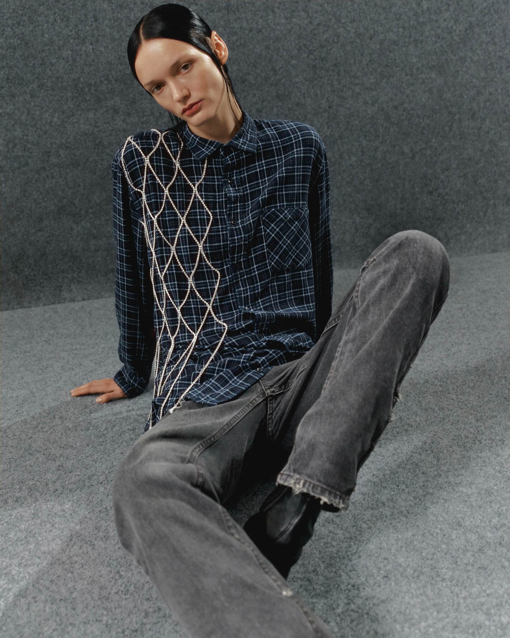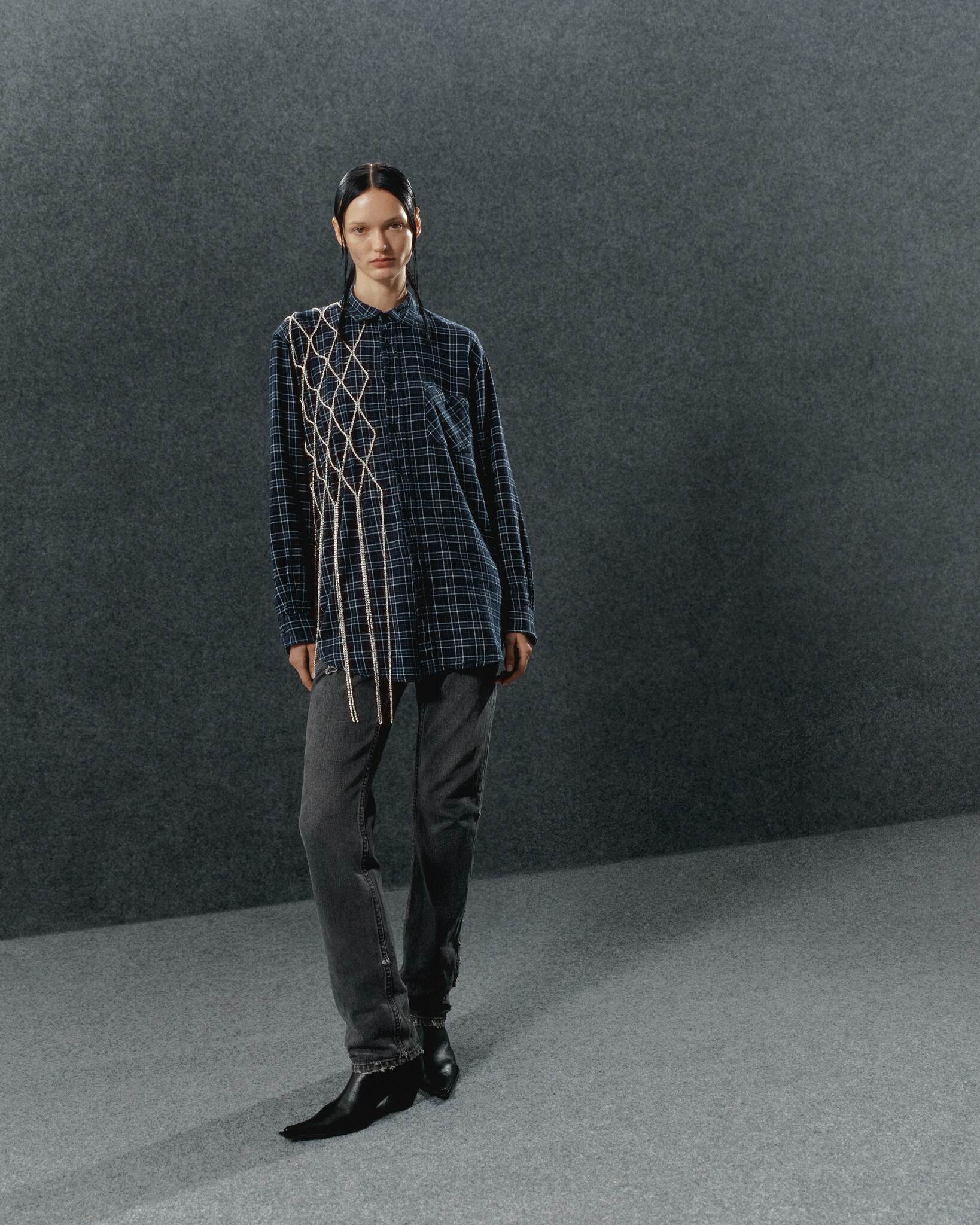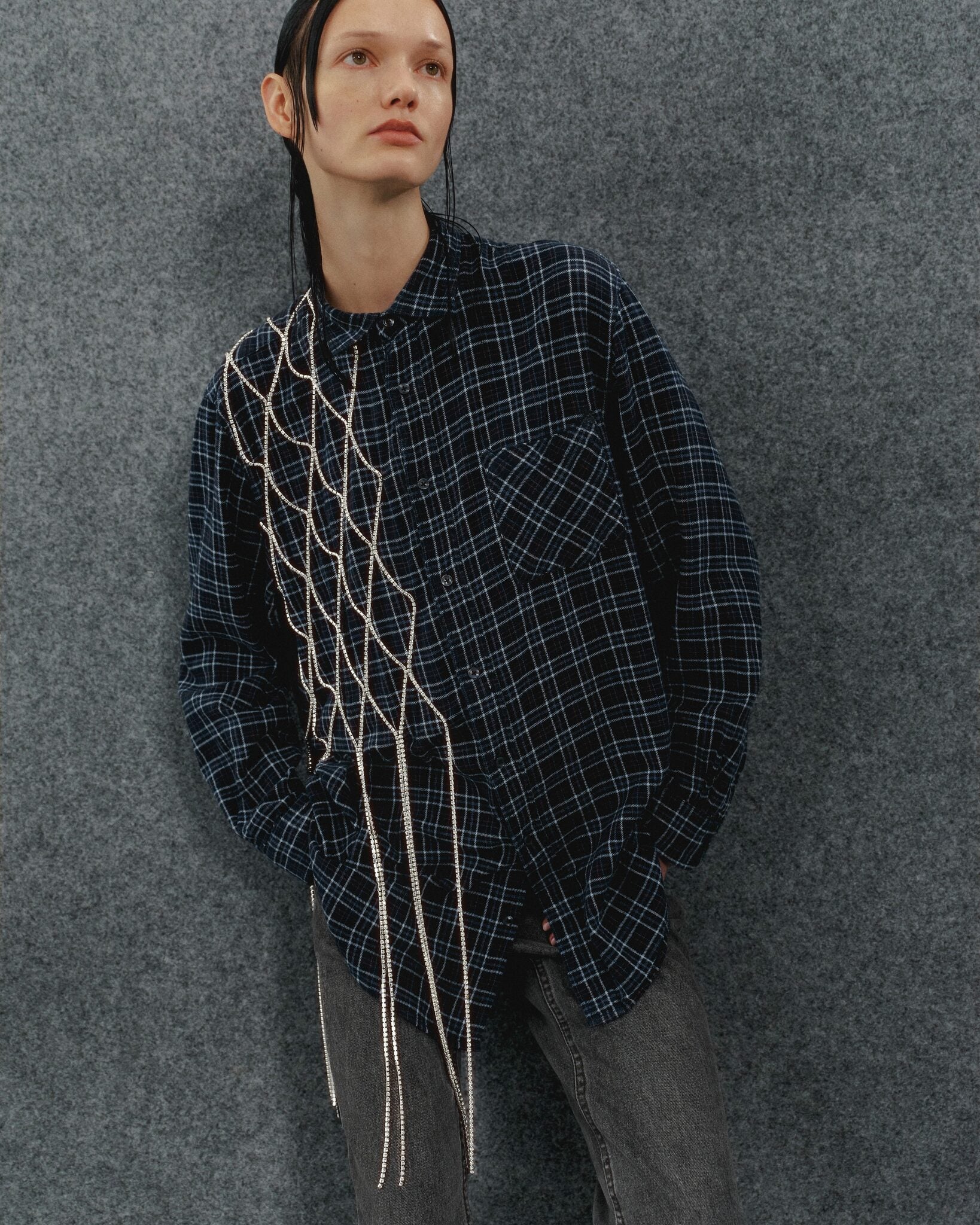 Introducing the REDESIGNED SHIRT 130 OMELIA, a captivating fusion of elegance and modern flair. Partly hand-embroidered with a stunning rhinestone crystal chain in a diamond mesh pattern, this shirt is further enhanced with long chain fringe that adds movement and a touch of drama to your look.
