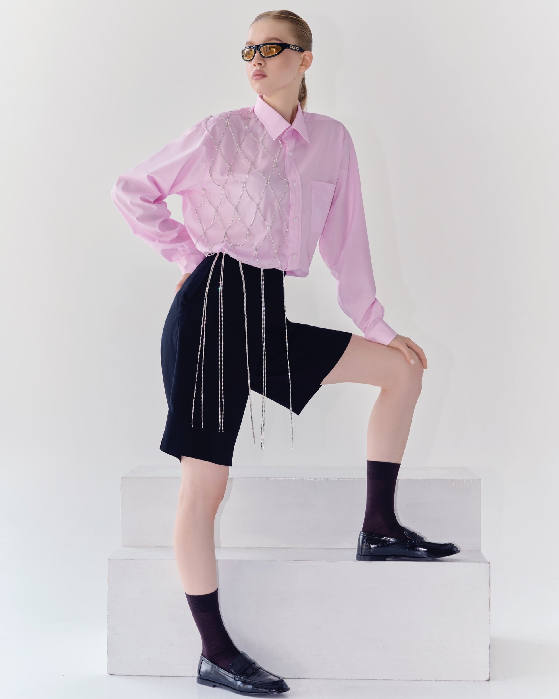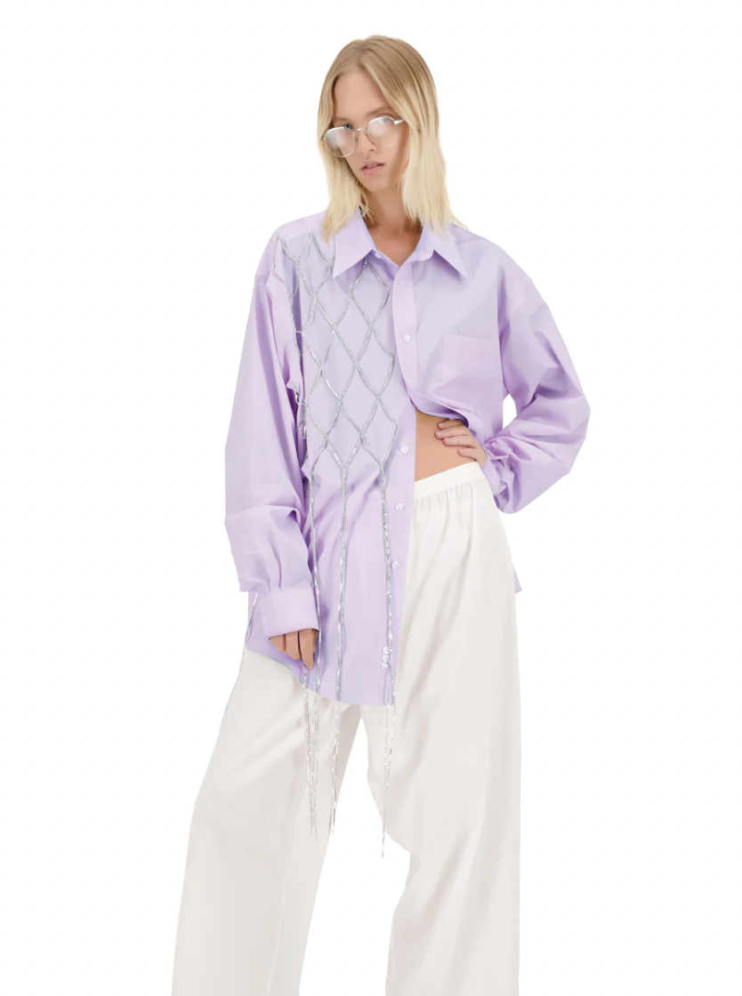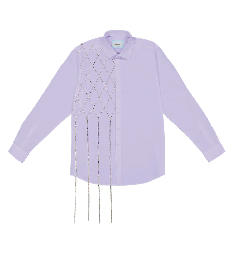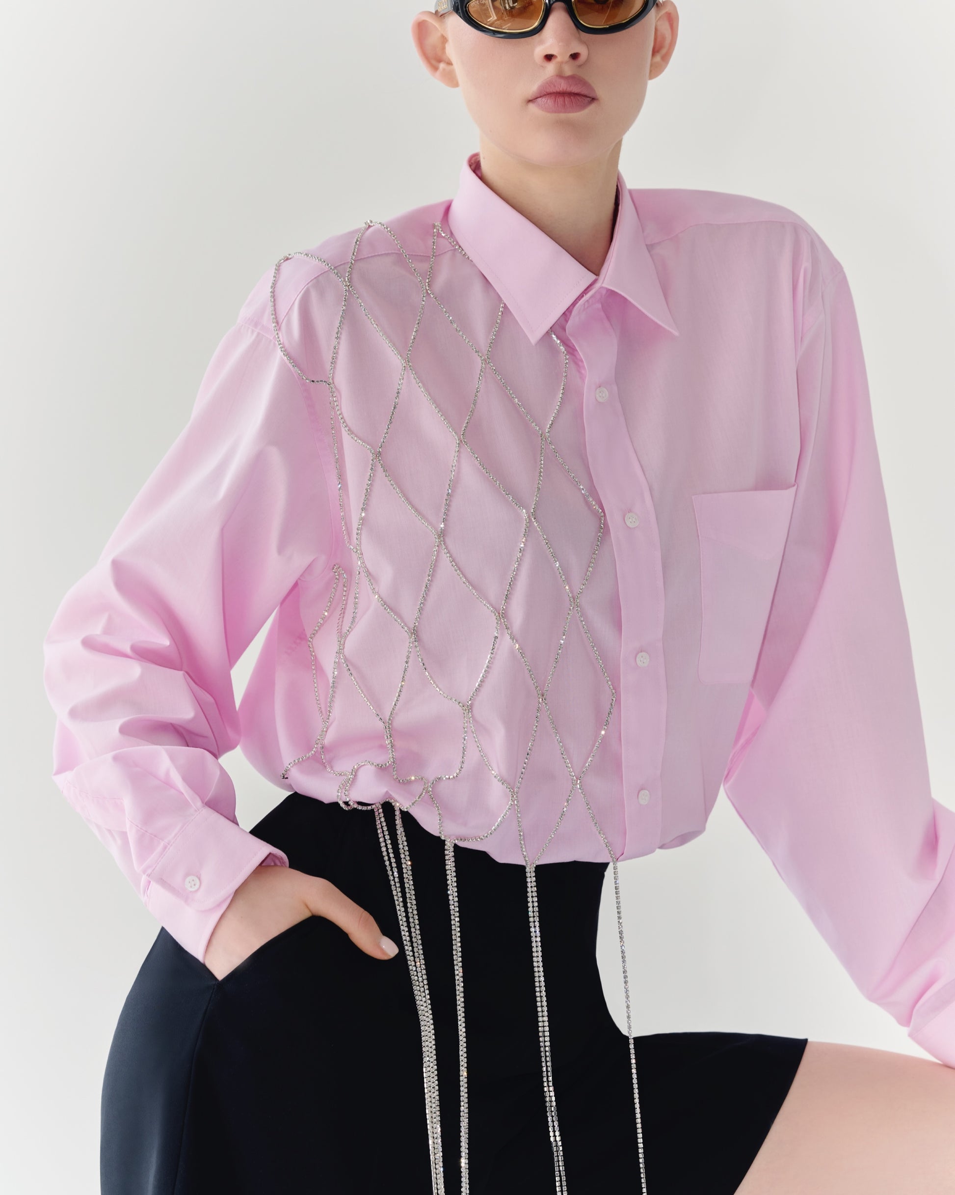 Shirt hand-embroidered with rhinestone crystal chain in a diamond mesh pattern