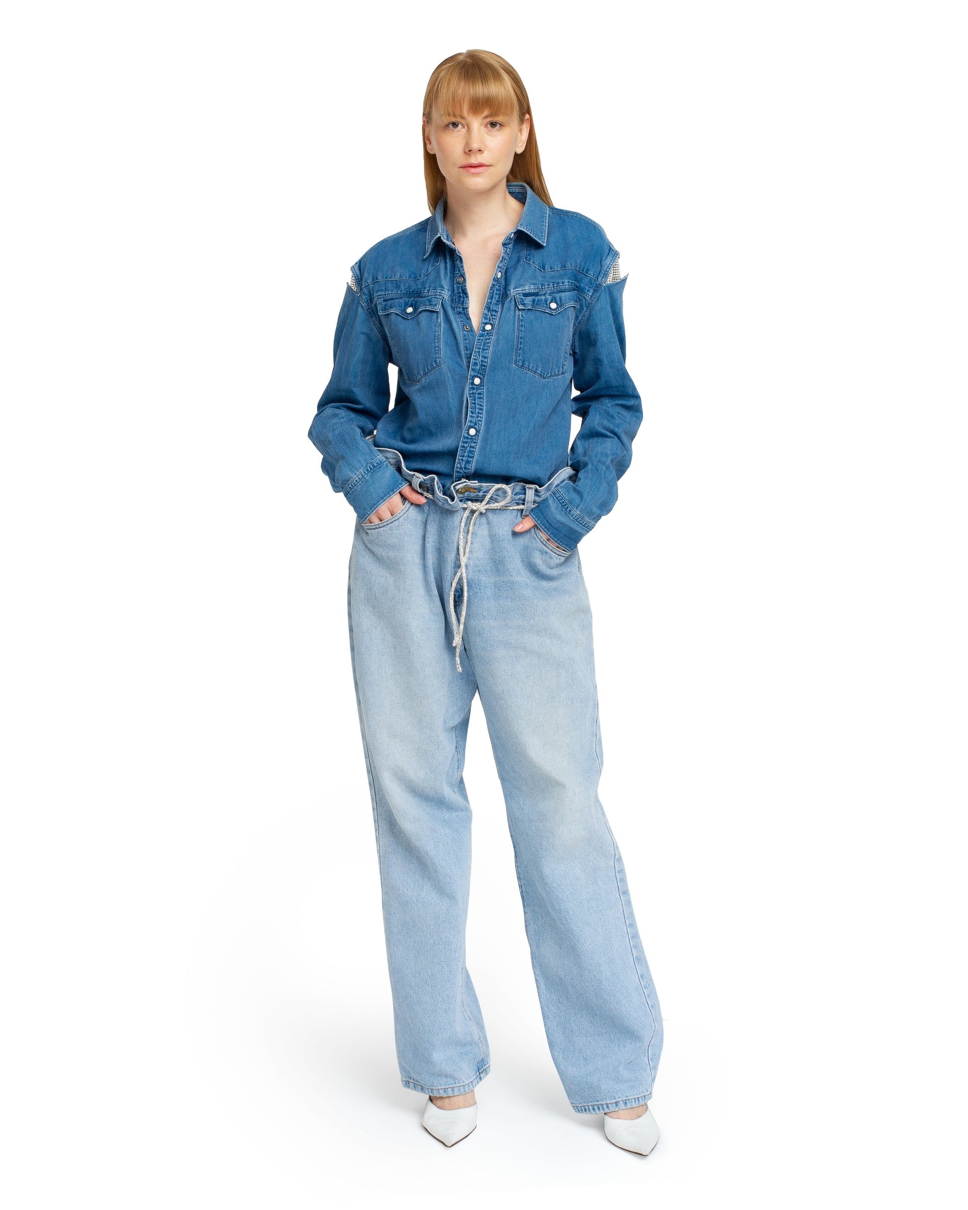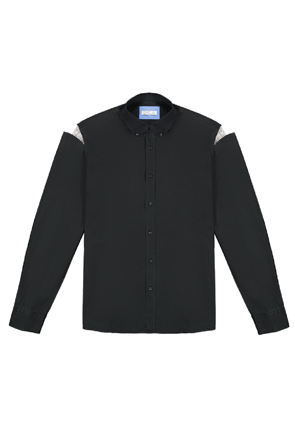 Embrace bold elegance with this shirt featuring striking crystal chain armour inserts on the shoulders, blending strength and sophistication in one unique design.
