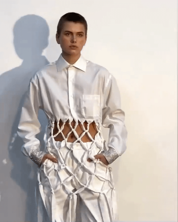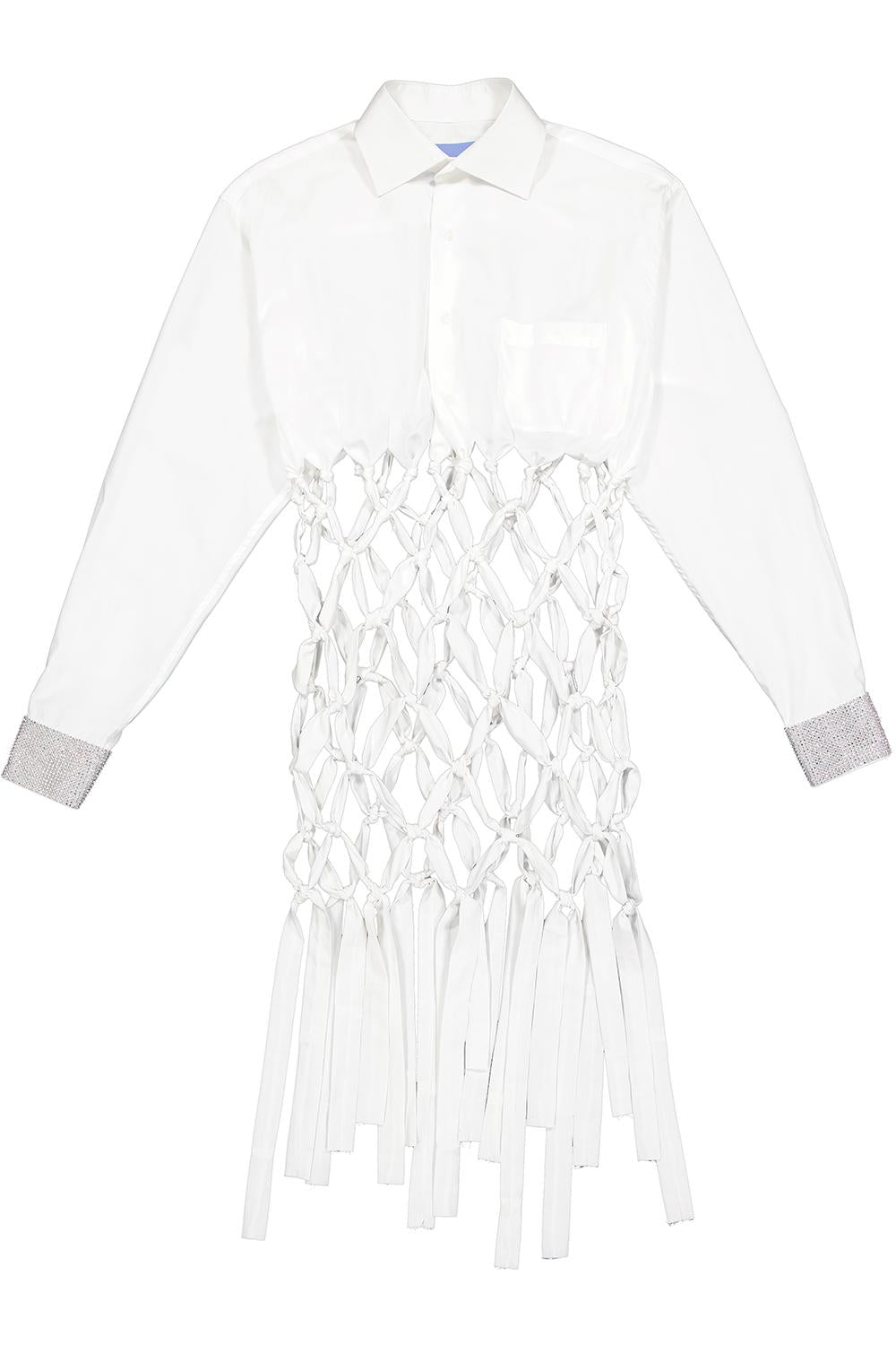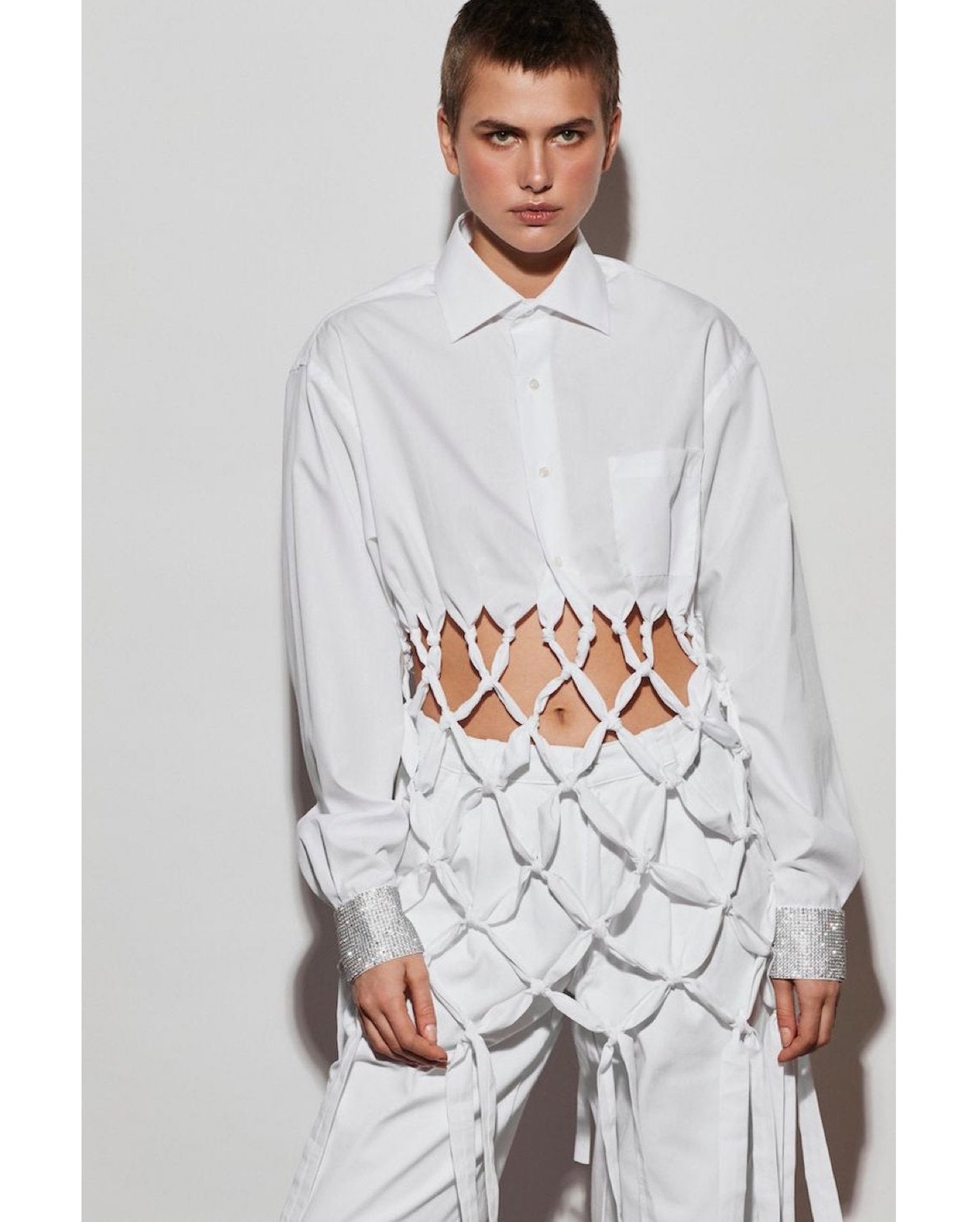 Introducing the REDESIGNED SHIRT 25 W OMELIA, a beautifully hand-woven shirt featuring a diamond mesh pattern and crystal chain banding on the cuffs for a touch of elegance and sparkle.