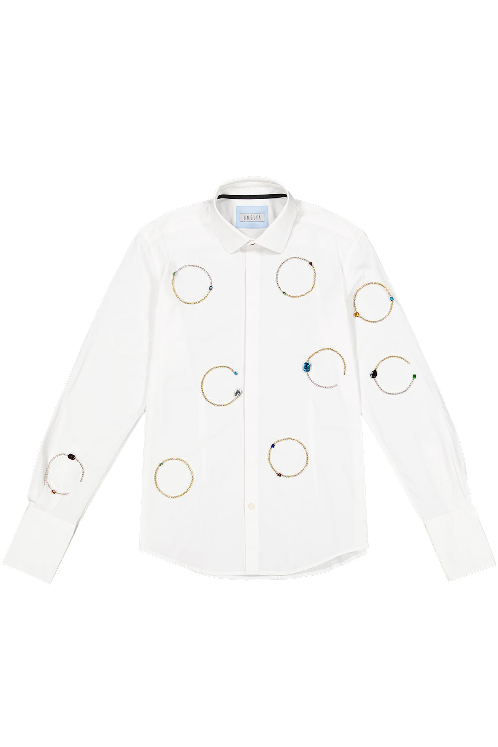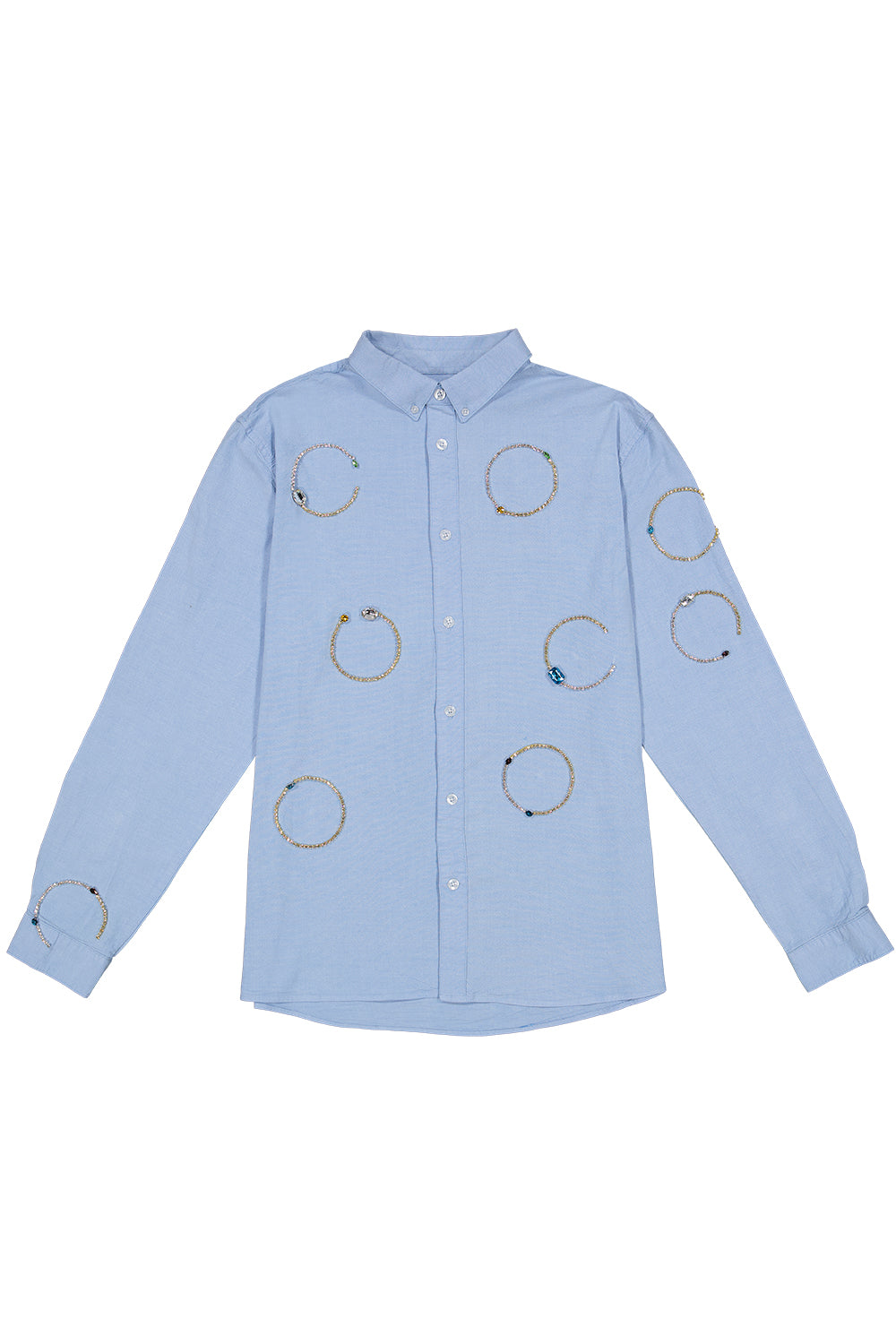 The shirt hand-decorated with circles of rhinestone strass chain with addition of colored crystals