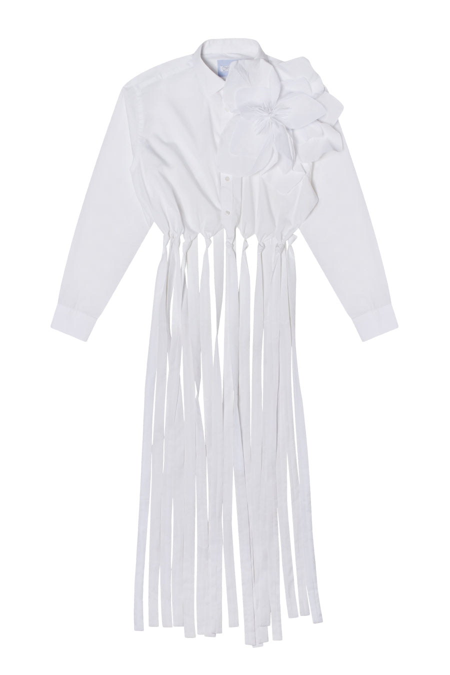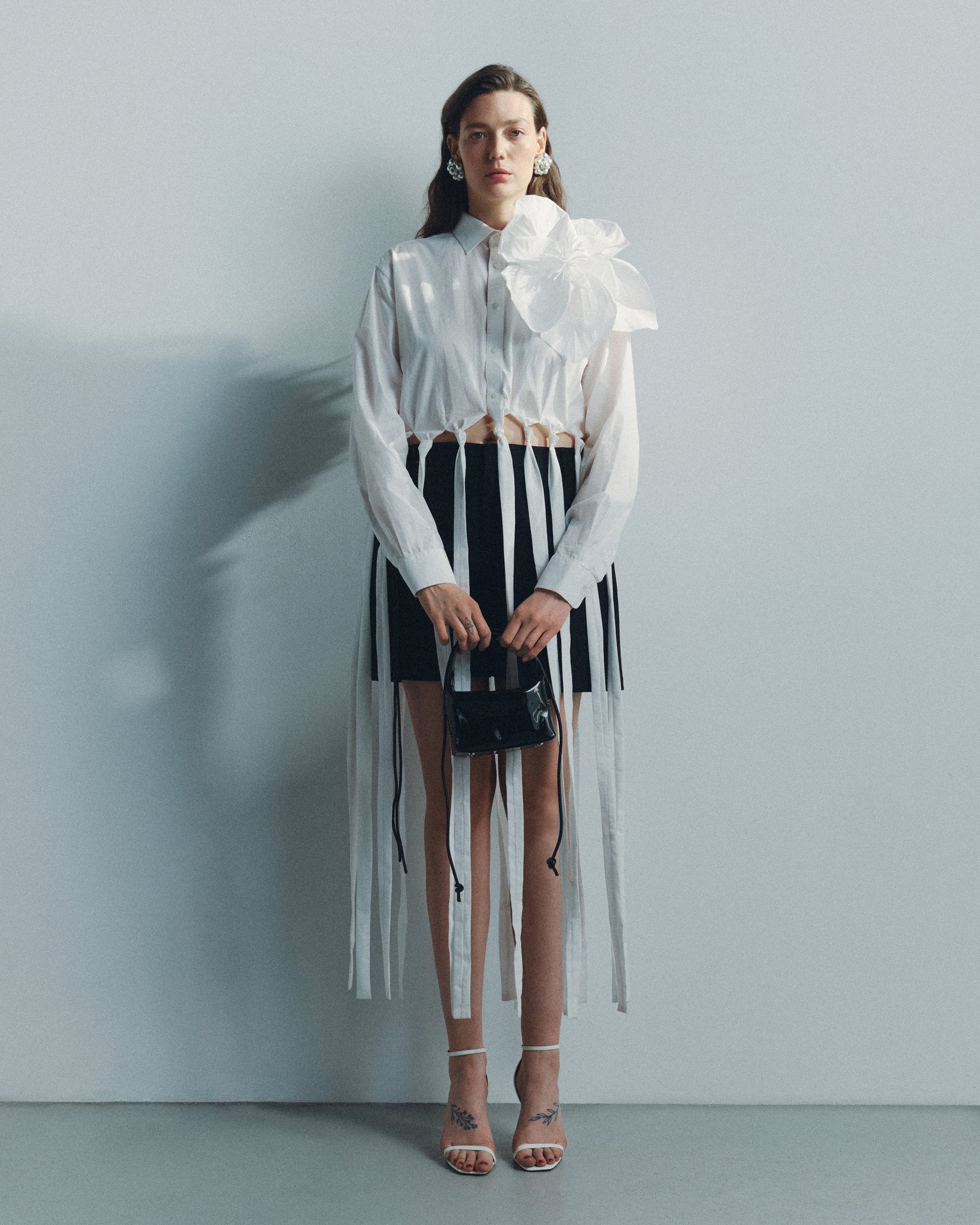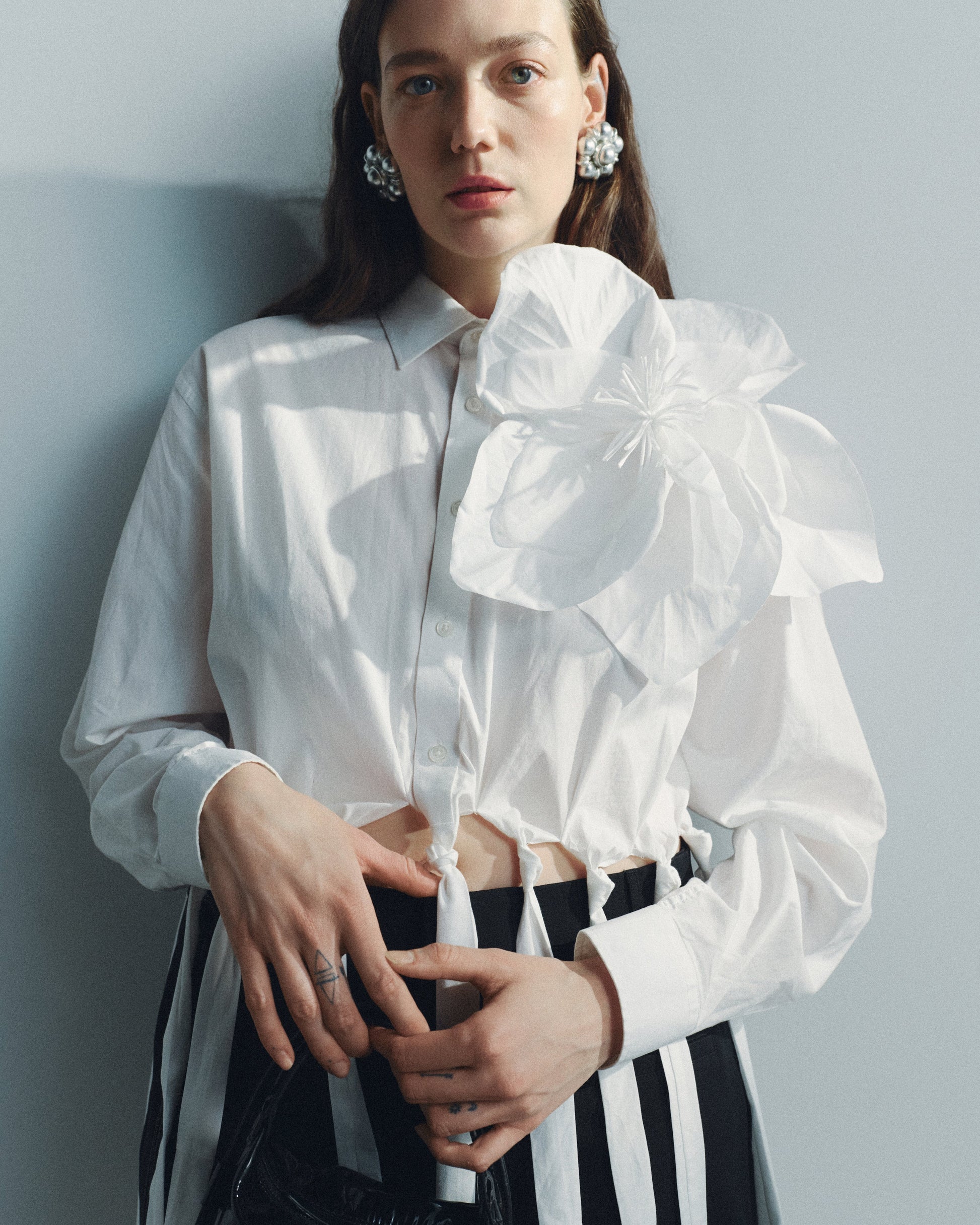 Introducing the REDESIGNED SHIRT 80 W OMELIA, a cropped shirt with a distinctive design featuring elegant ribbons and a handmade flower decoration. This unique piece combines creativity and style, offering a fashionable, versatile option for every wardrobe.